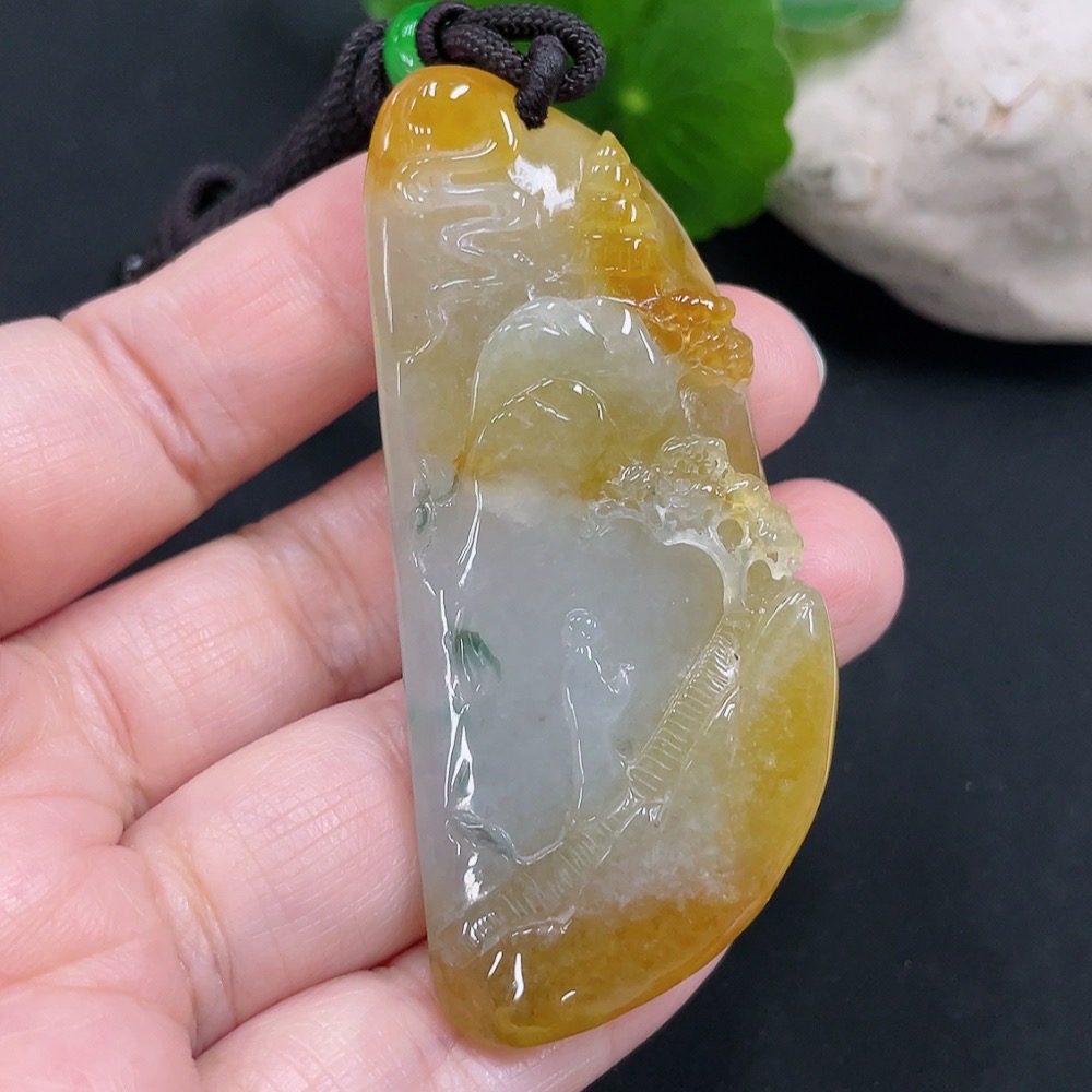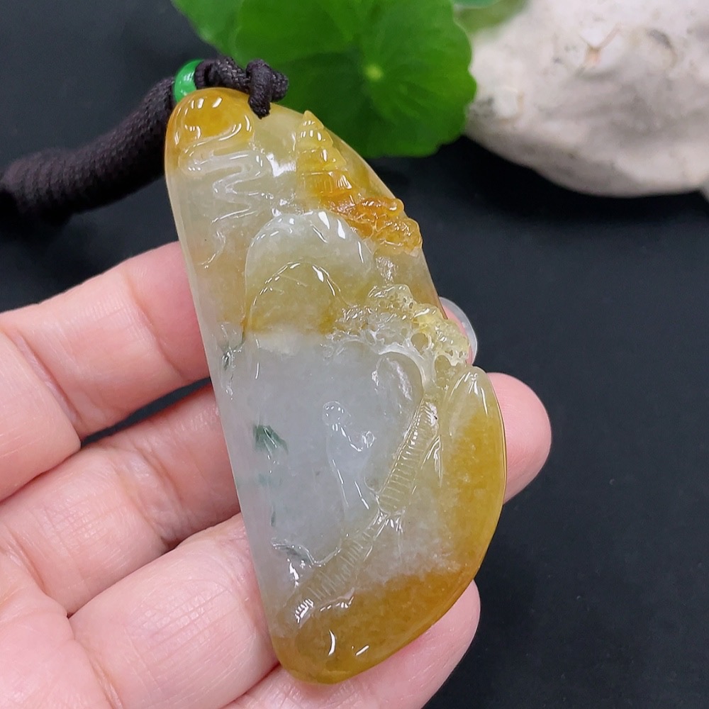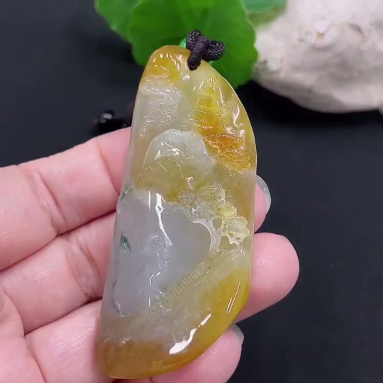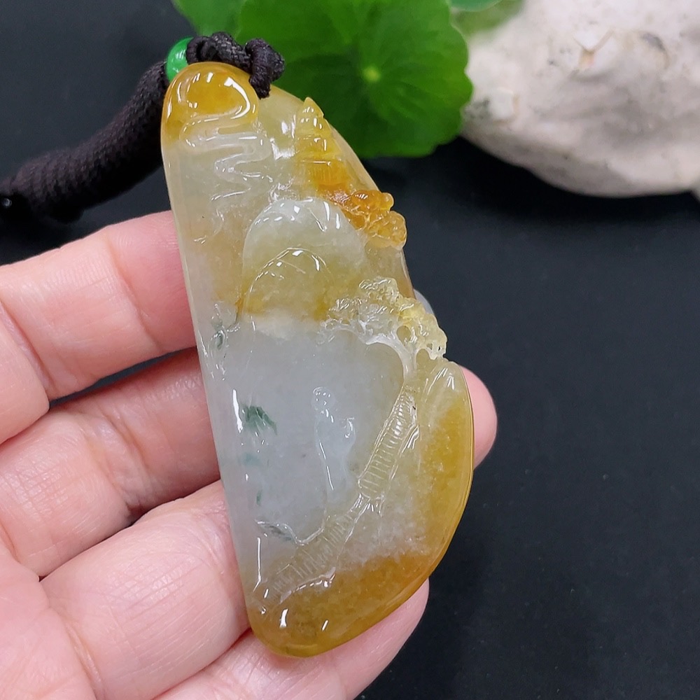 Jadeite landscape plaque pendant, total weight approx. 34.4g (including cord weight) (color origin undetermined)