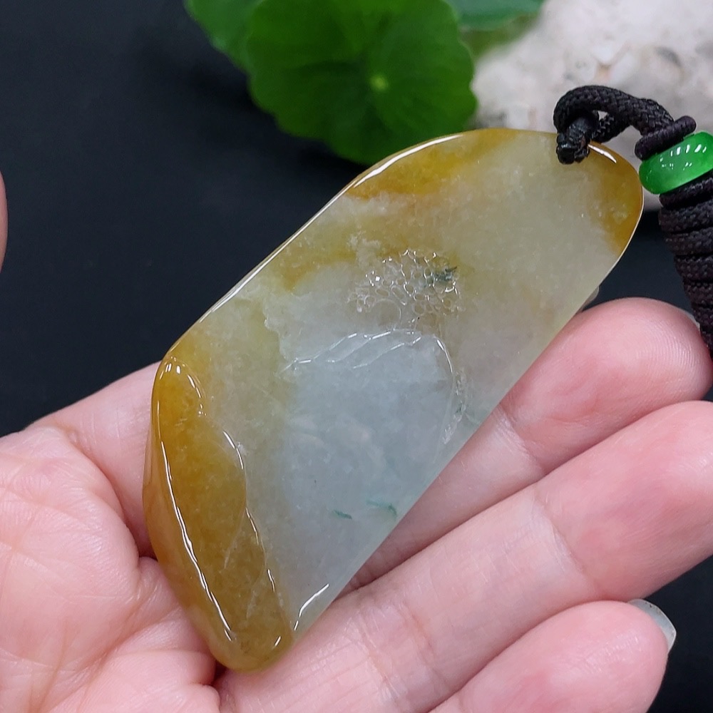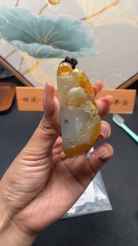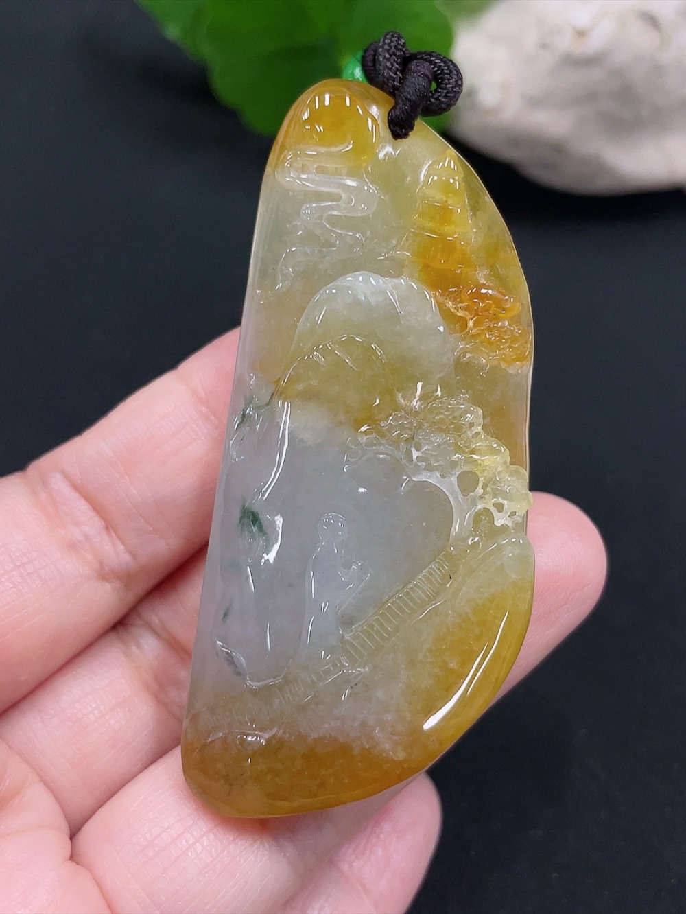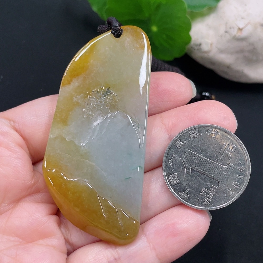 Jadeite landscape plaque pendant, total weight approx. 34.4g (including cord weight) (color origin undetermined)
