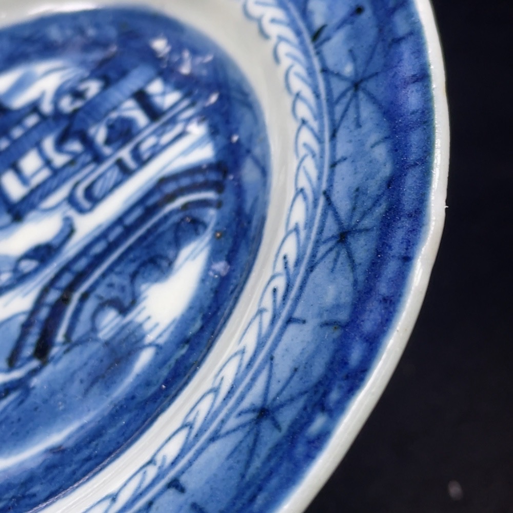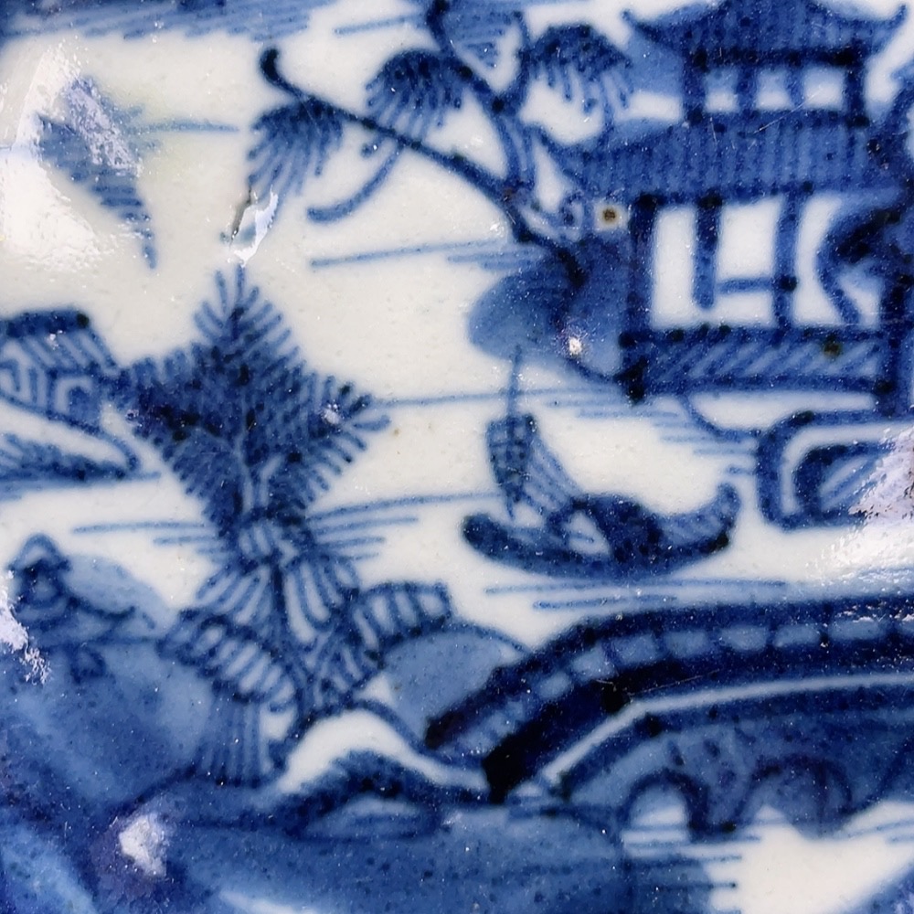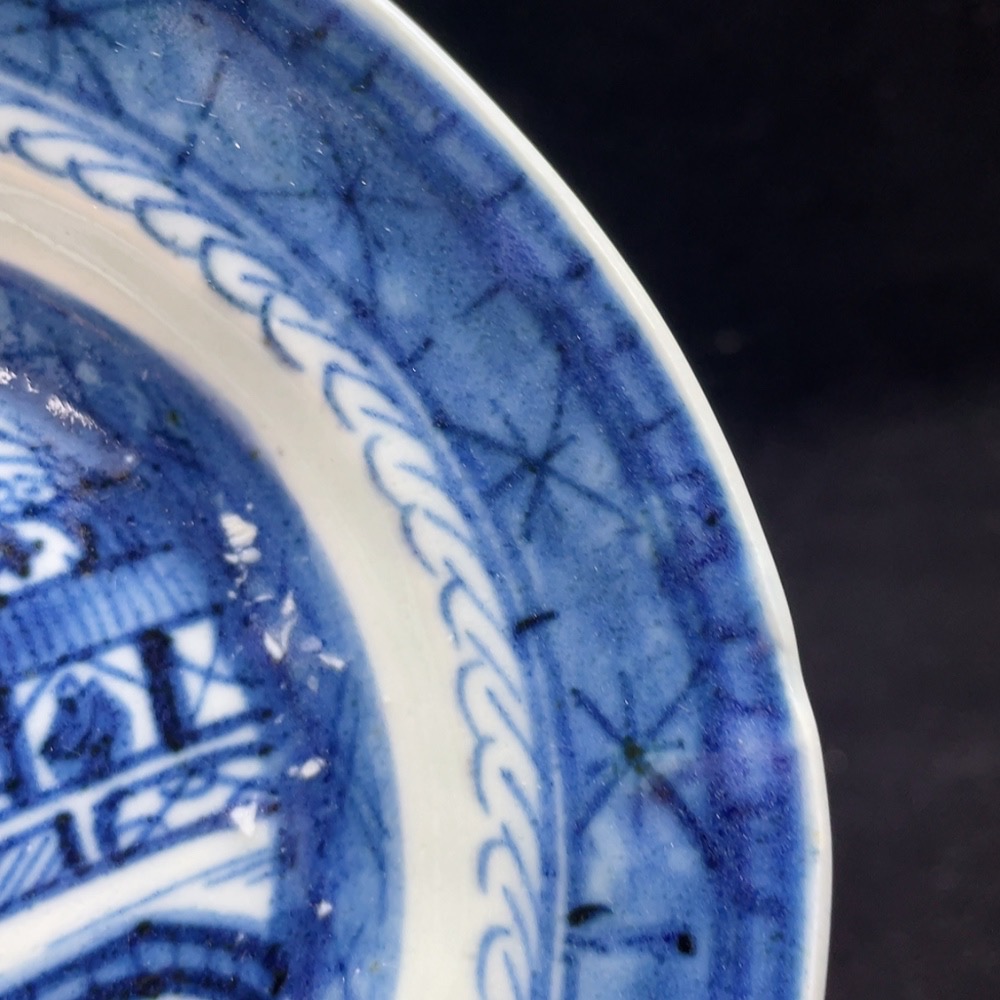 Ceramic, minor chip, mid-Qing blue-and-white pavilion and terrace plate, size as per actual item