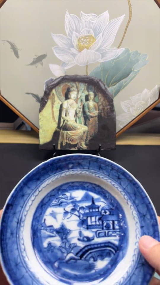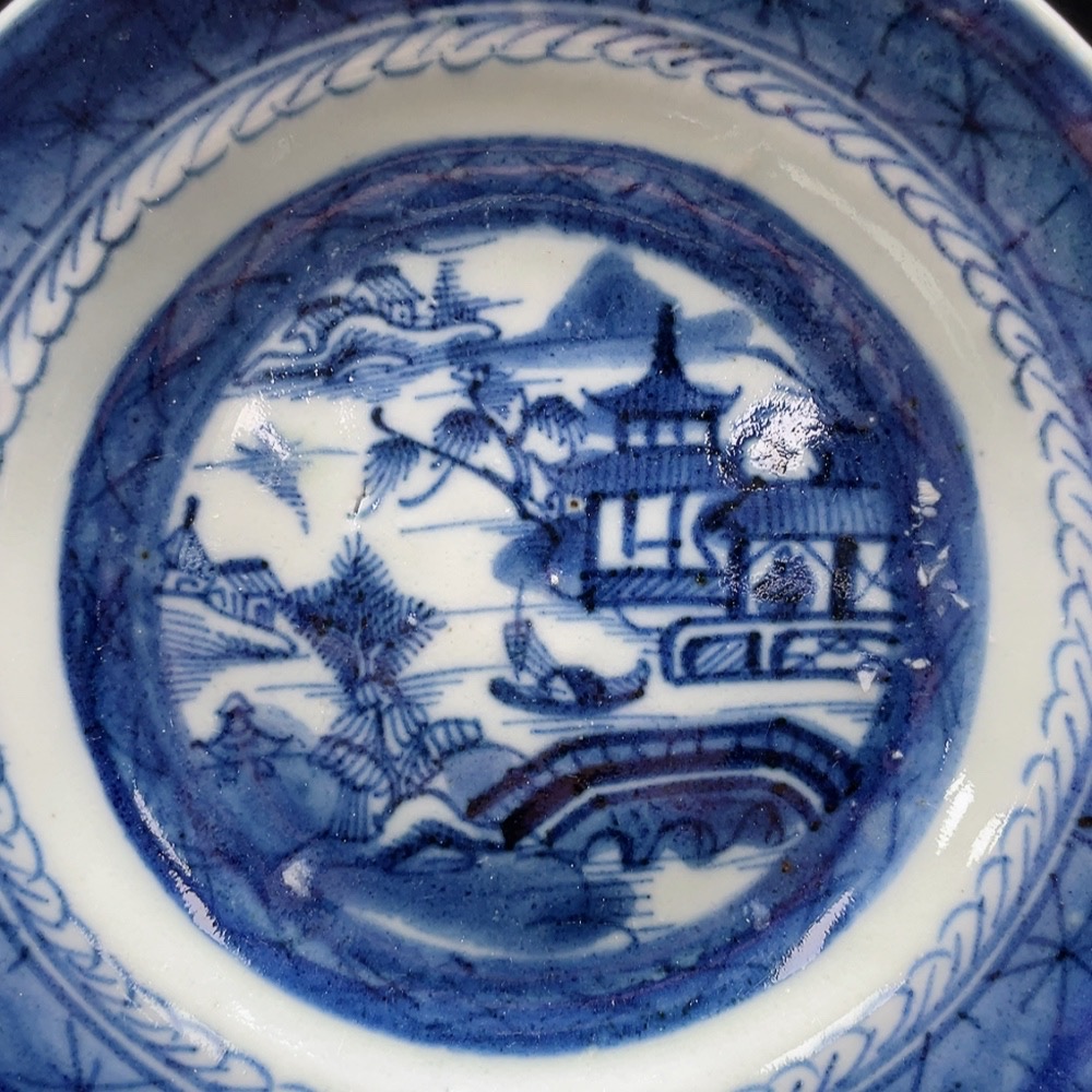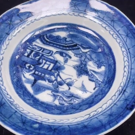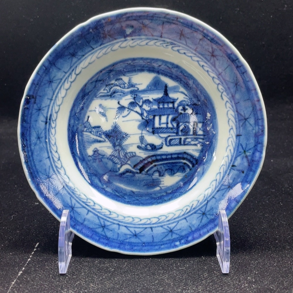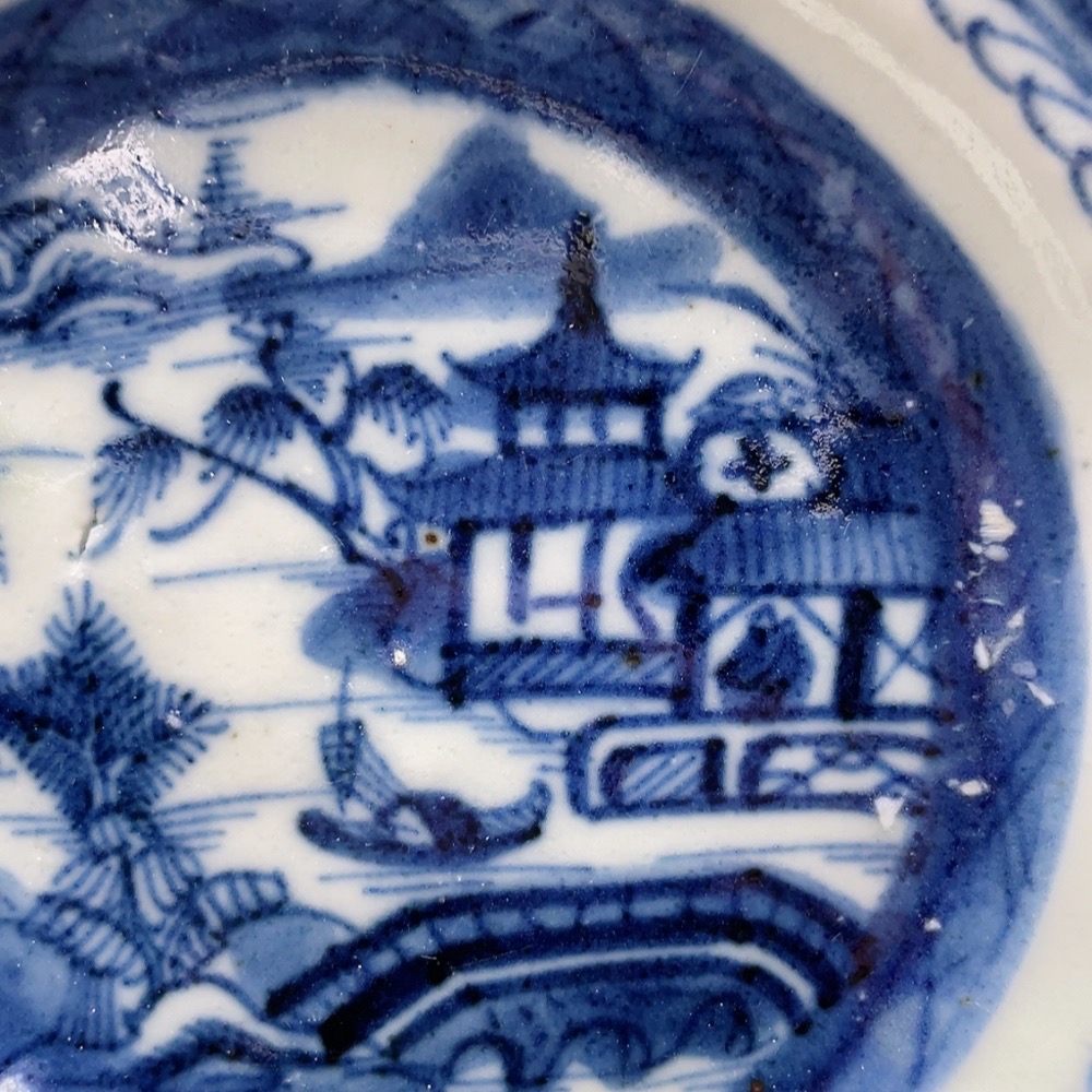 Ceramic, minor chip, mid-Qing blue-and-white pavilion and terrace plate, size as per actual item