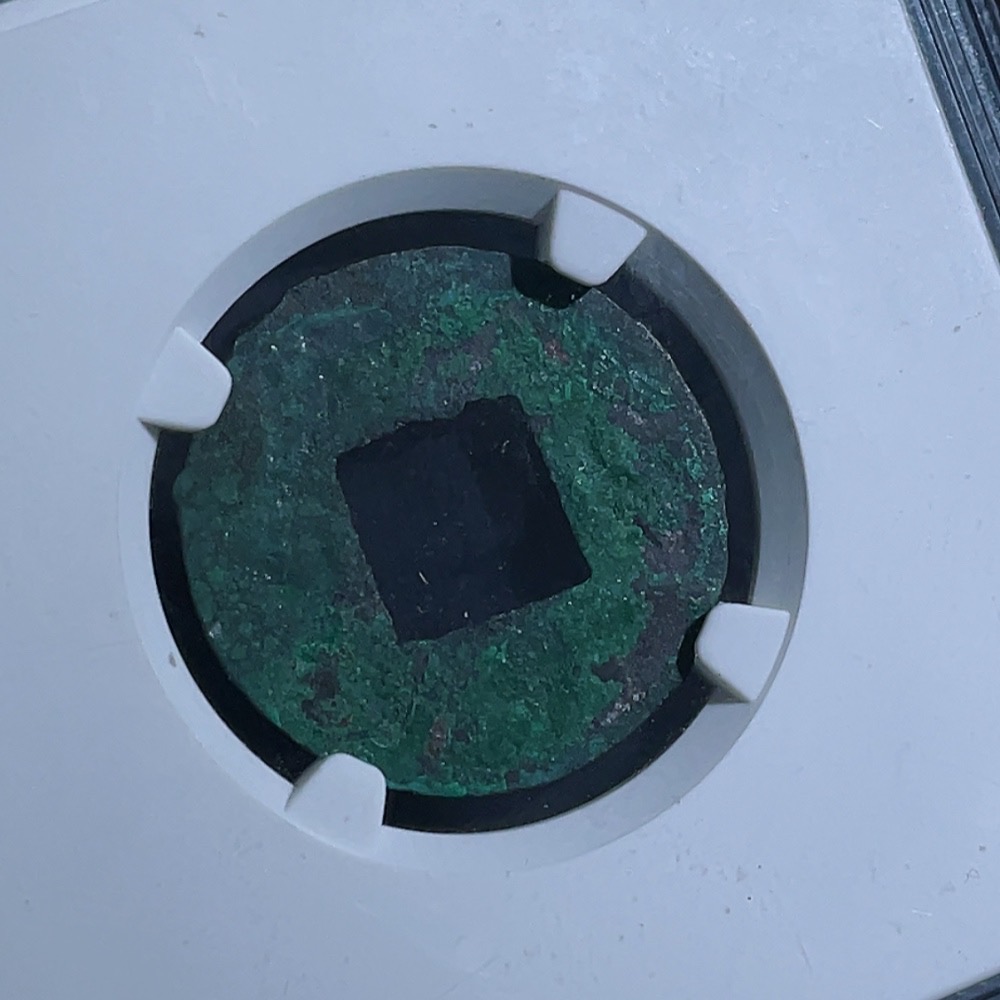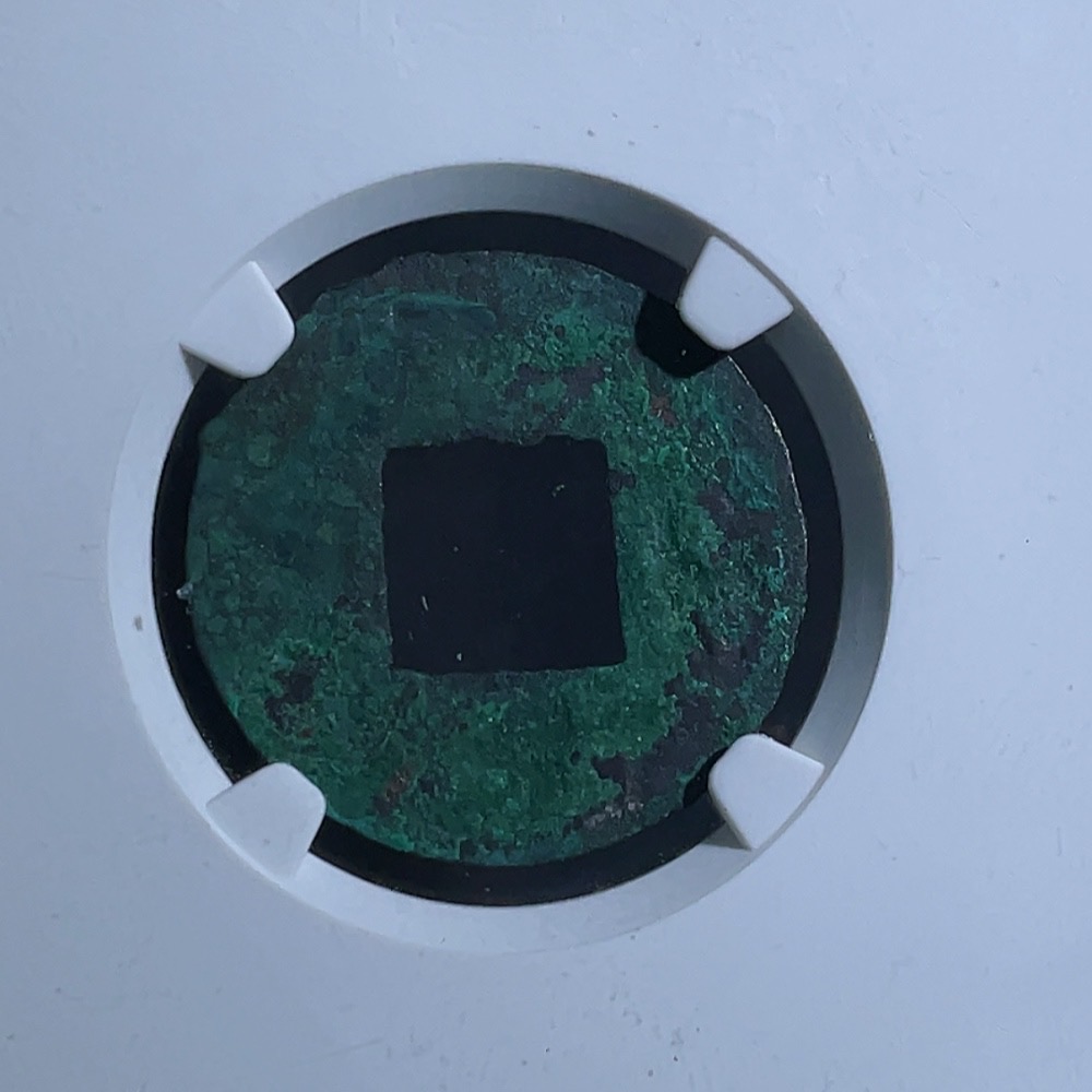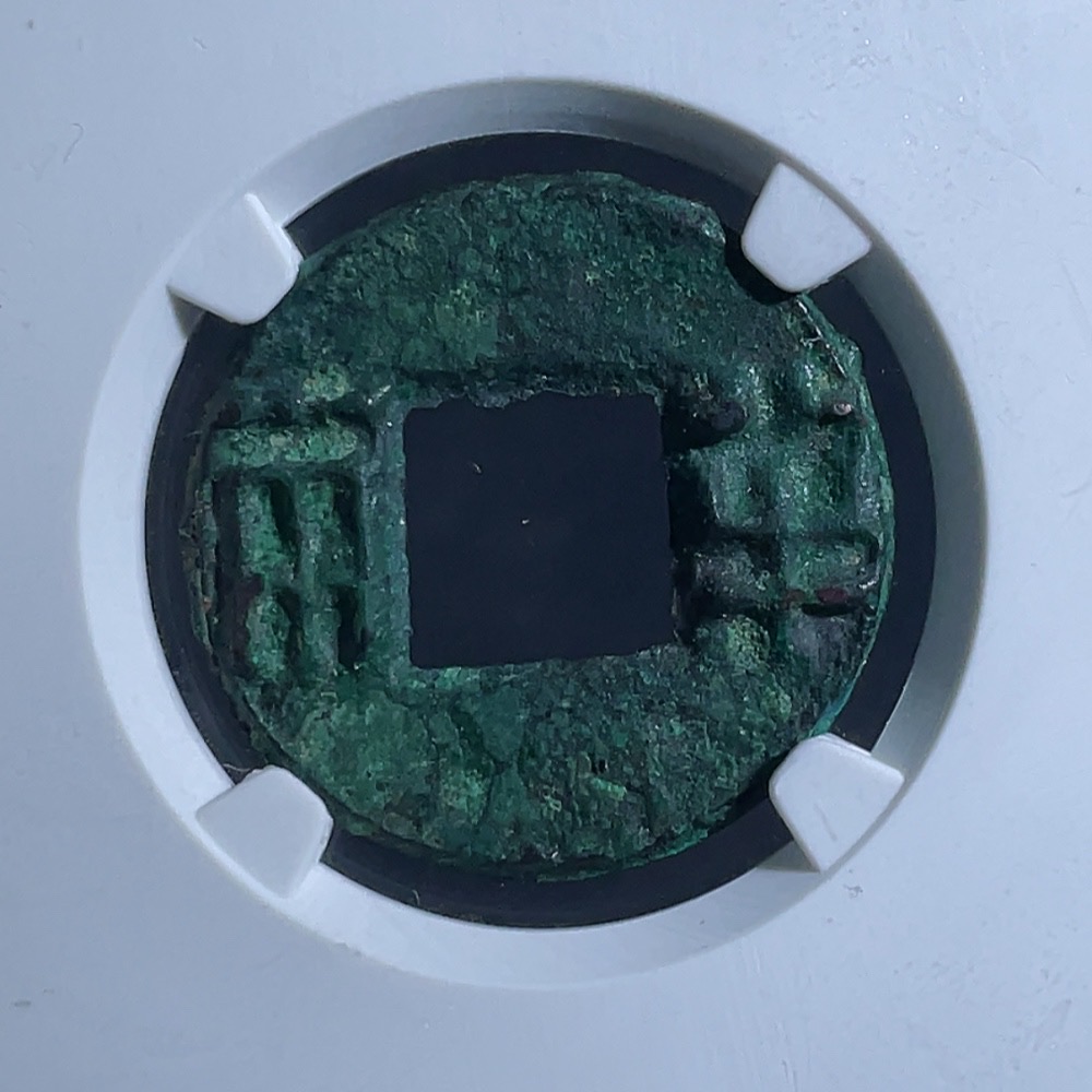 Half-Tael Coin with Four Zhu, Half-Tael, GBCA 90 Points, Explosive Characters, Explosive Green Patina Half-Tael