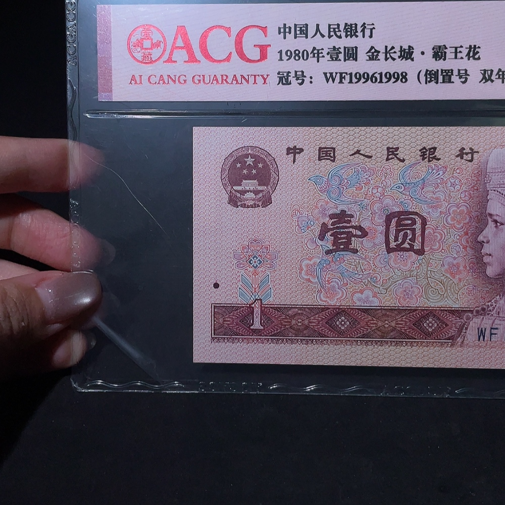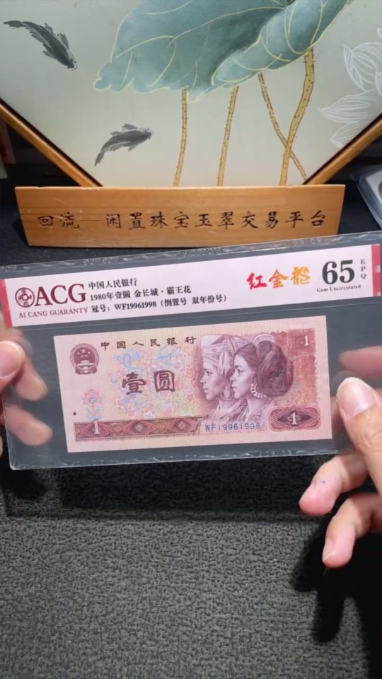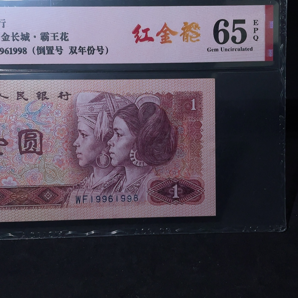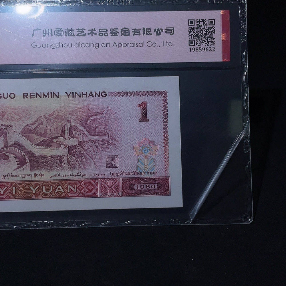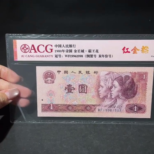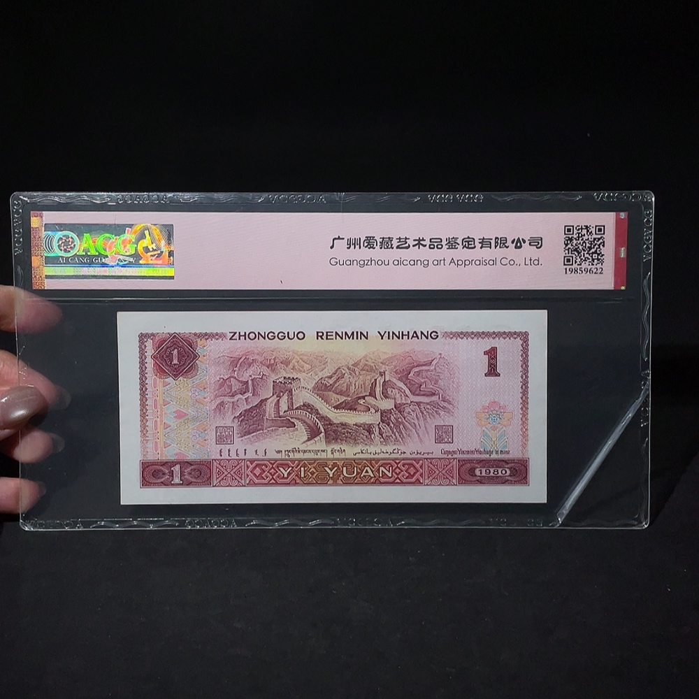 The 4th Set of RMB 80 Version Red Golden Dragon One Yuan Banknote with Double Year Number Inverted Number Fancy Number Certificate, Aicang Graded 65 Points Original Ticket