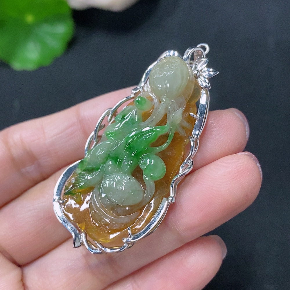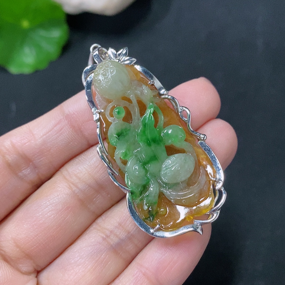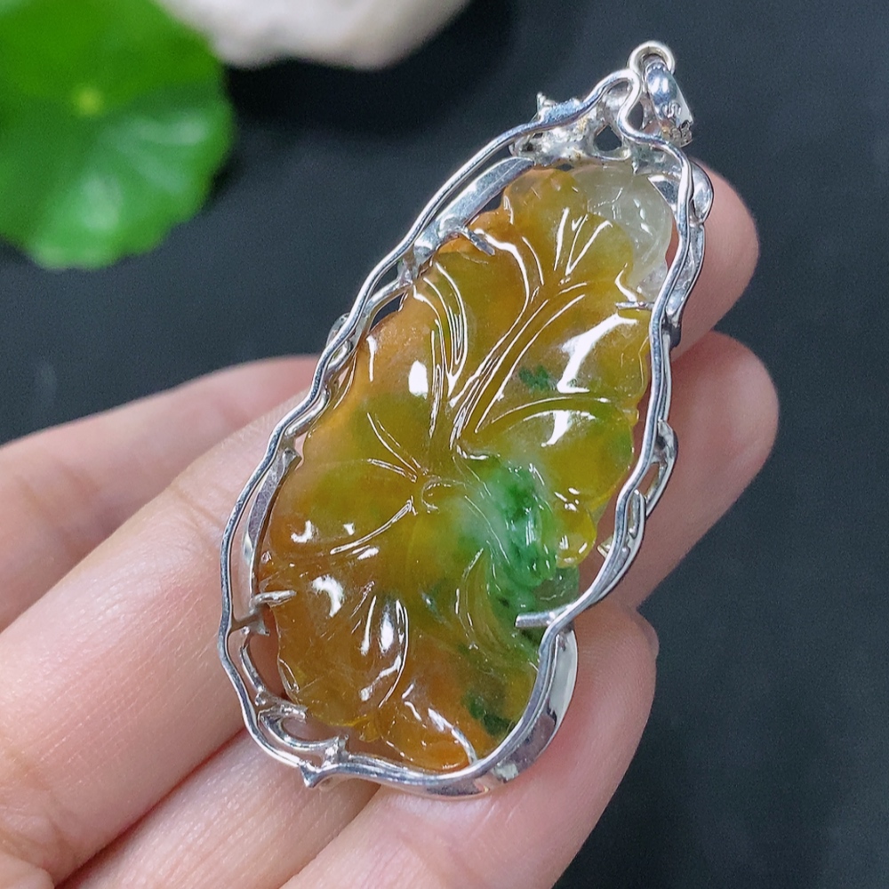 Jadeite inlaid lotus pendant with 18k clasp, main body Au68%, total weight approximately 10.92g