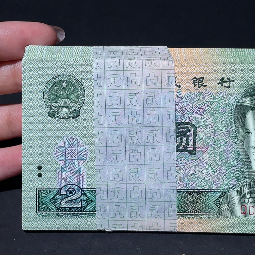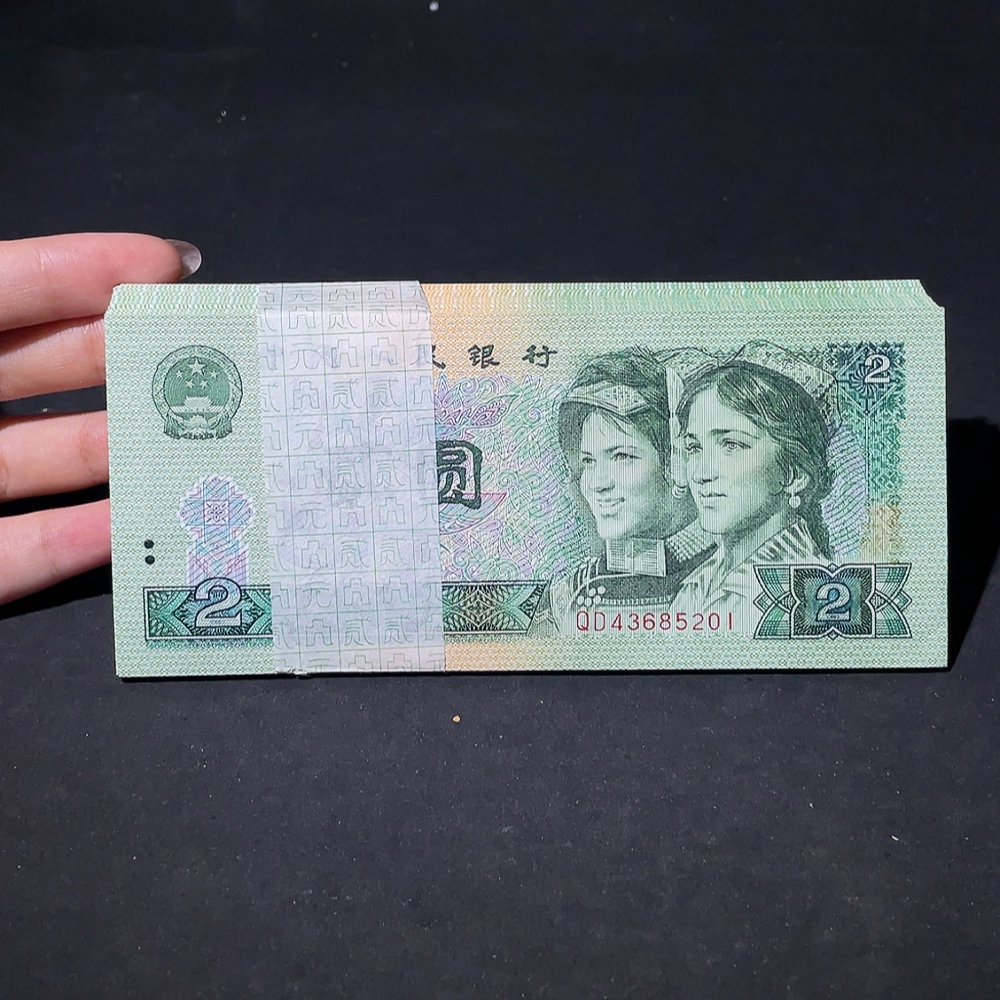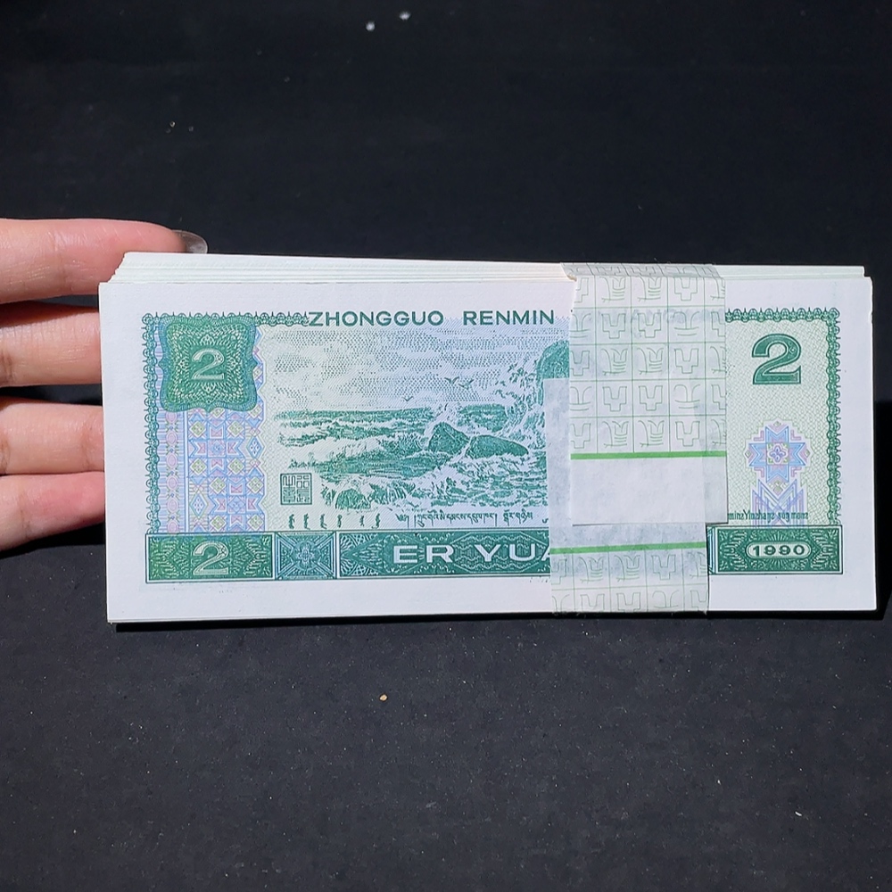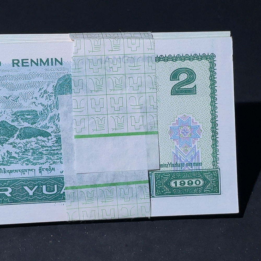 Four sets of 1990 edition 2-yuan bills in consecutive hundreds, pristine condition without spots or oil stains, with a random snake number, uncut sheet of banknotes