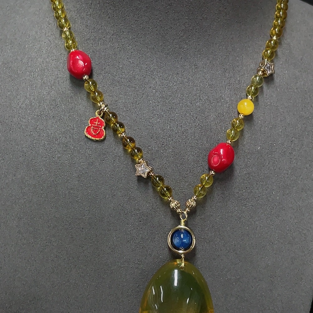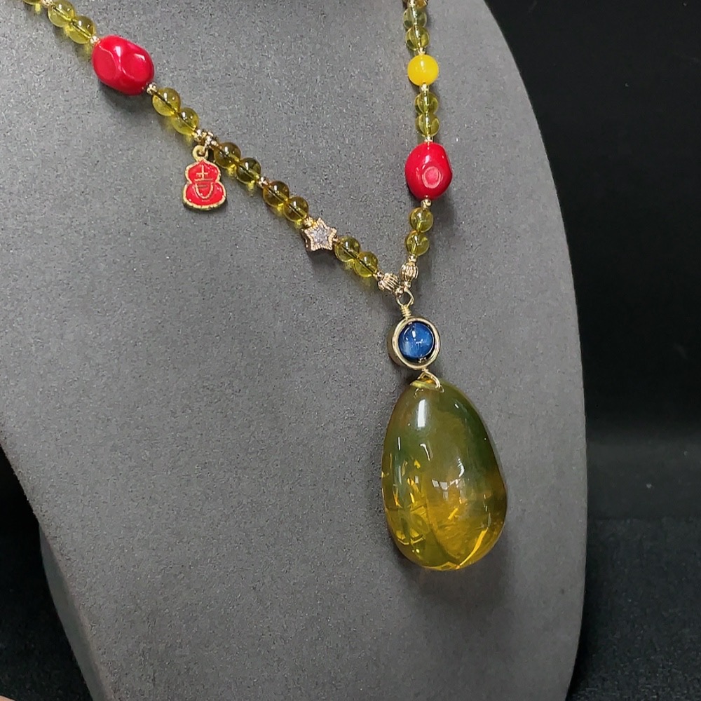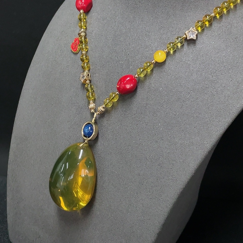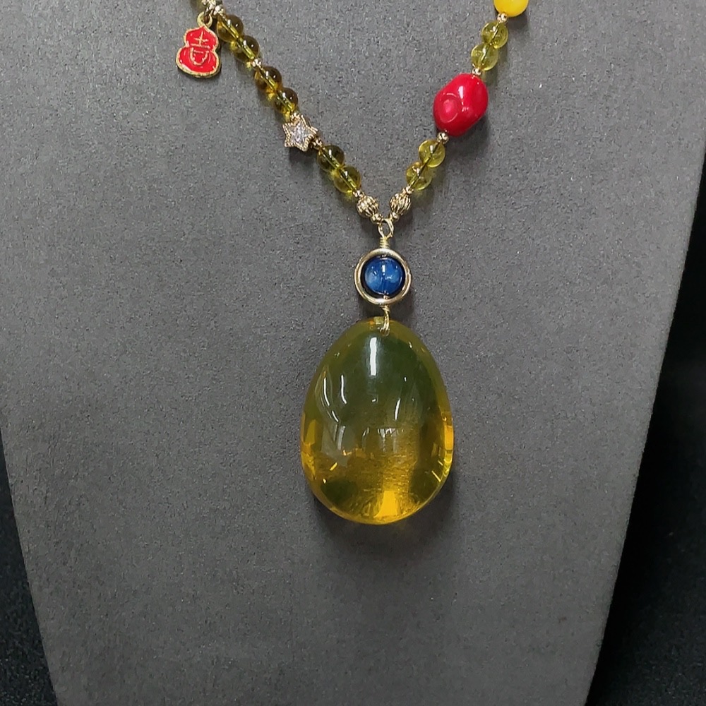 Amber Beeswax Pendant with Non-Natural Accent Stones, Non-Gold, Total Weight Approx. 30.16g Including Chain