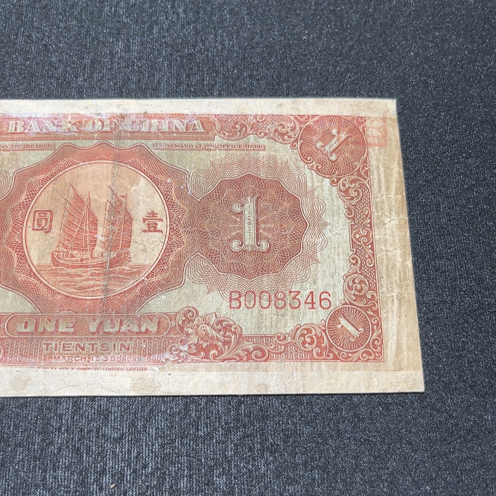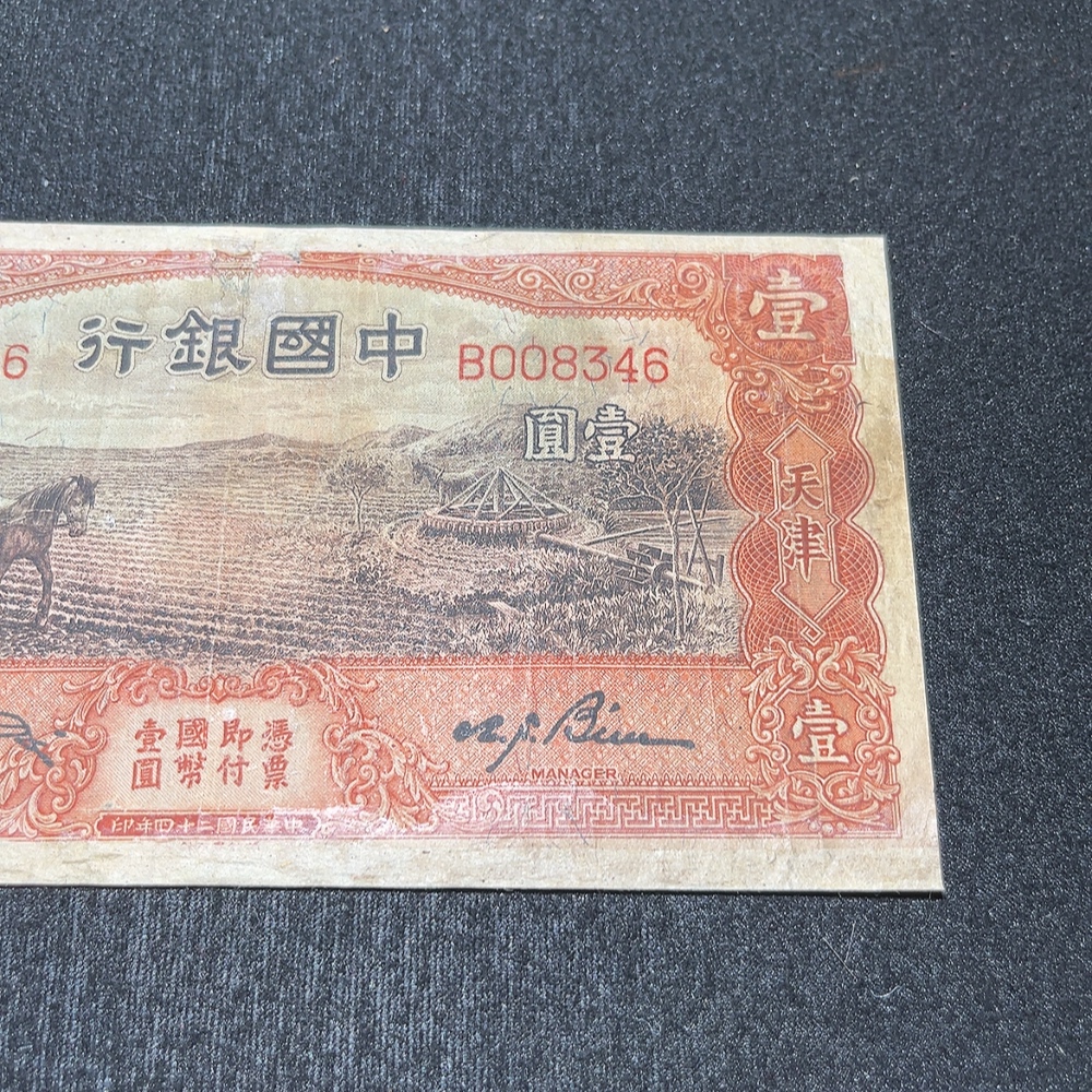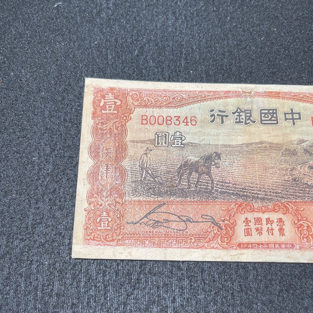 Bank of China One Yuan - Plowing with Horse - 1935 De La Rue Printed Banknote