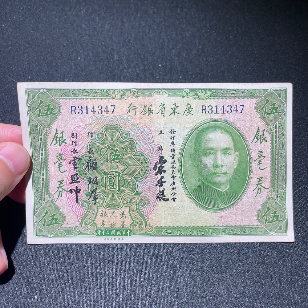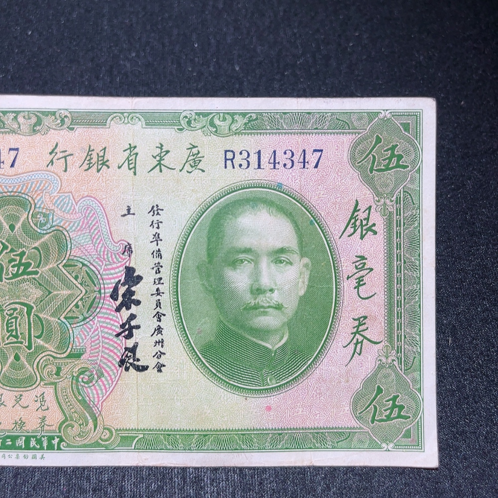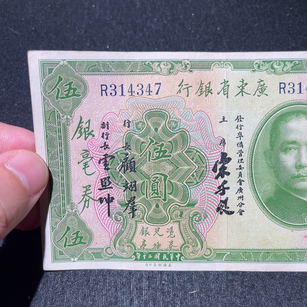 Trezaar - 20th Year of the Republic Guangdong Provincial Bank Silver Dollar Certificate Five Yuan, T.L. Soong Signature Version, Fine Original Banknote