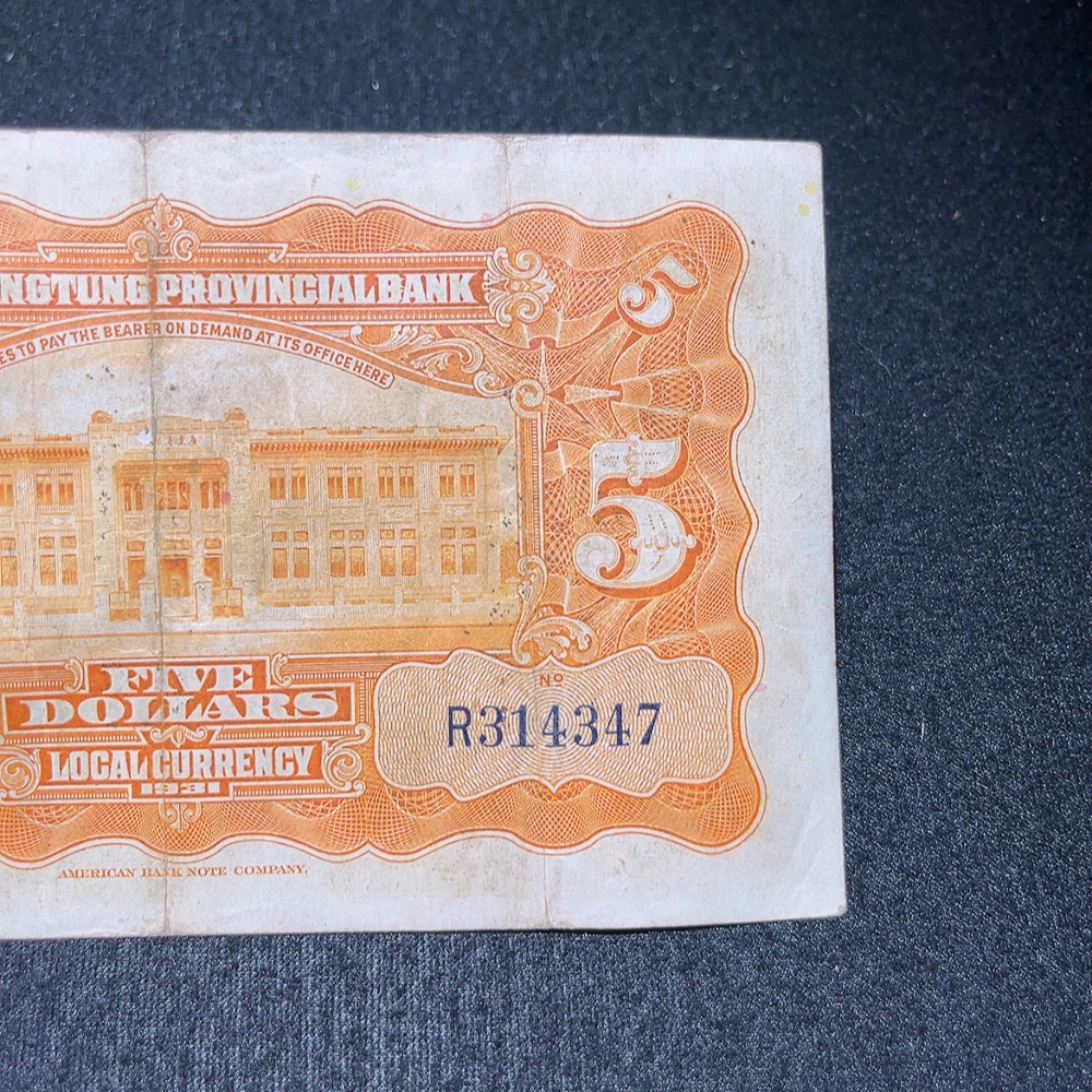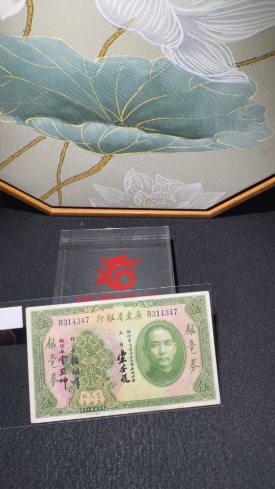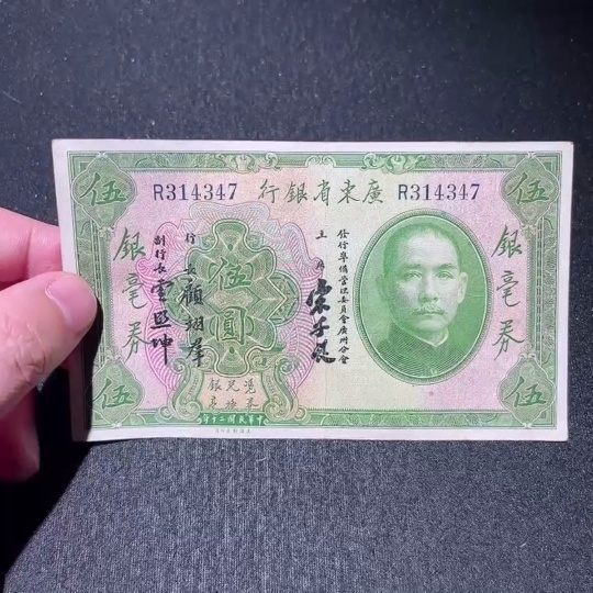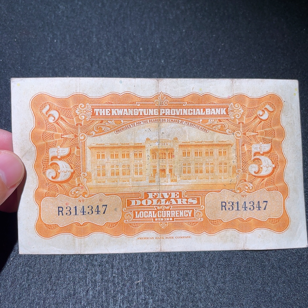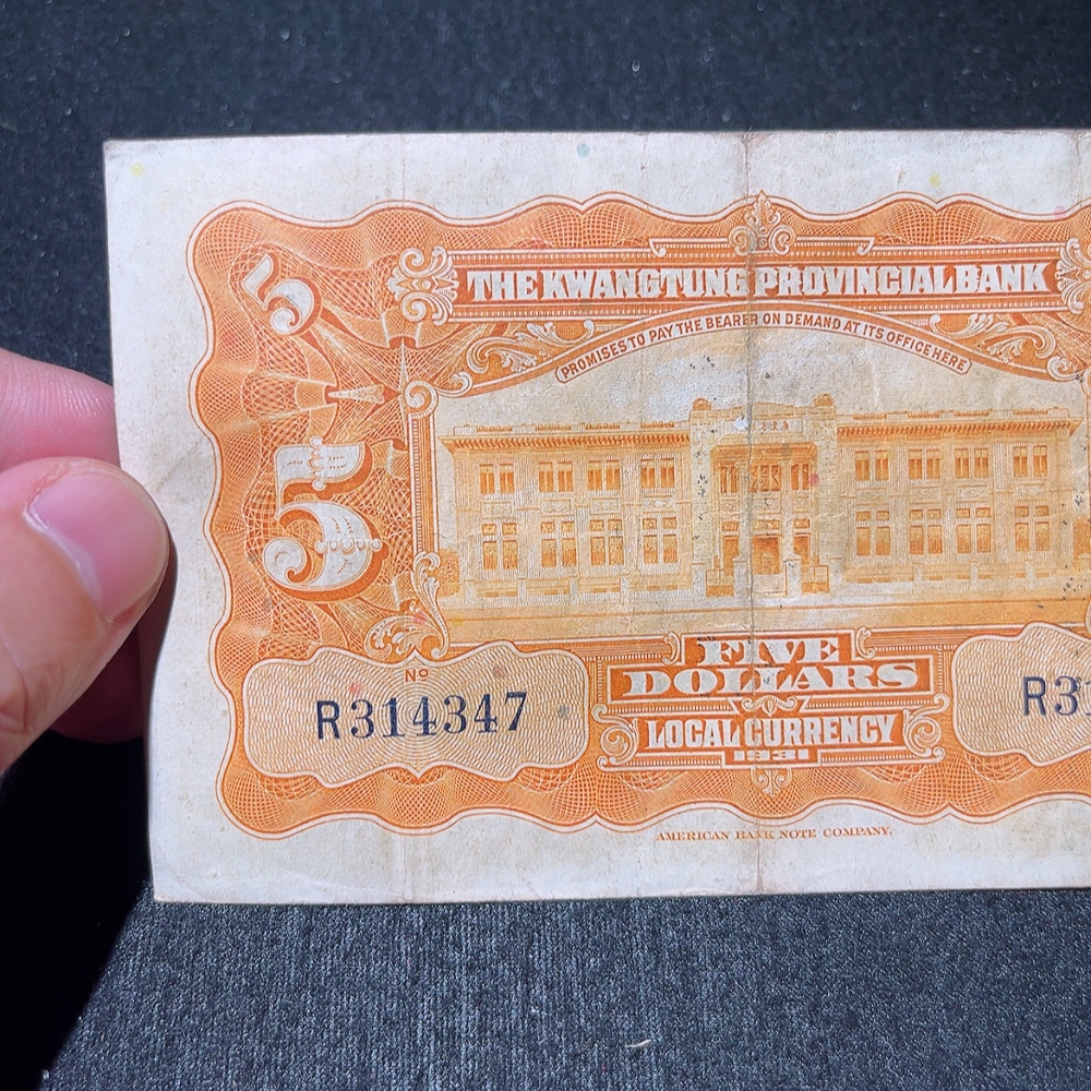Trezaar - 20th Year of the Republic Guangdong Provincial Bank Silver Dollar Certificate Five Yuan, T.L. Soong Signature Version, Fine Original Banknote