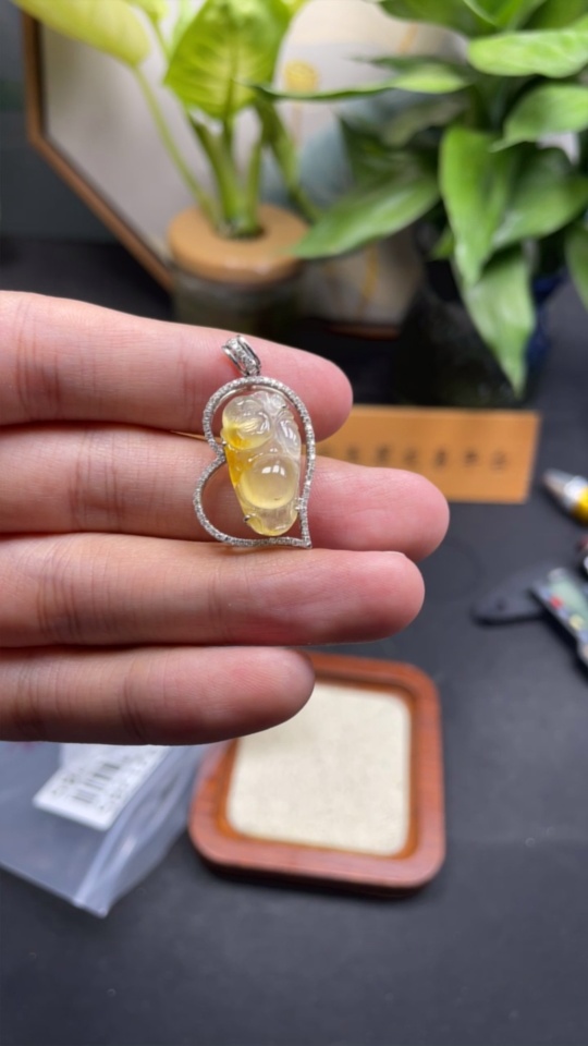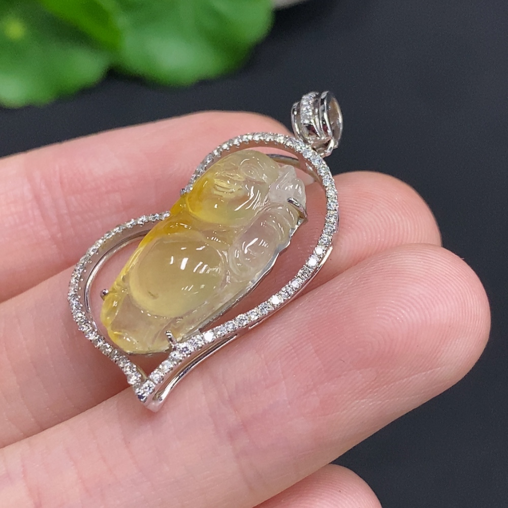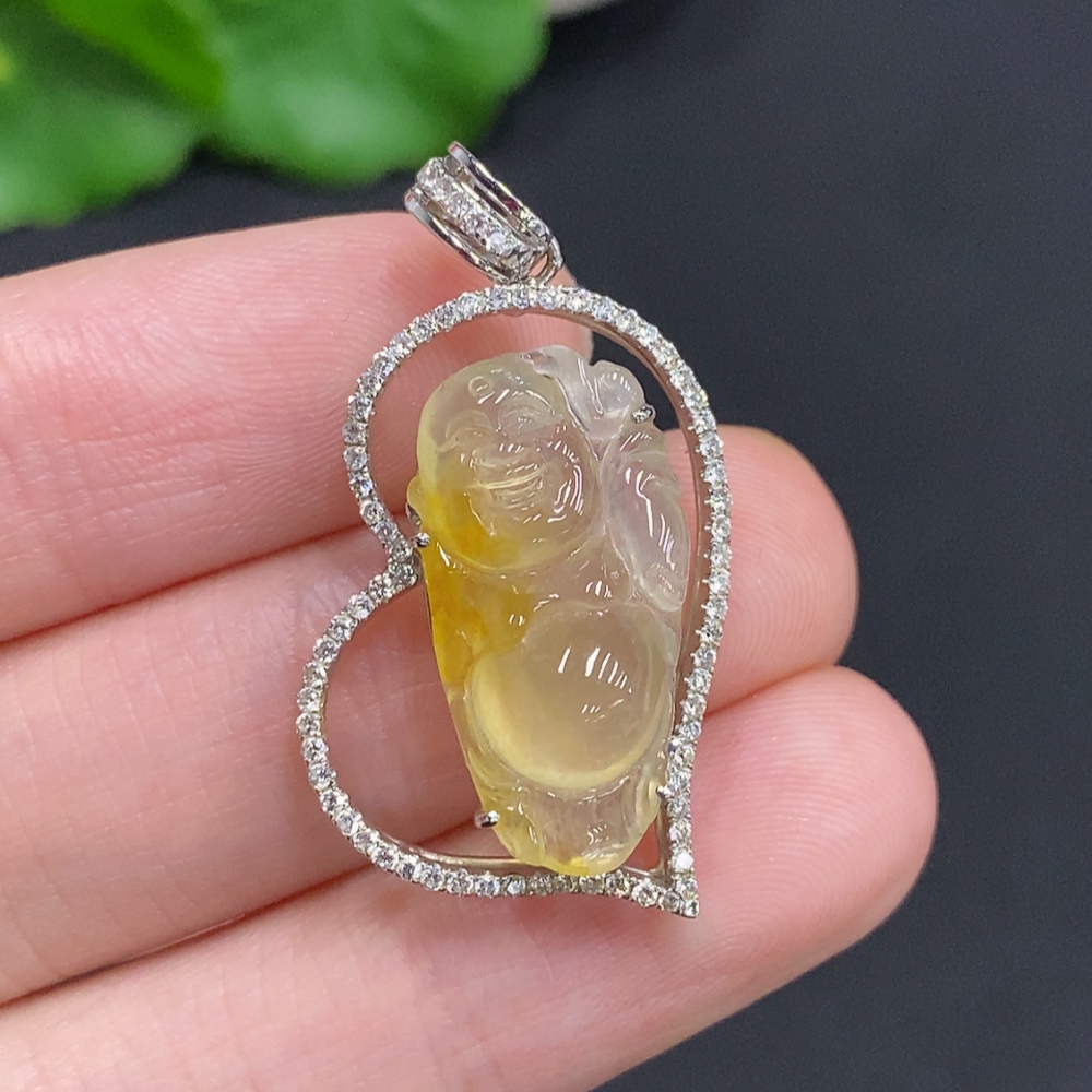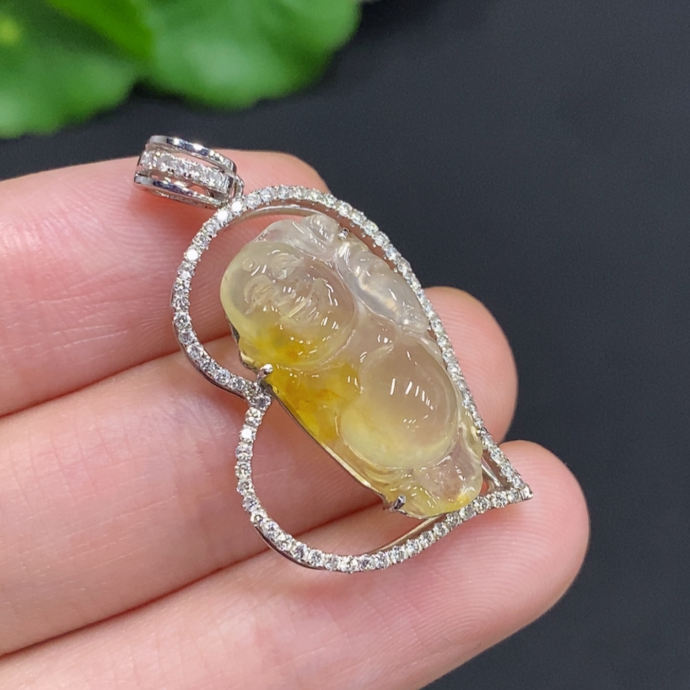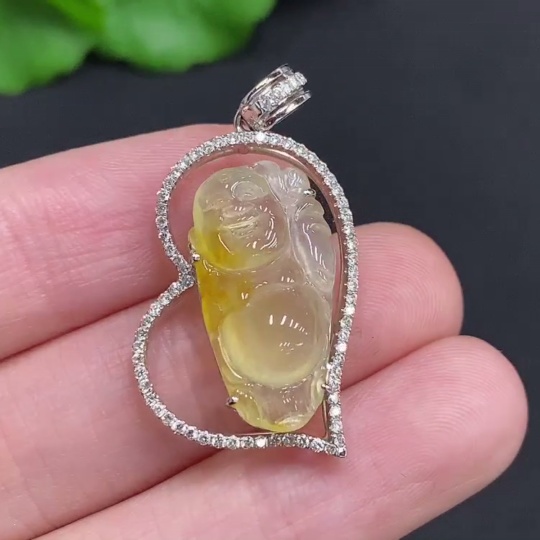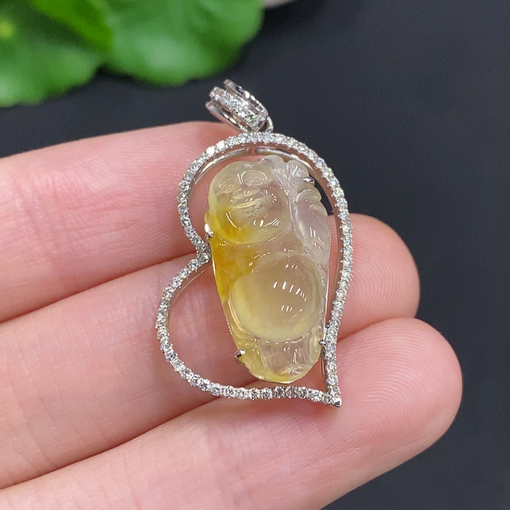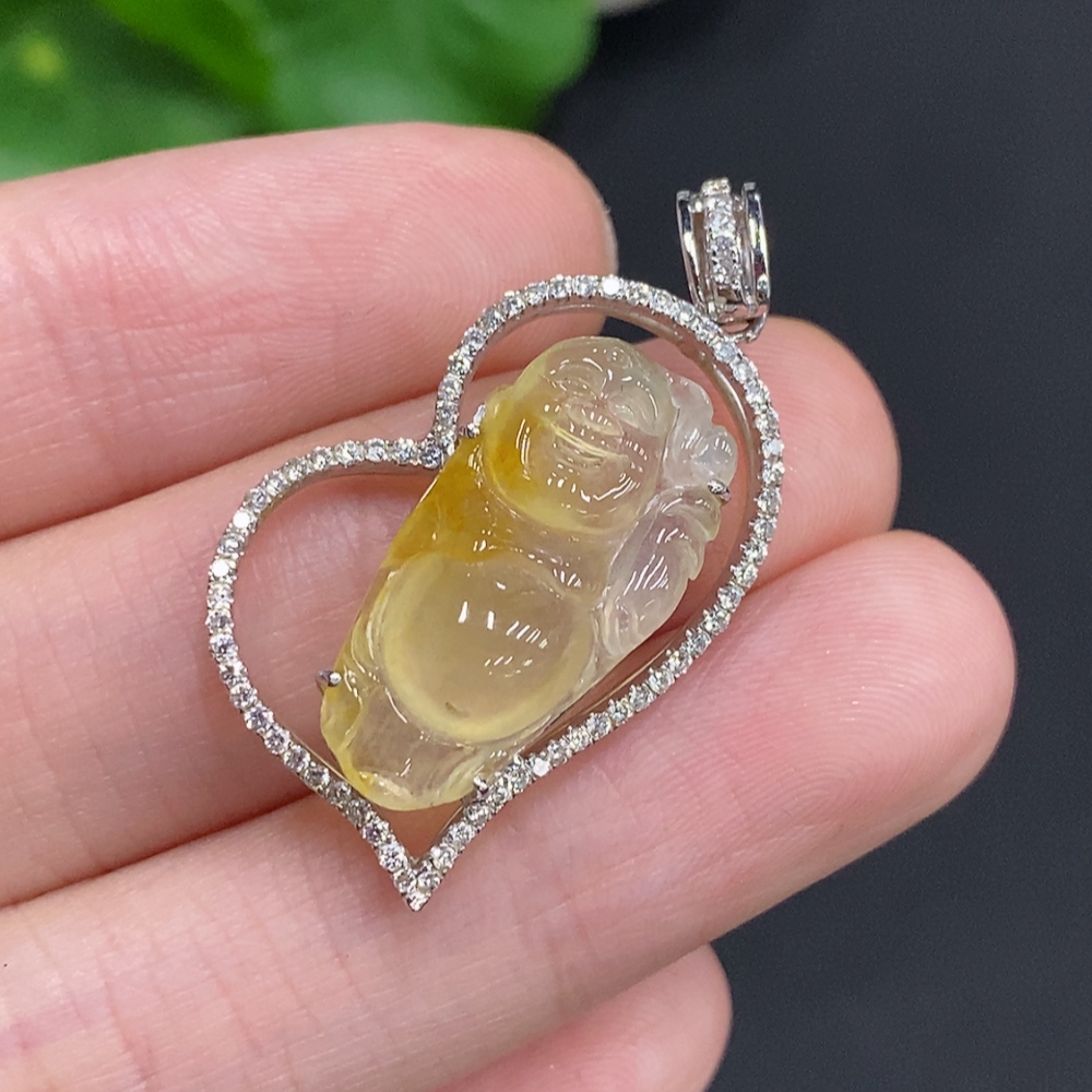 Jadeite Laughing Buddha Pendant, 18K Gold Setting with Diamond Accents, Total Weight Approx. 4.2g