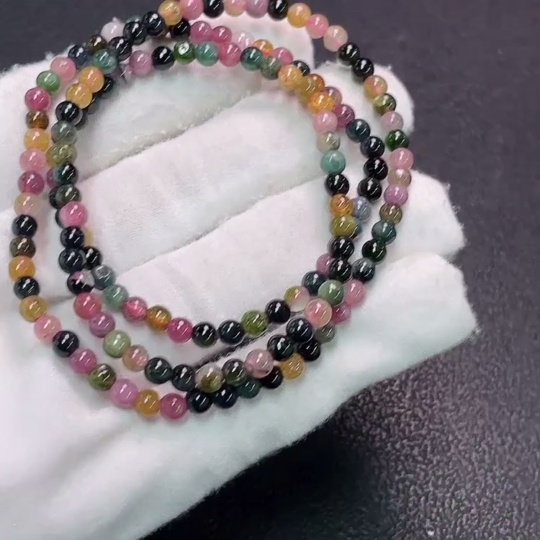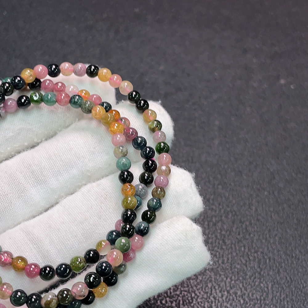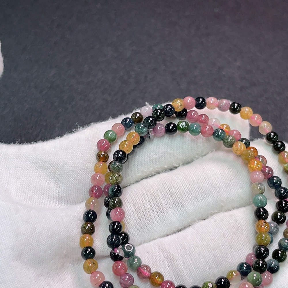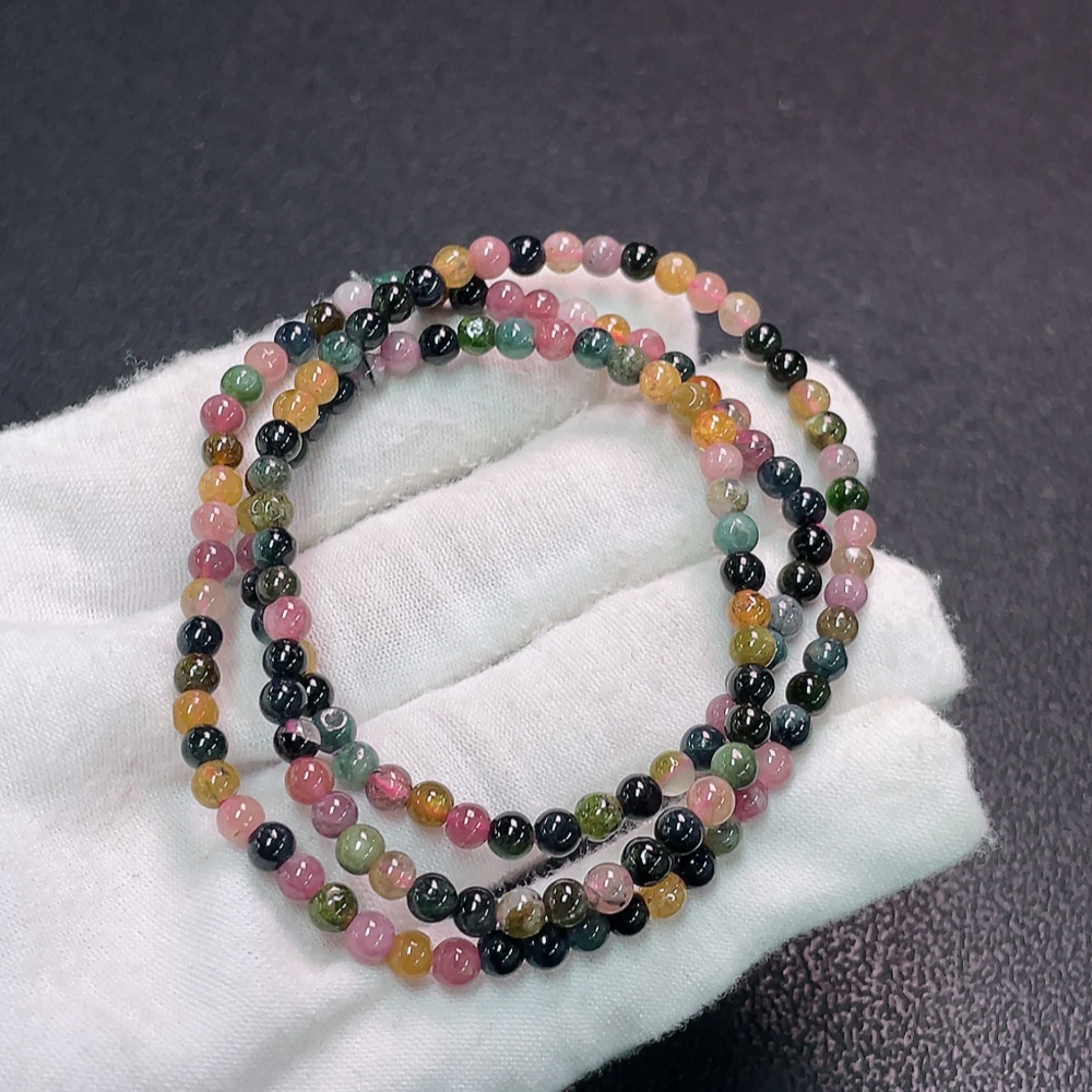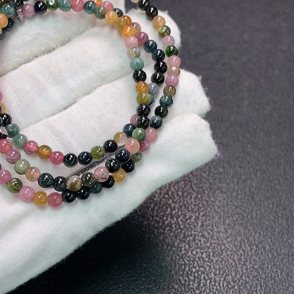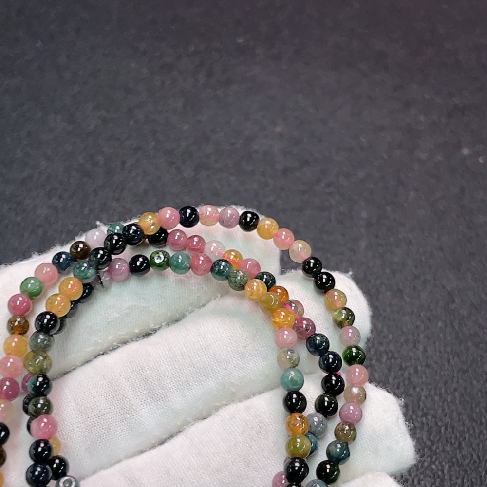 Tourmaline bead necklace with other mineral components and visible organic matter, total weight approximately 13.34g, bead size about 4mm