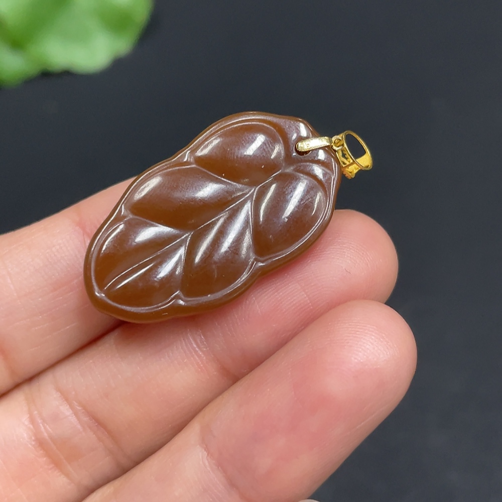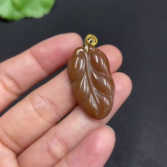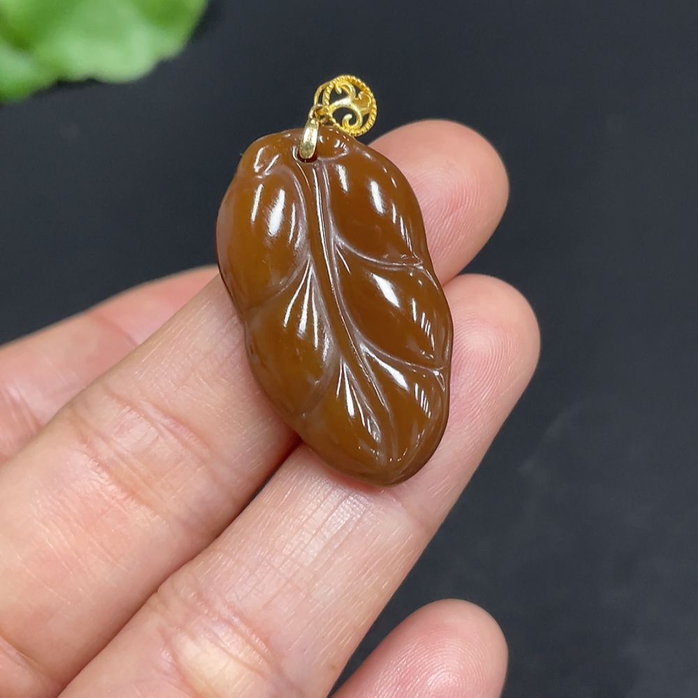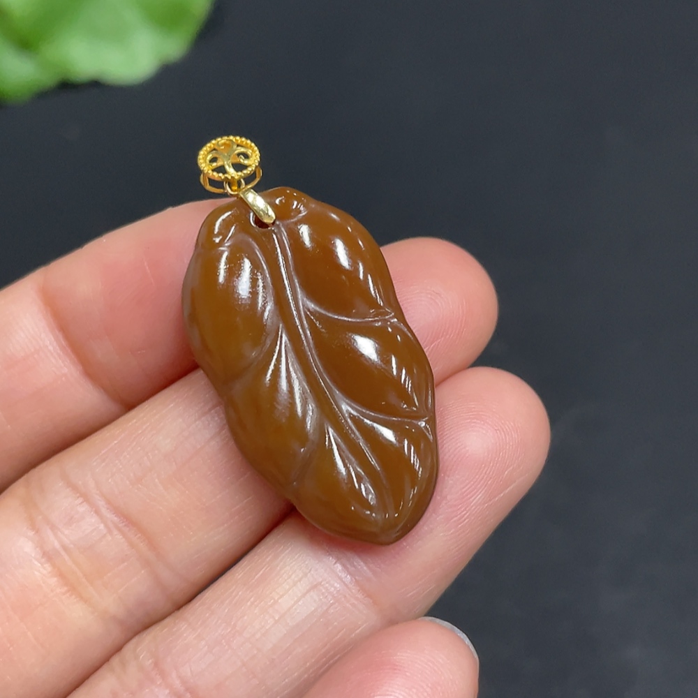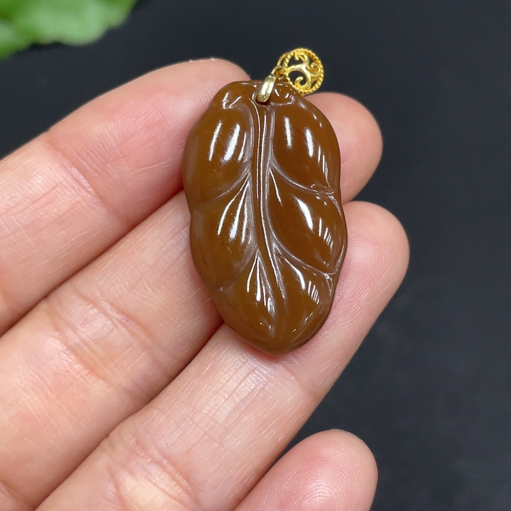 Hetian Jade Pendant Leaf with 18k Gold Clasp Total Weight Approx. 4.3g