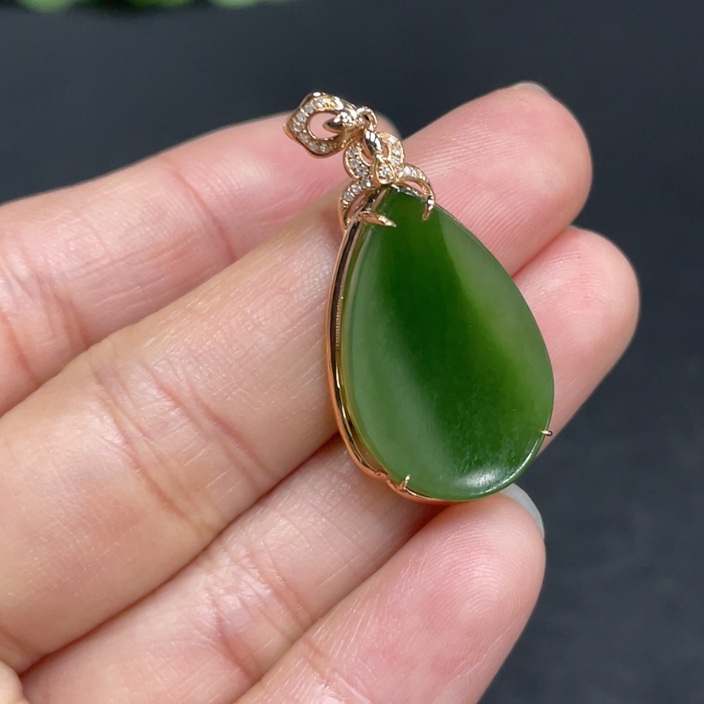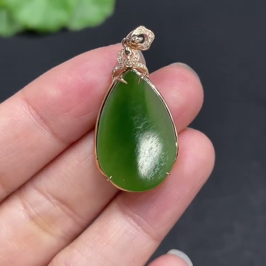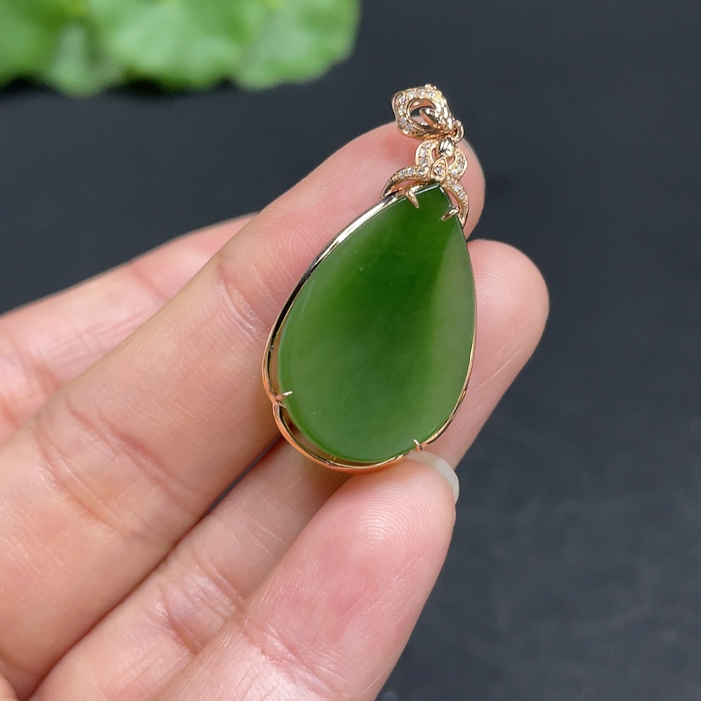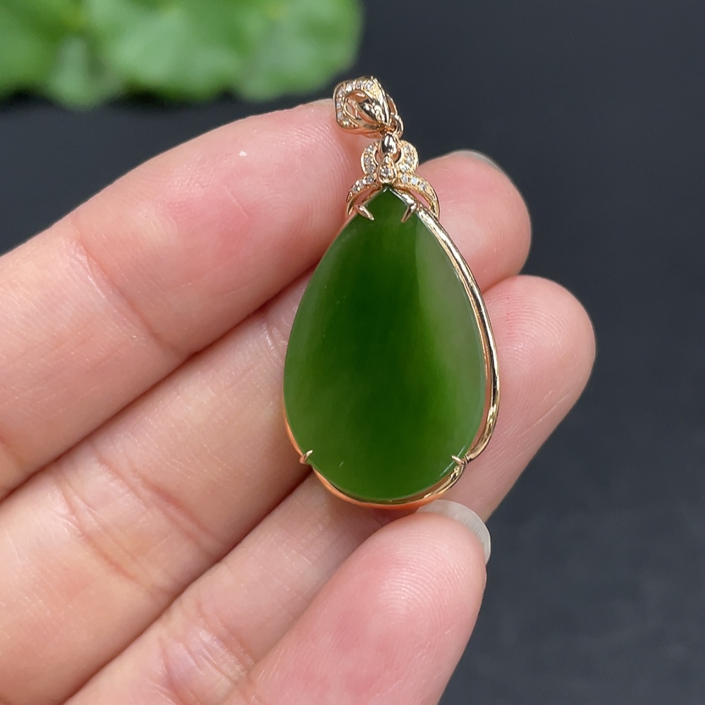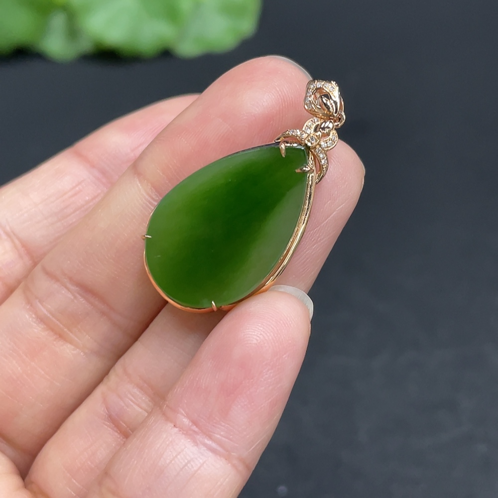 Hetian Jade Water Drop Pendant with 18K Gold and Diamond Accents, Total Weight Approx. 3.1g