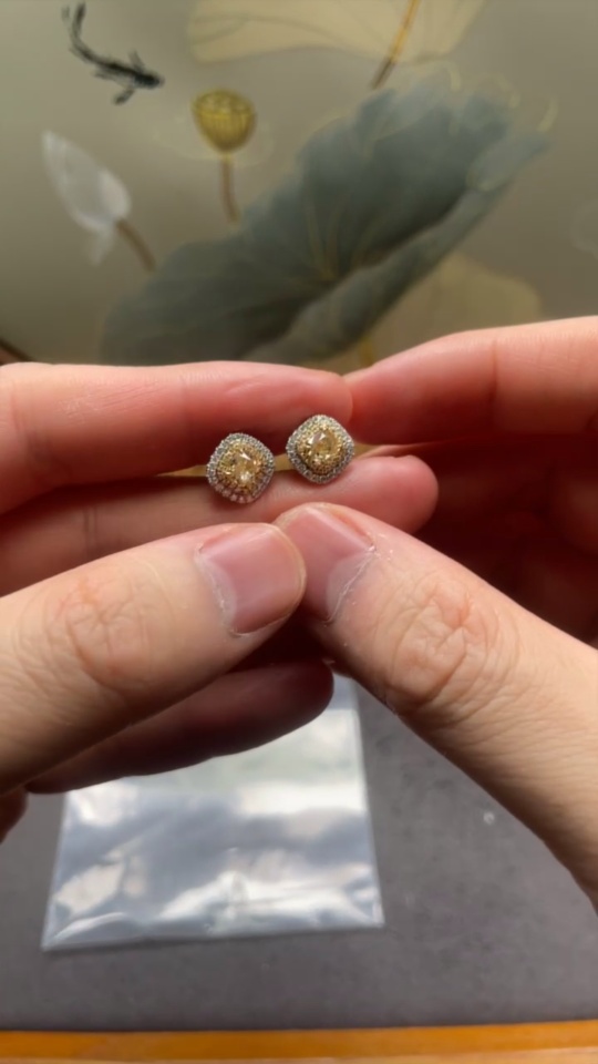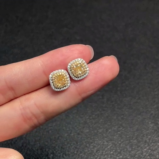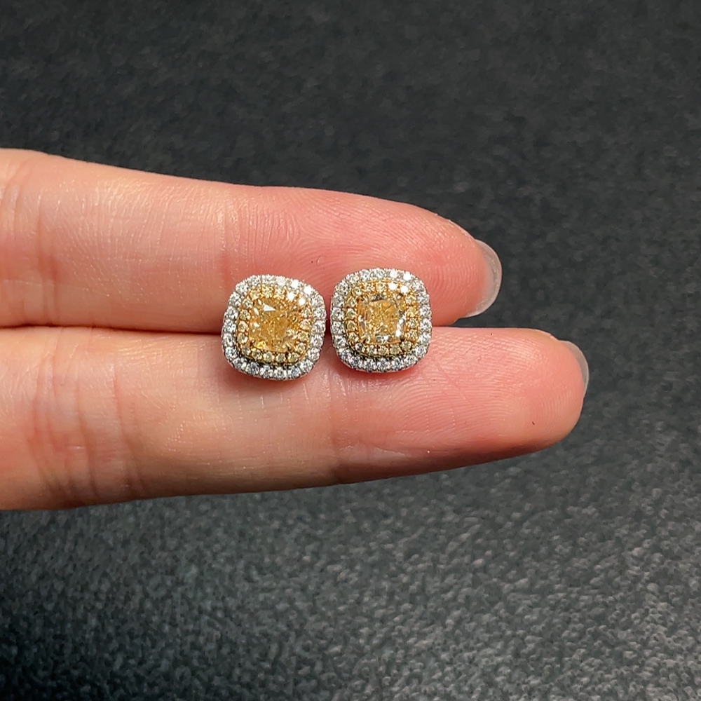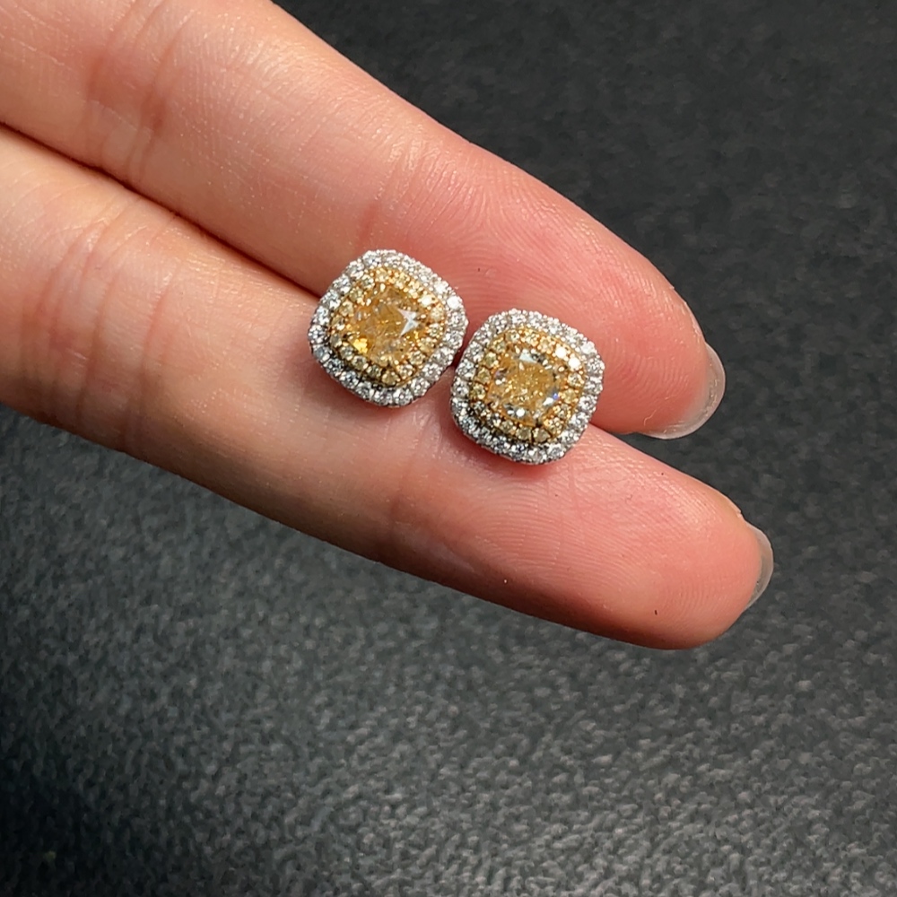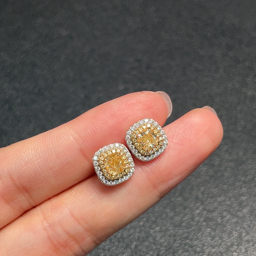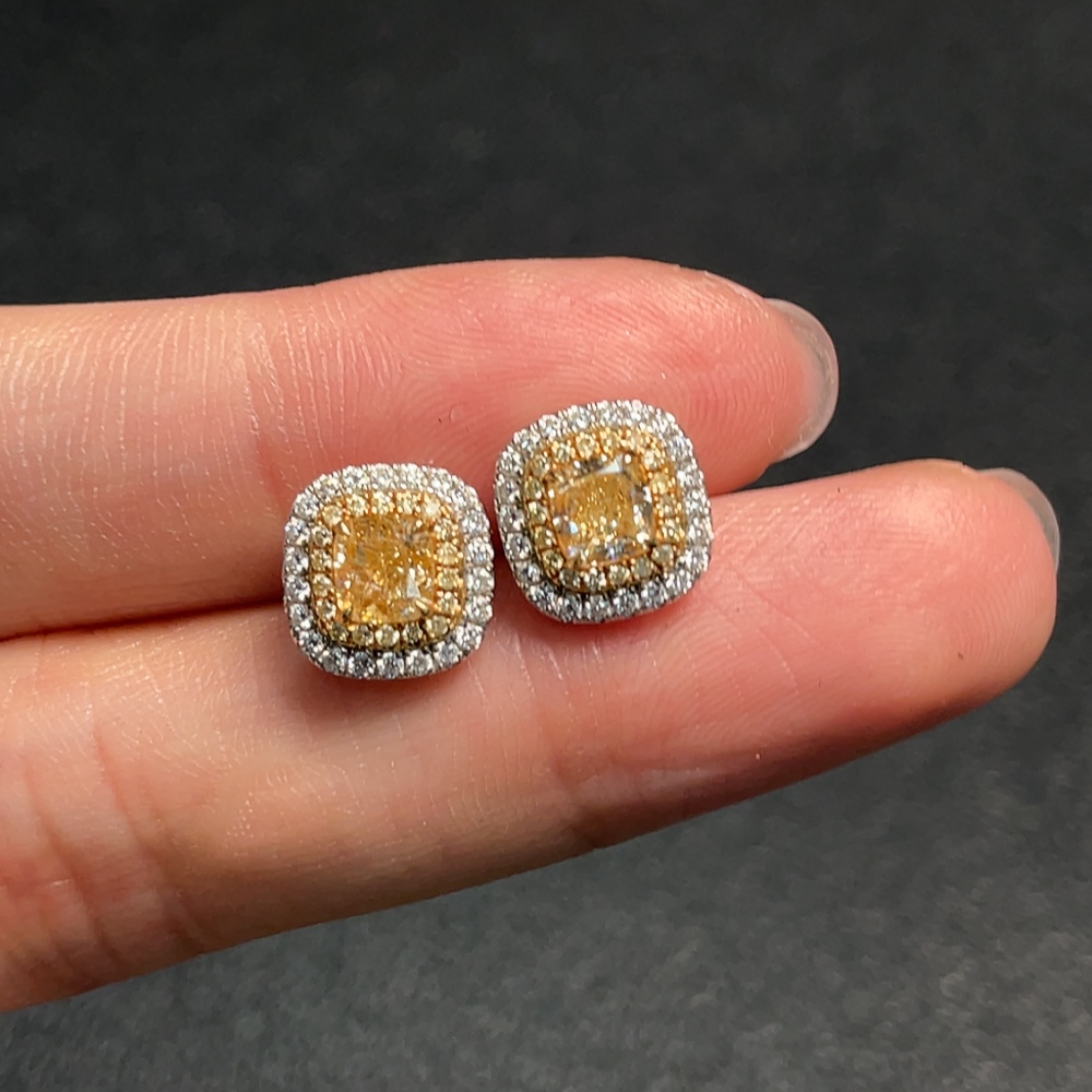 18k diamond earrings with undetermined color origin, bottom color backing, yellow accent stones of uncertain natural origin, set with colorless diamonds, total product weight approximately 3.36g, markings: D0.61ct d0.068ct d0.120ct