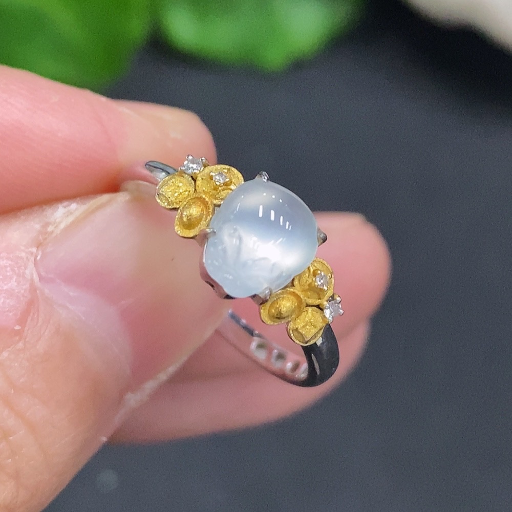 Jadeite Ring with 18K Gold Size 13 Total Weight Approx. 1.9g (Accented with Diamonds)