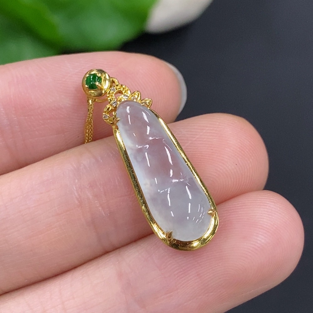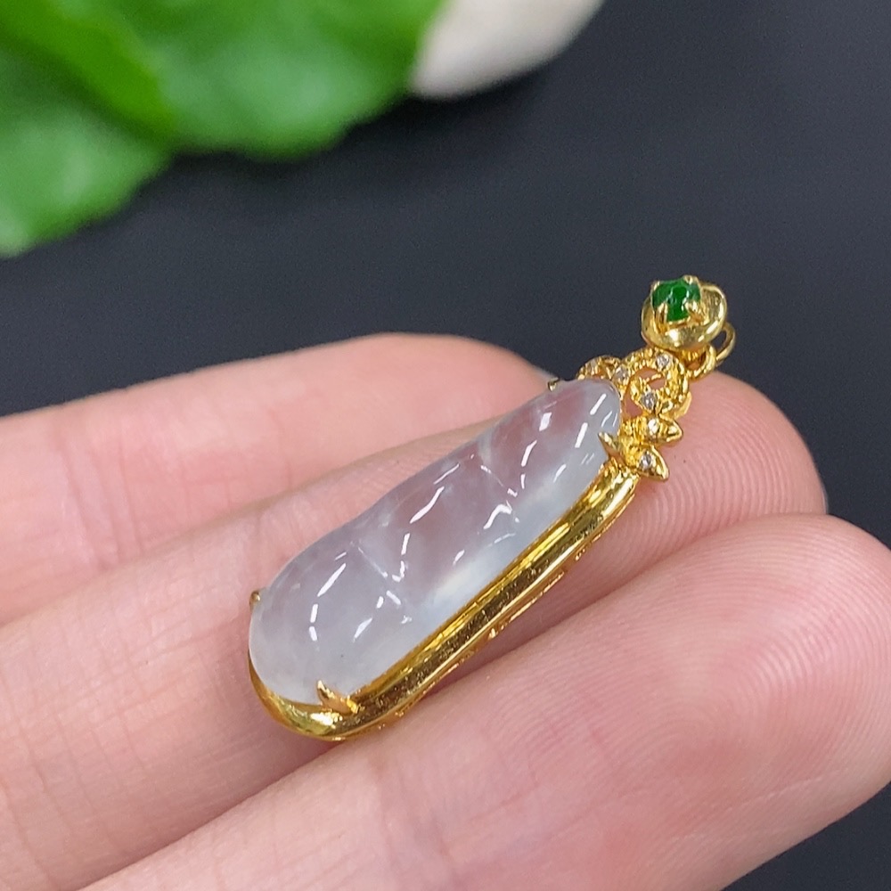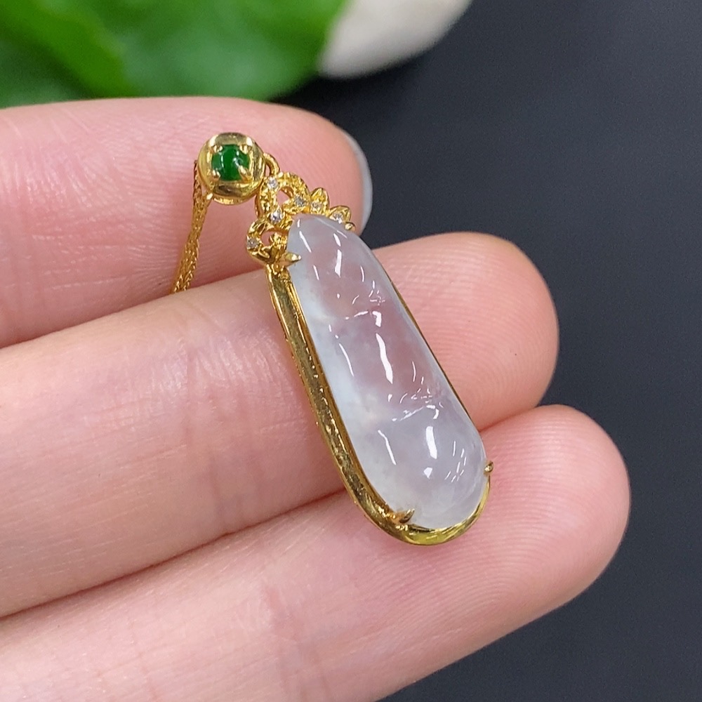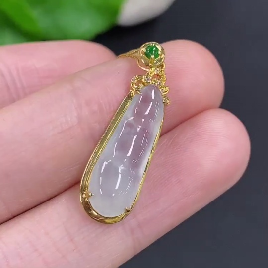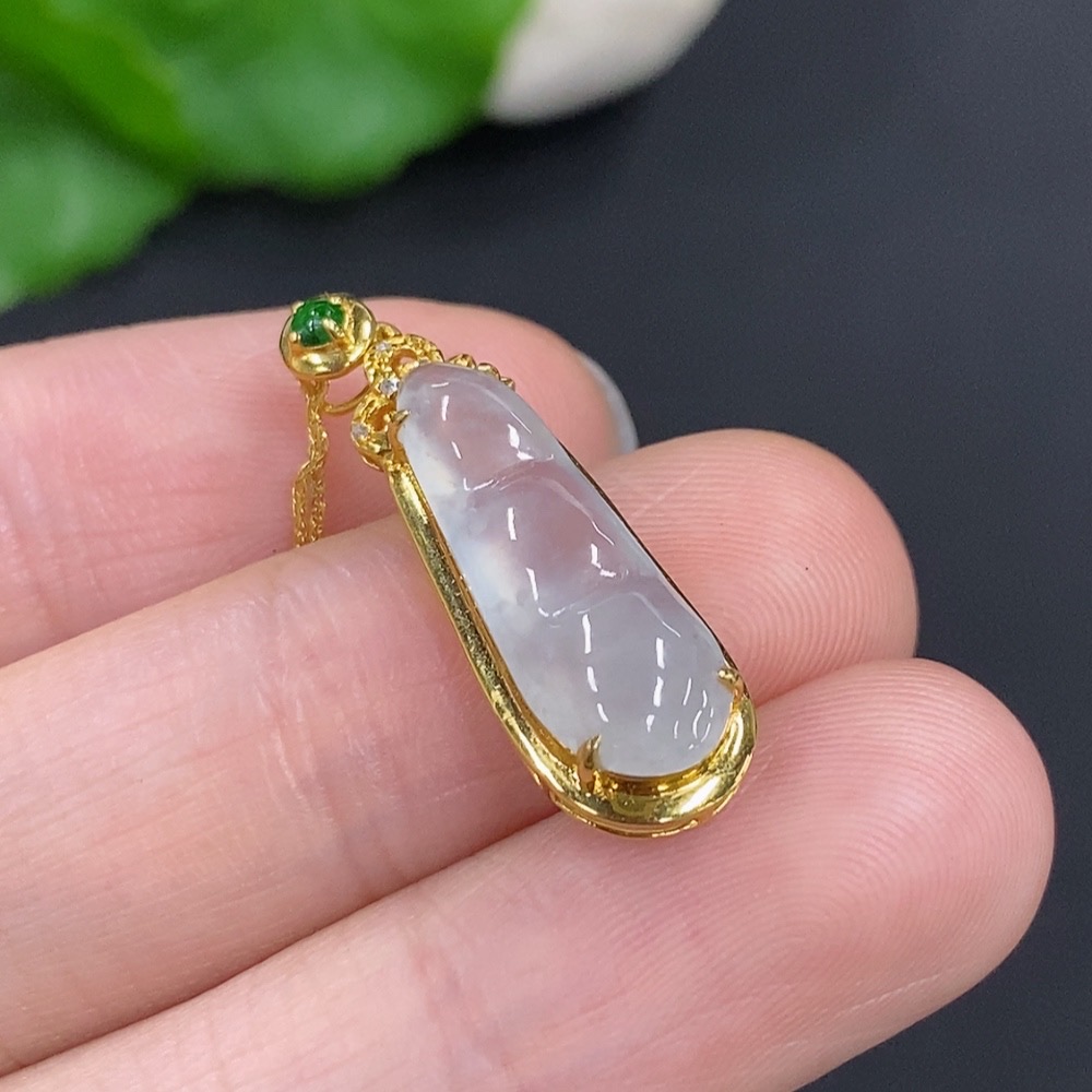 Jadeite Auspicious Bean Pendant Set in 18K Gold, Total Weight Approx. 2.4g (Including Chain), Accented with Diamonds