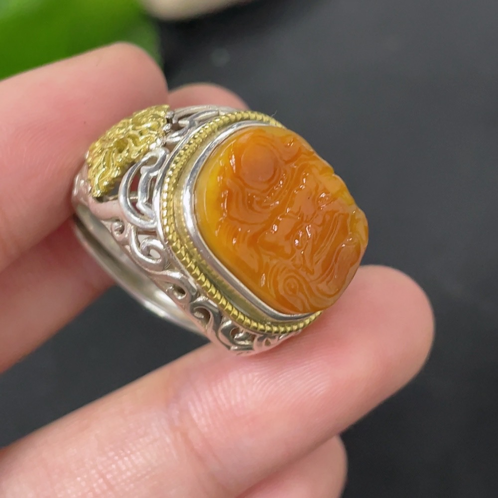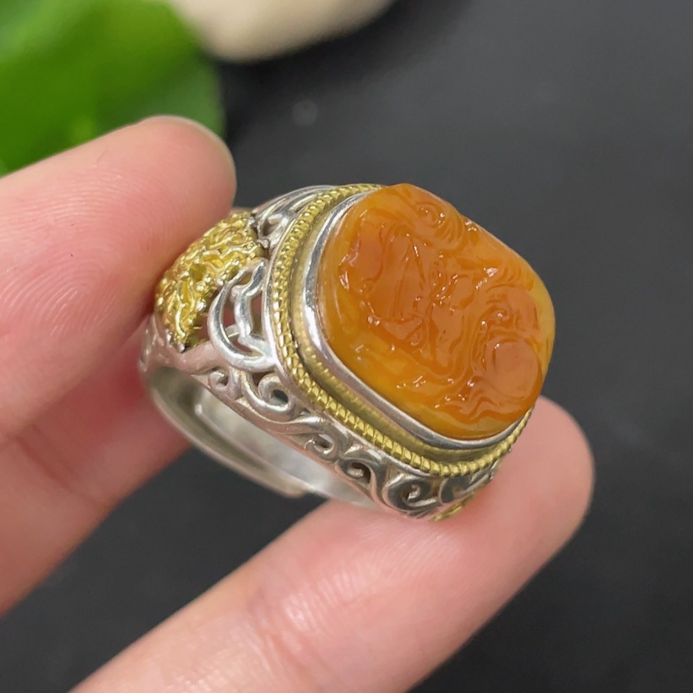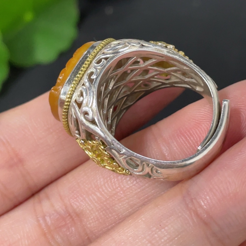 Hetian Jade Inlaid Adjustable Ring, Undetermined Skin Color Origin, Non-Gold, Total Weight Approximately 10.2g