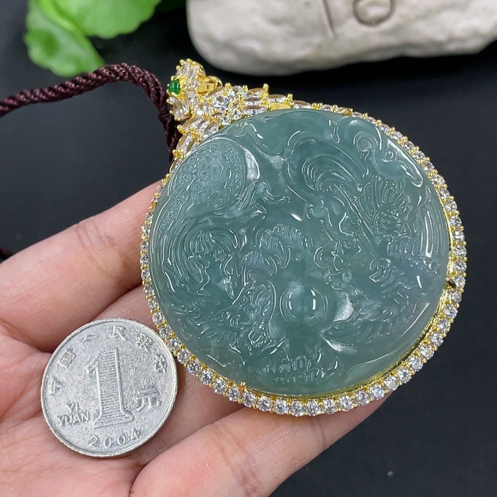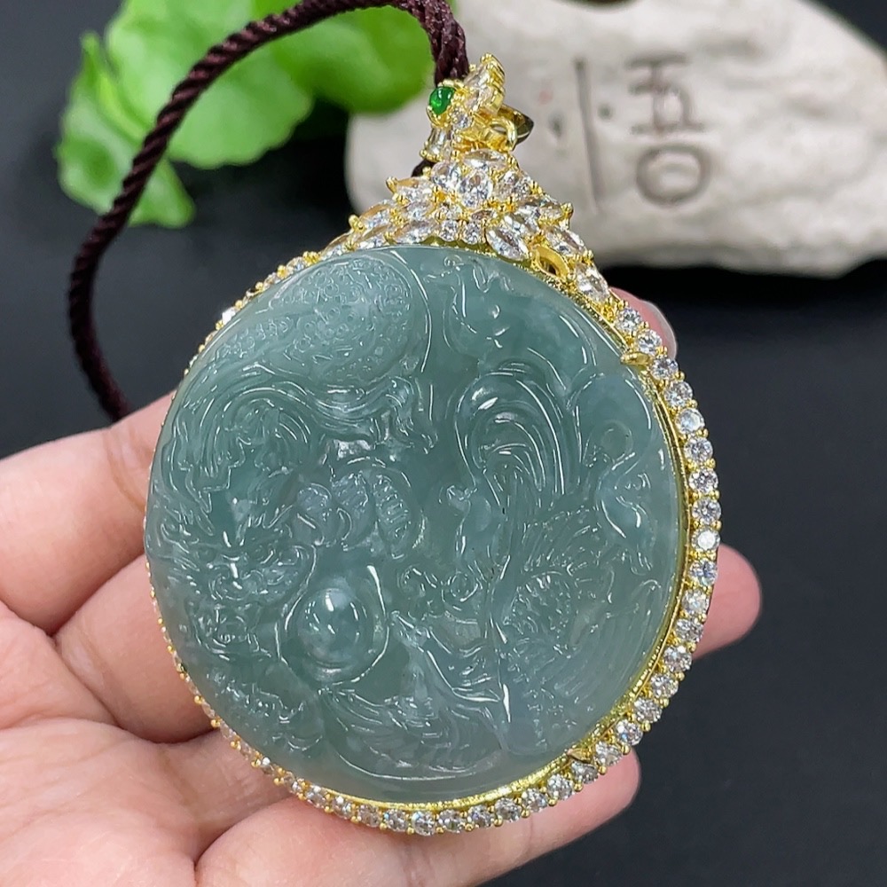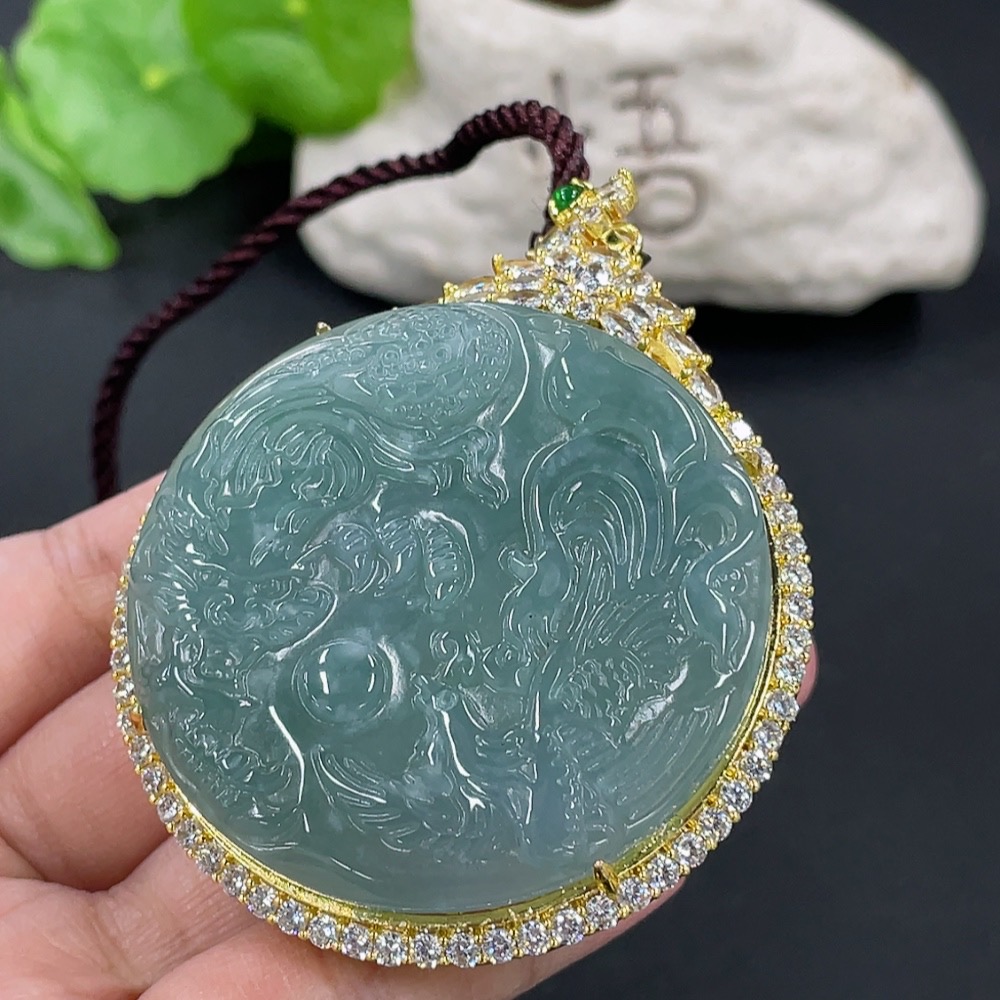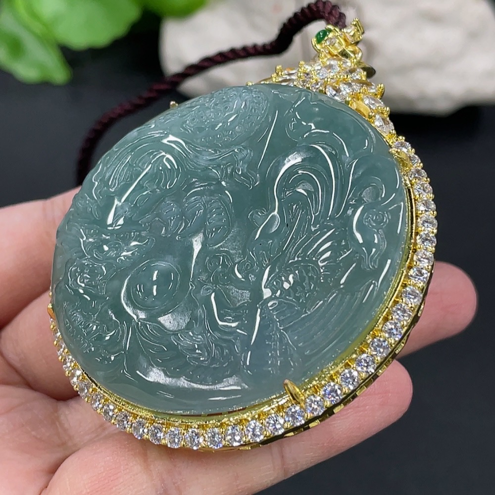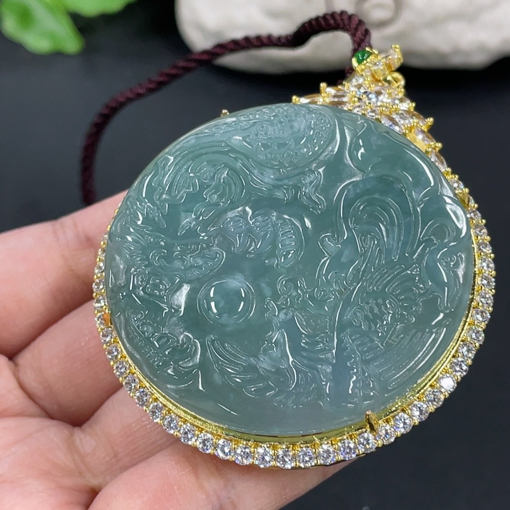 Jadeite Inlaid Dragon and Phoenix Auspicious Non-Gold Total Weight Approx. 61.65g Including Rope