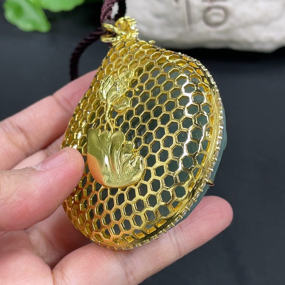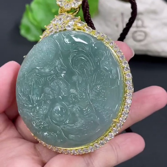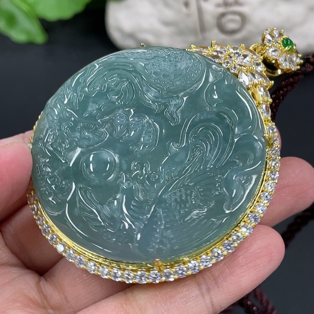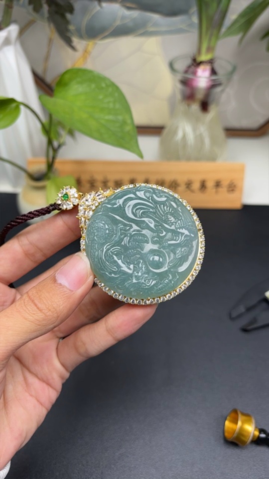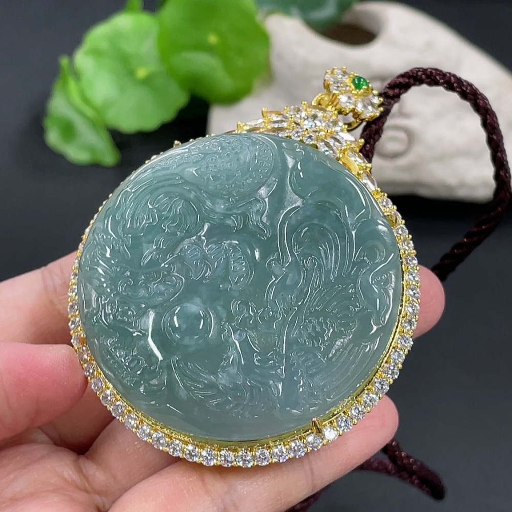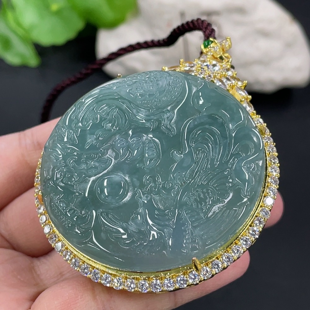 Jadeite Inlaid Dragon and Phoenix Auspicious Non-Gold Total Weight Approx. 61.65g Including Rope