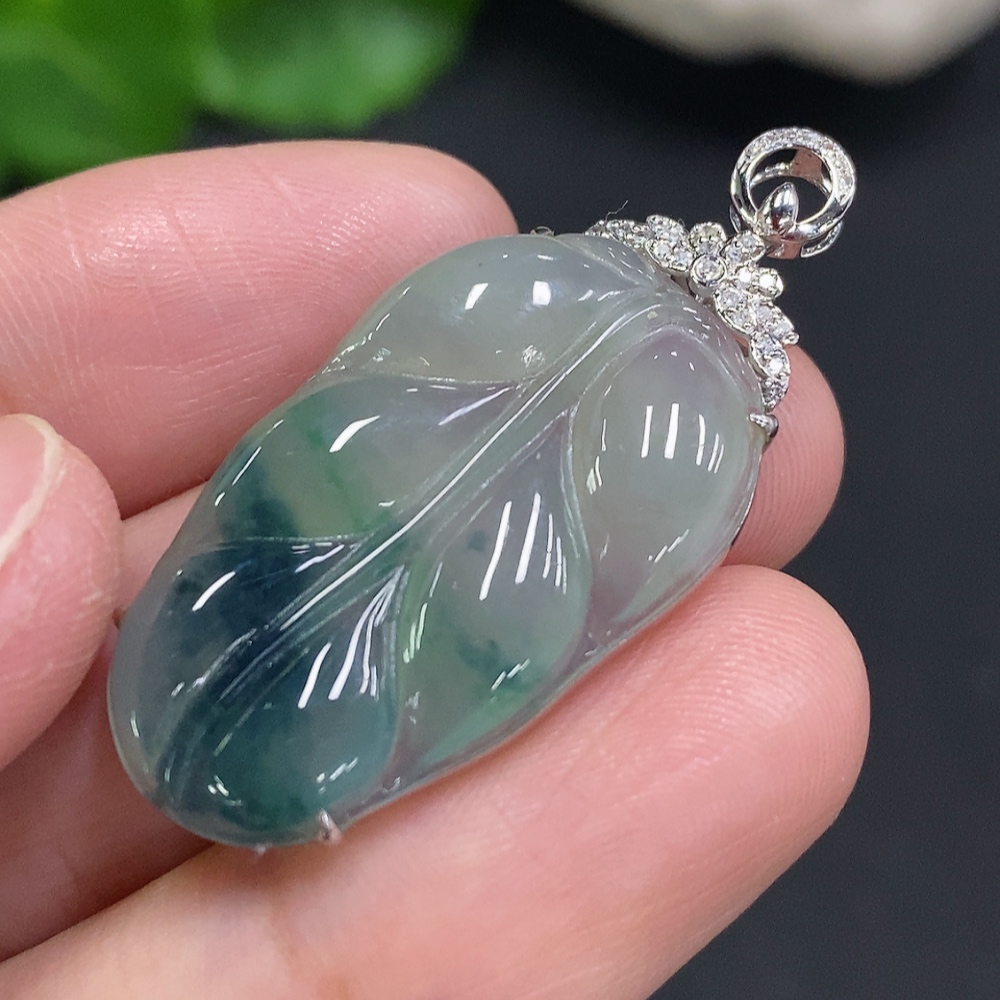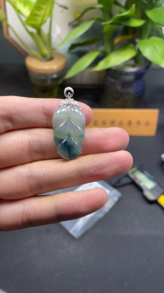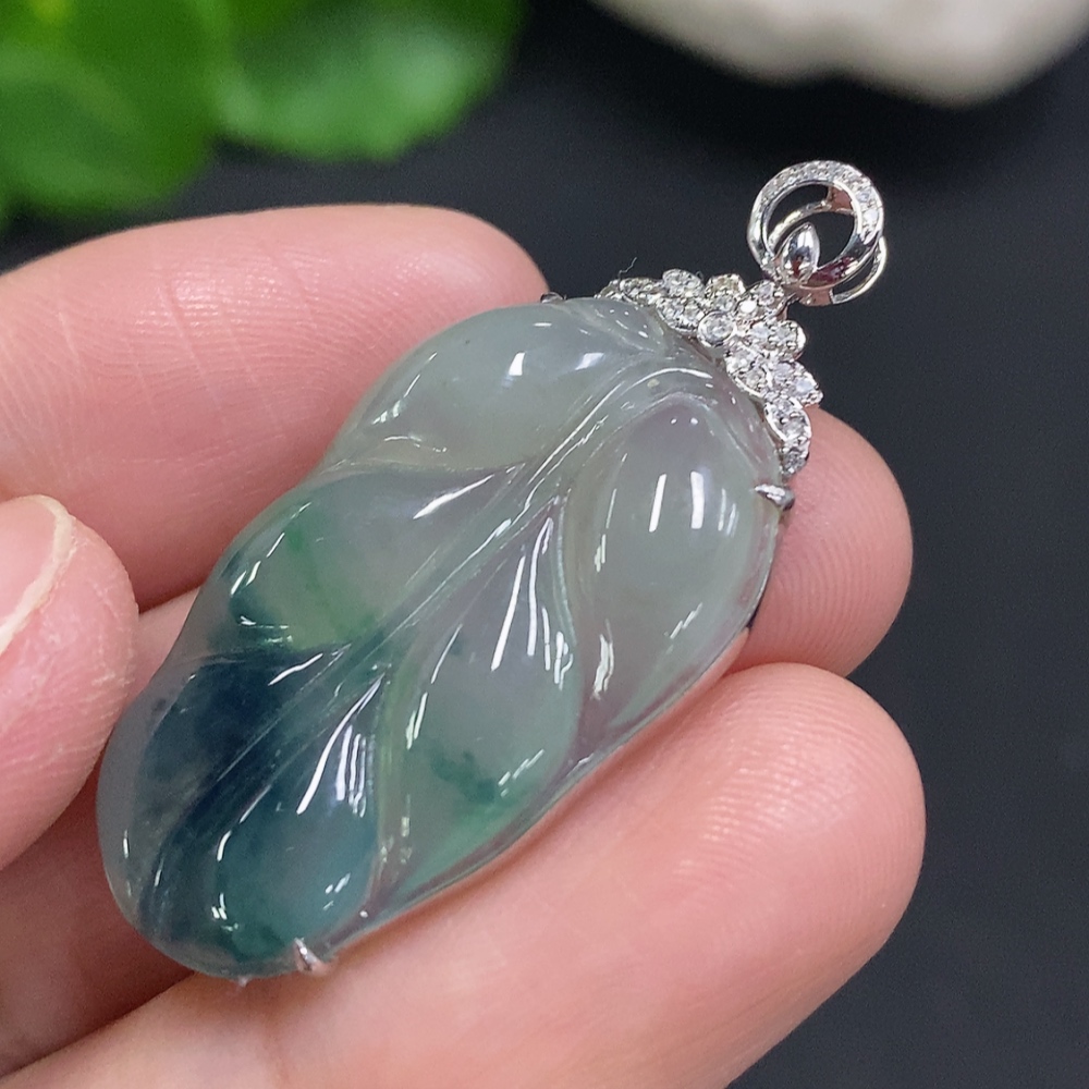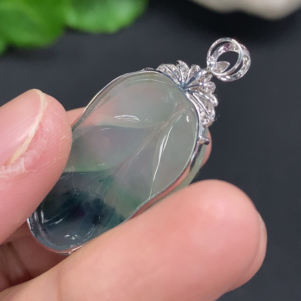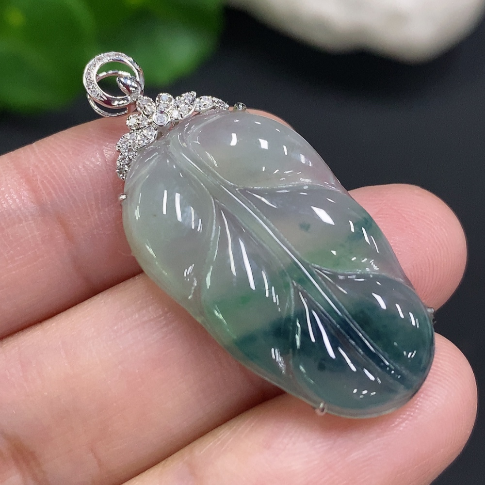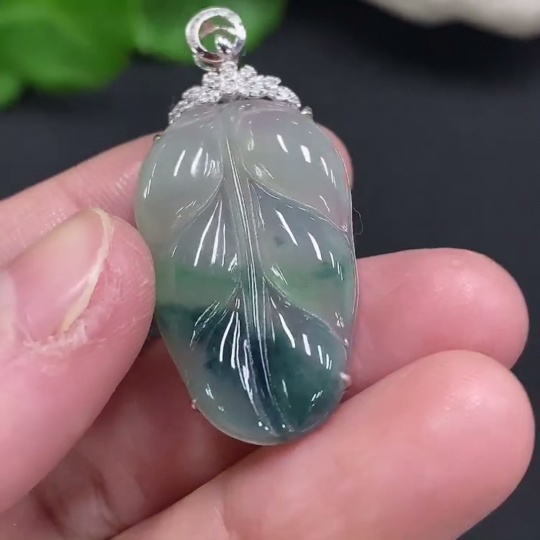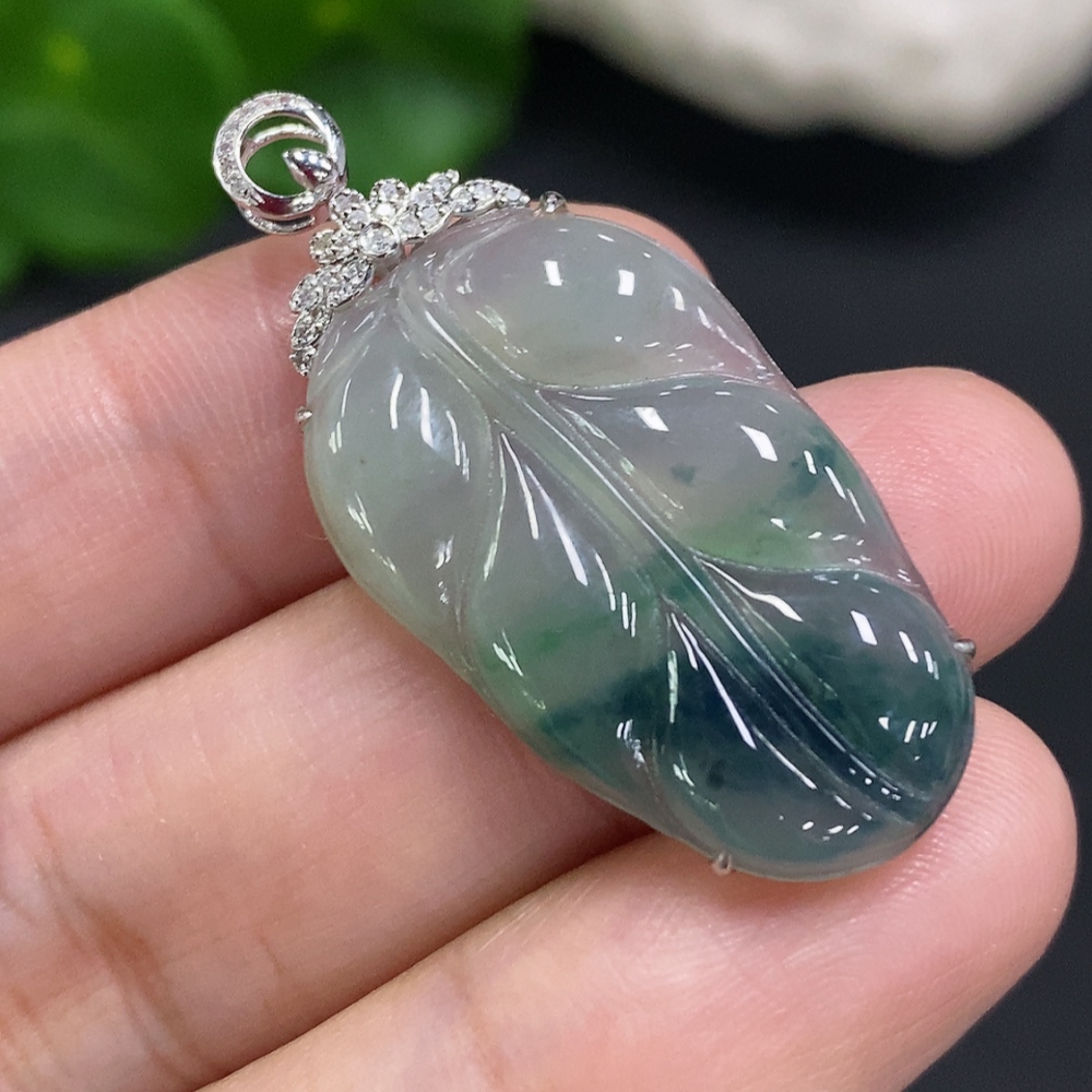 Jadeite Leaf Inlay Pendant 18K Gold Total Weight Approx. 3.9g (With Diamond Accents)