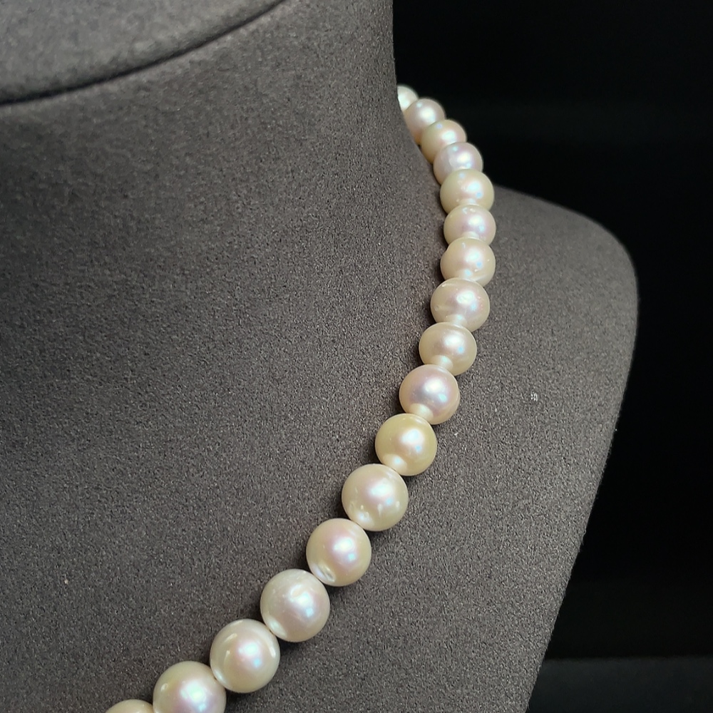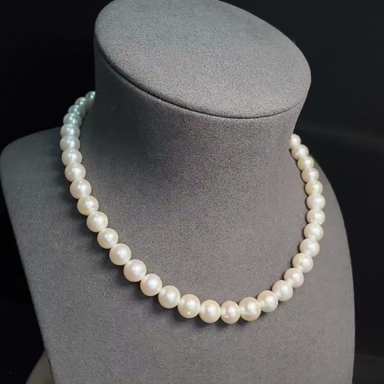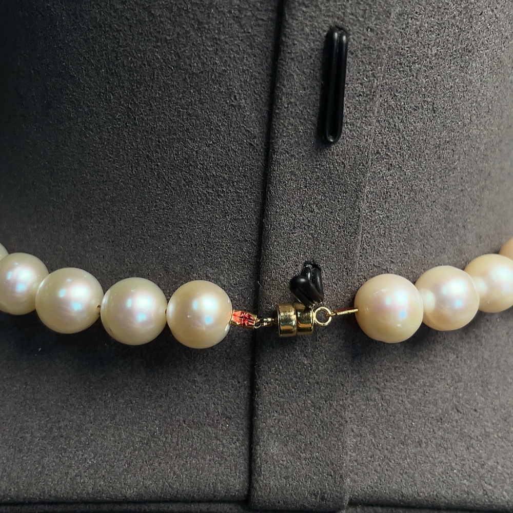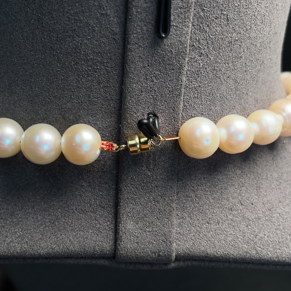 Pearl bead strand, marked red parts non-gold, other surfaces tested as 33% Au, clasp interior untestable, string untestable, total weight approx. 45.89g, size 8.5-9.2mm