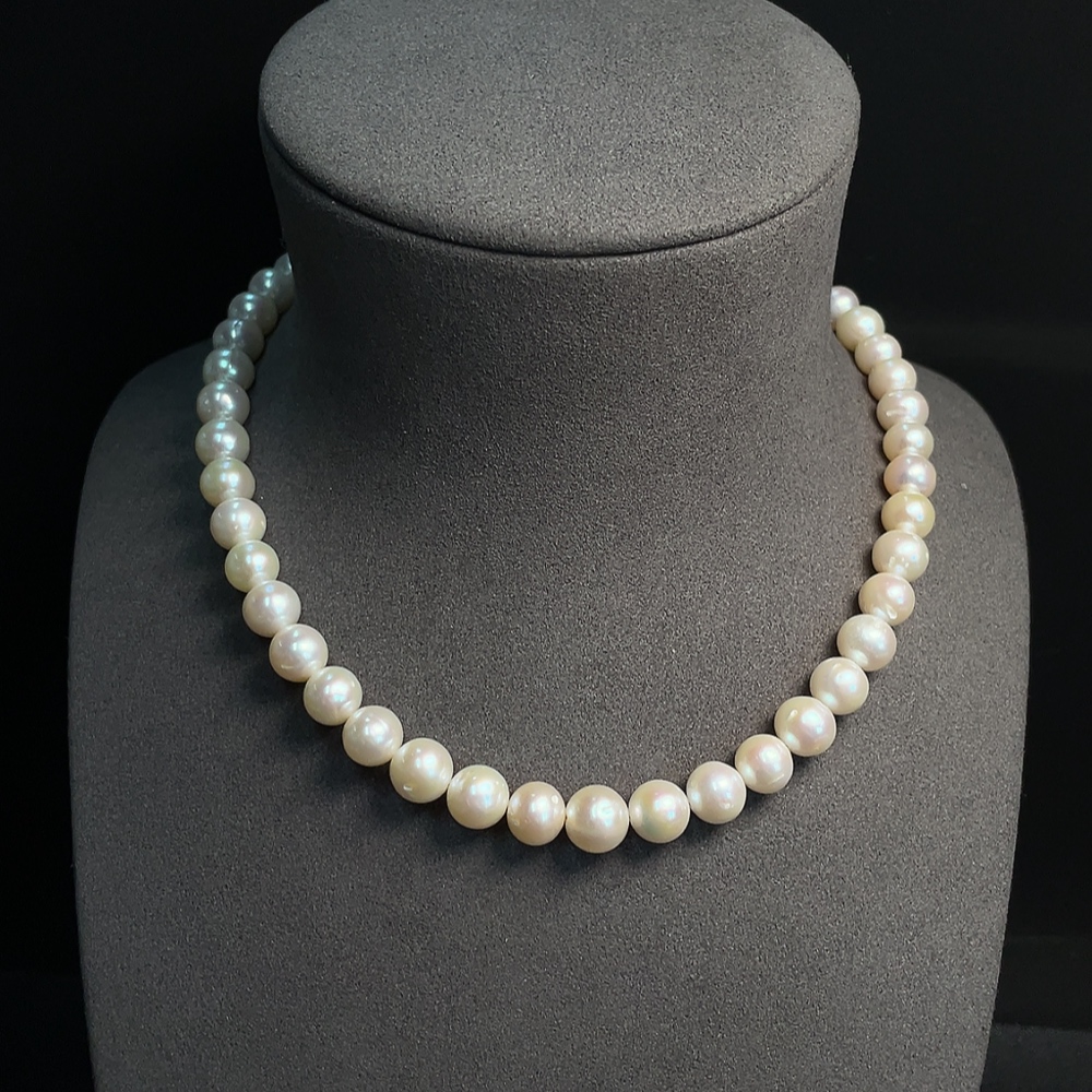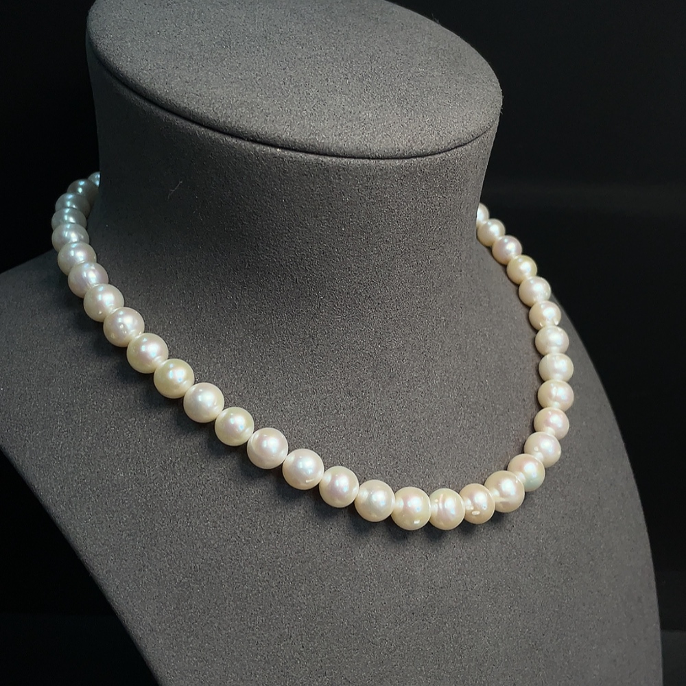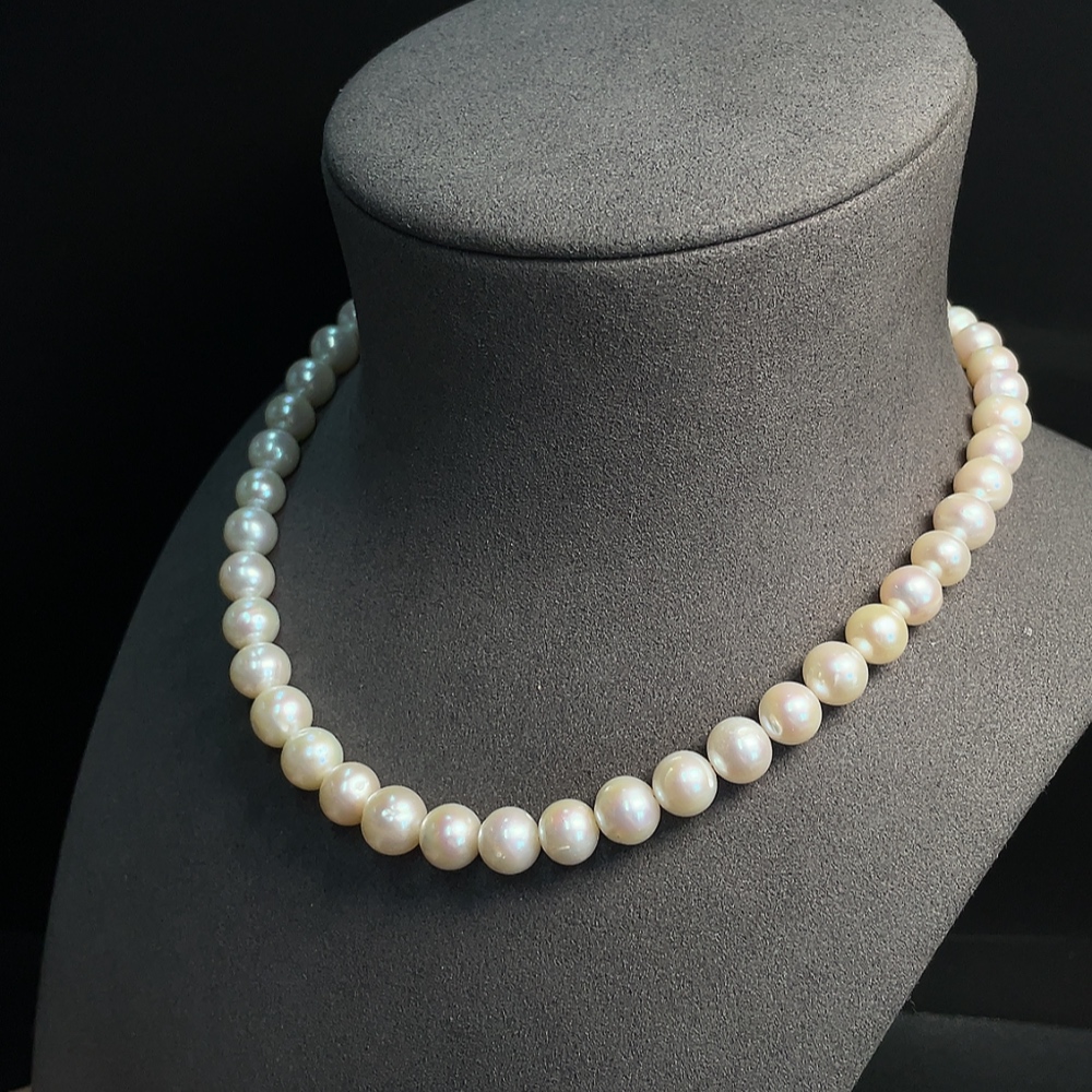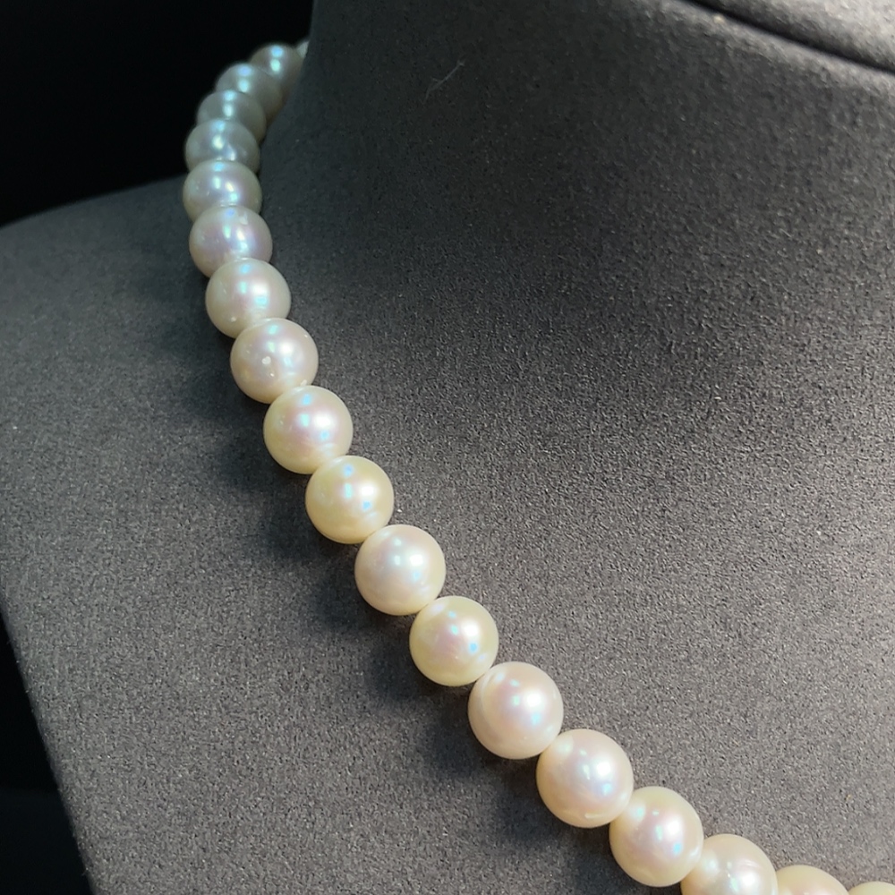 Pearl bead strand, marked red parts non-gold, other surfaces tested as 33% Au, clasp interior untestable, string untestable, total weight approx. 45.89g, size 8.5-9.2mm