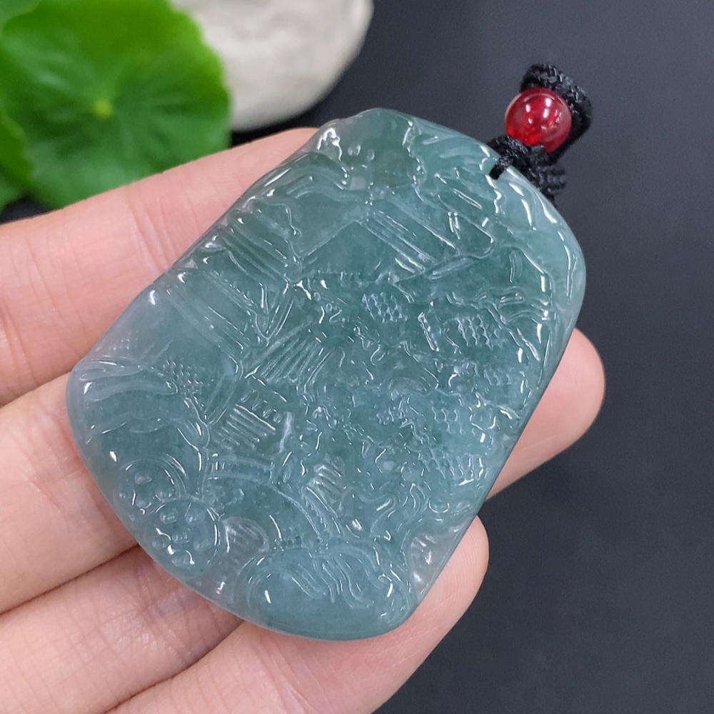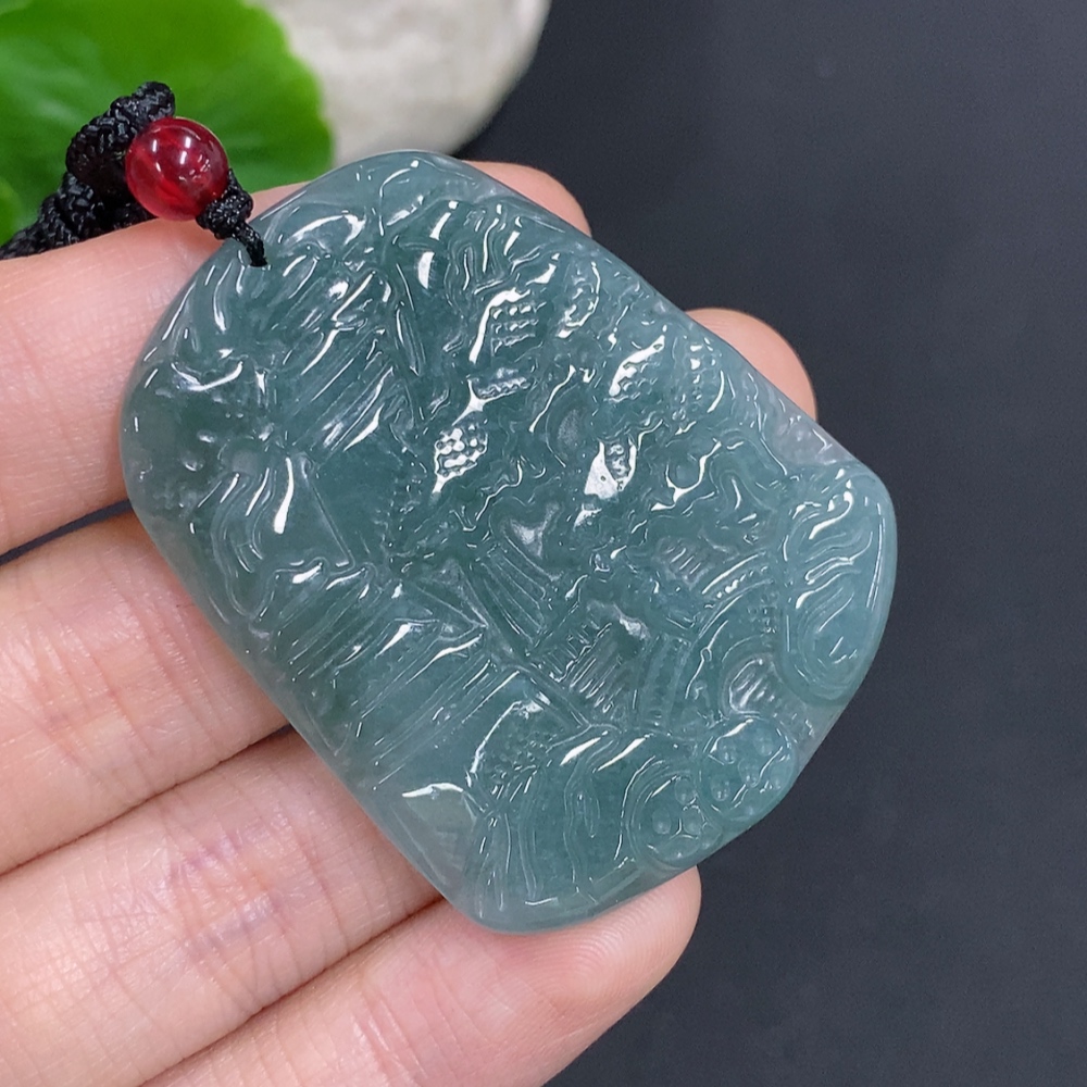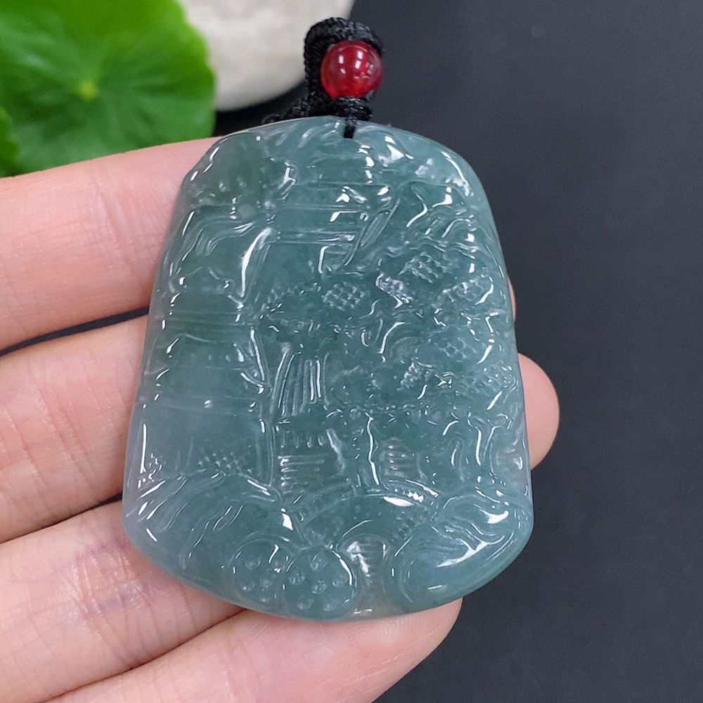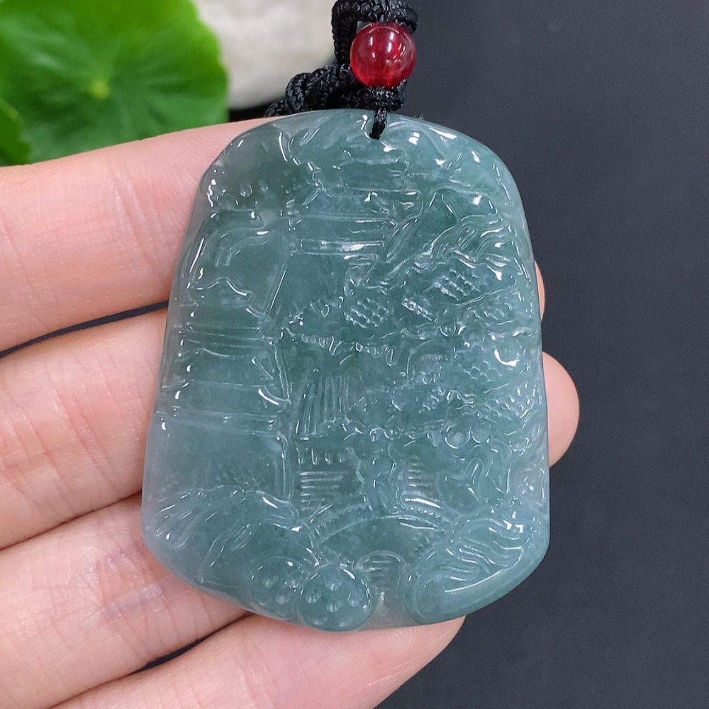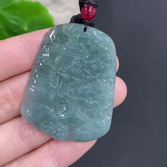 Jadeite landscape pendant with cord, total weight approximately 18.3g (matching beads non-A)