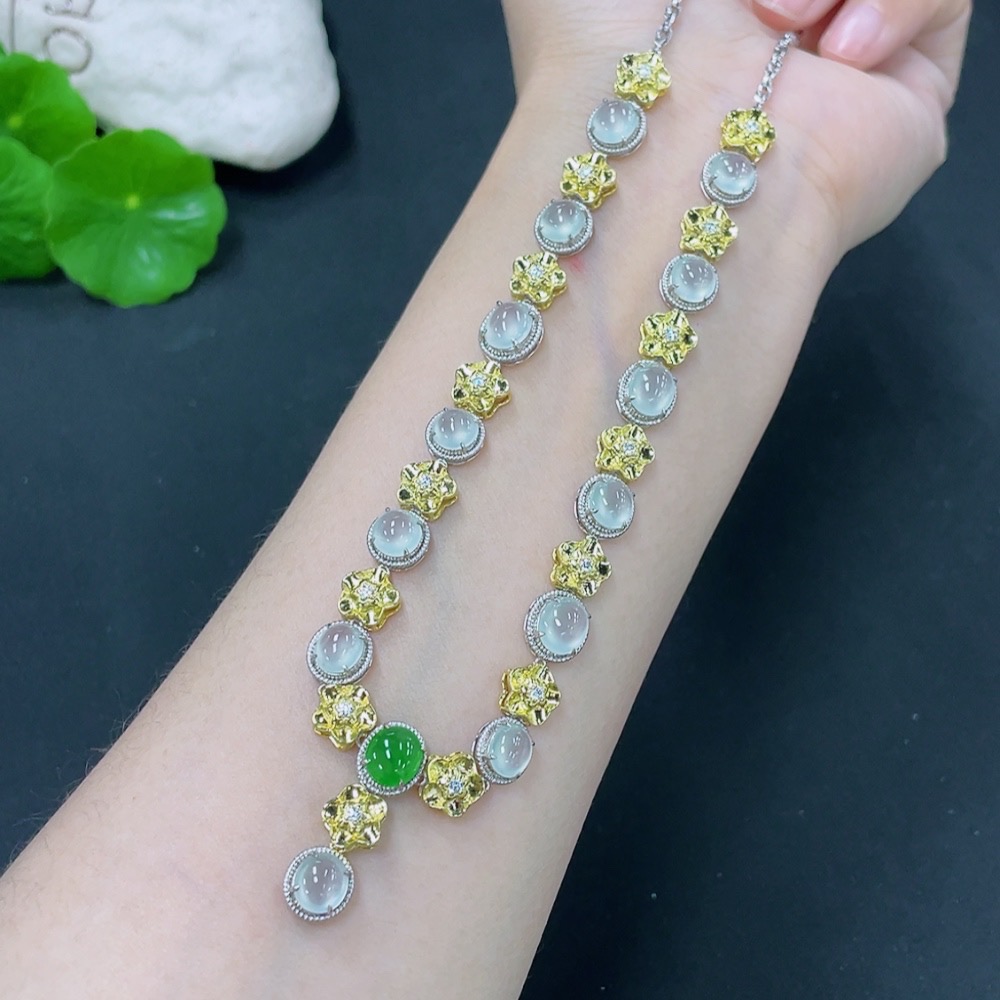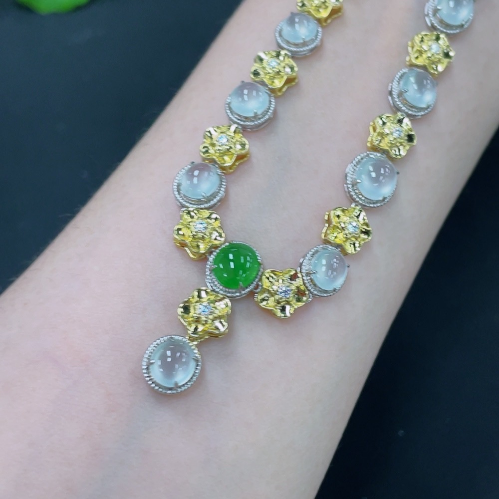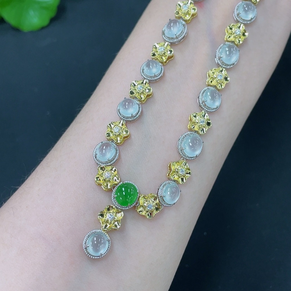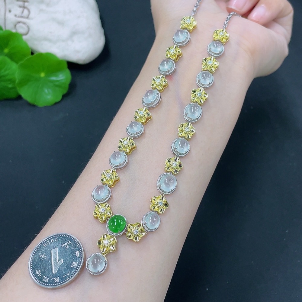 Jadeite Cabochon Inlaid Set Necklace, Non-Gold Inlaid, Total Weight Approx. 19.78g