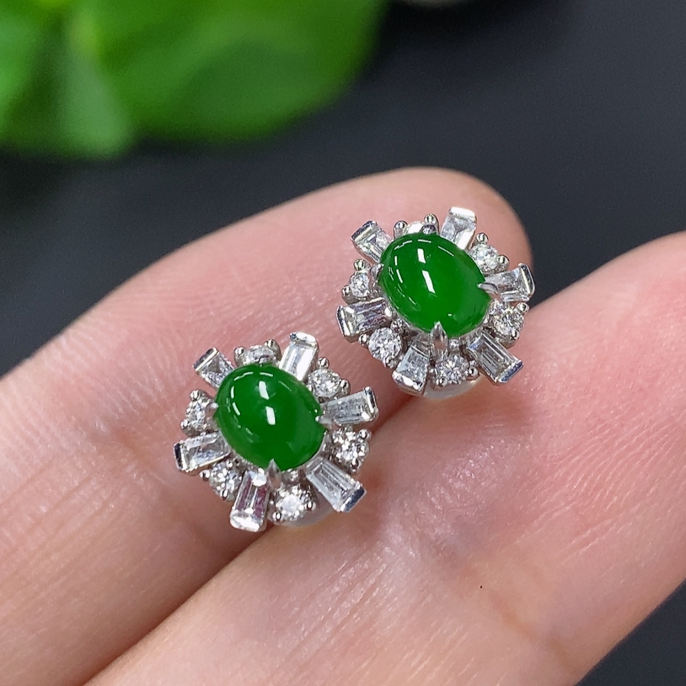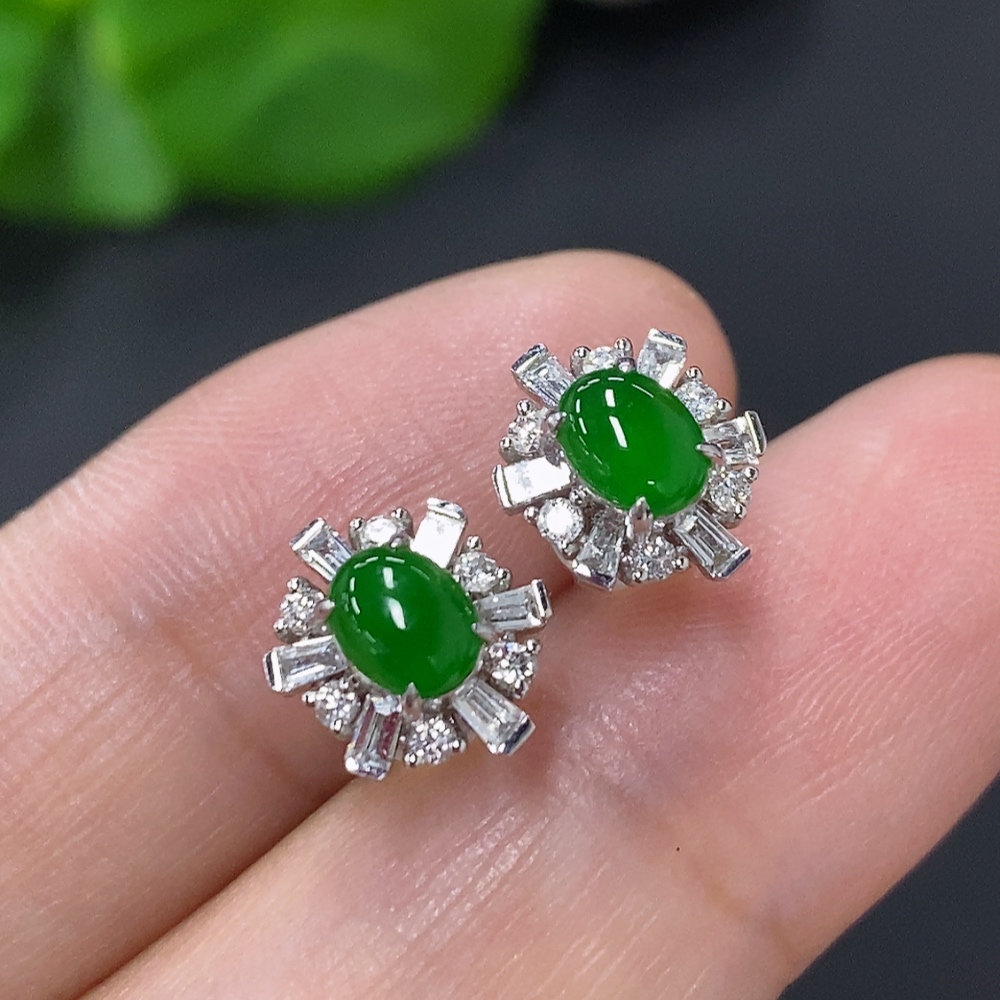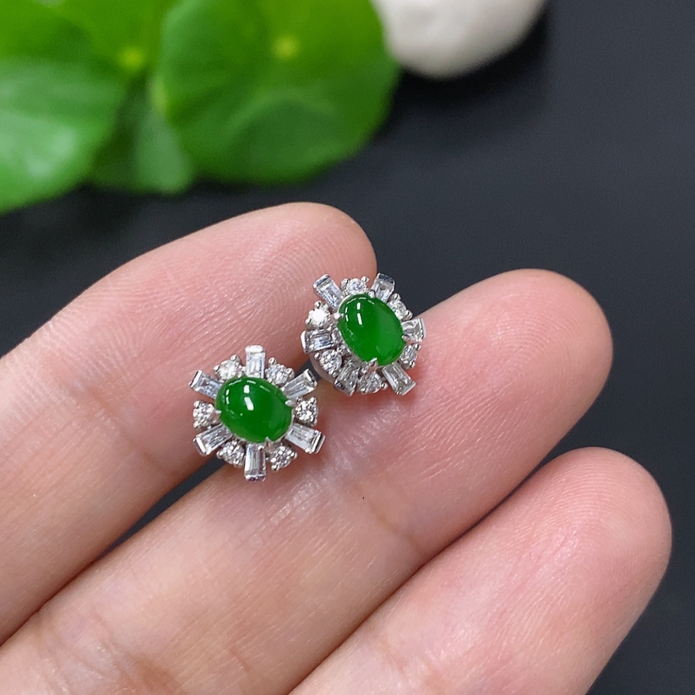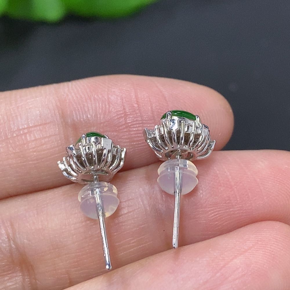 Jadeite cabochon stud earrings in 18K gold with diamond accents, total weight approximately 2.4g (excluding ear backs)