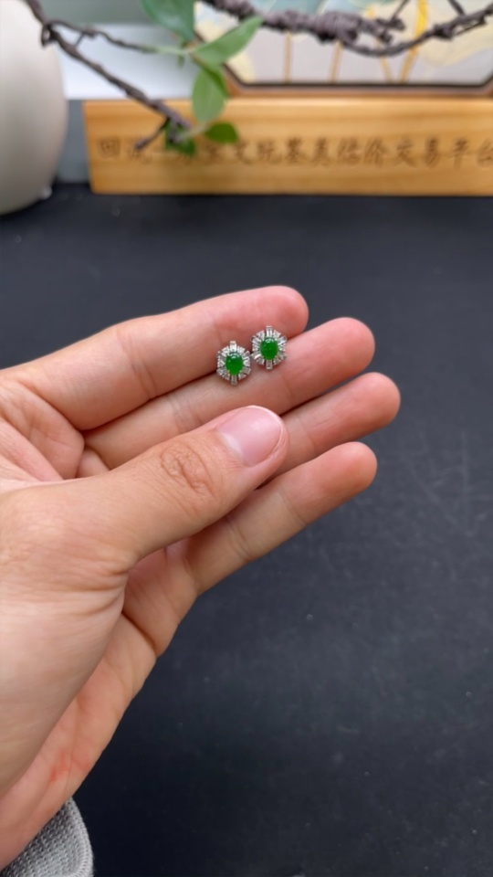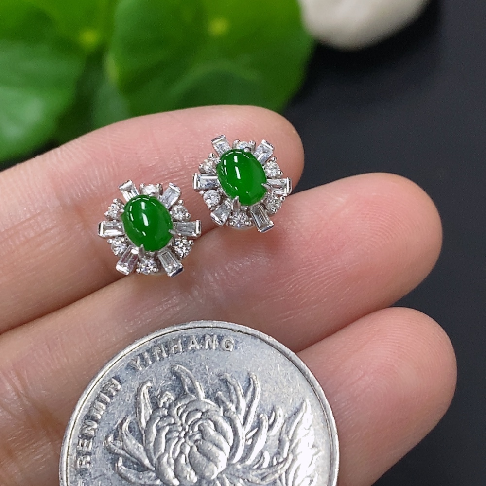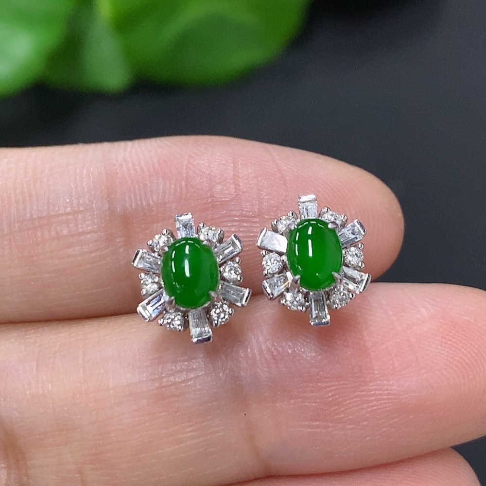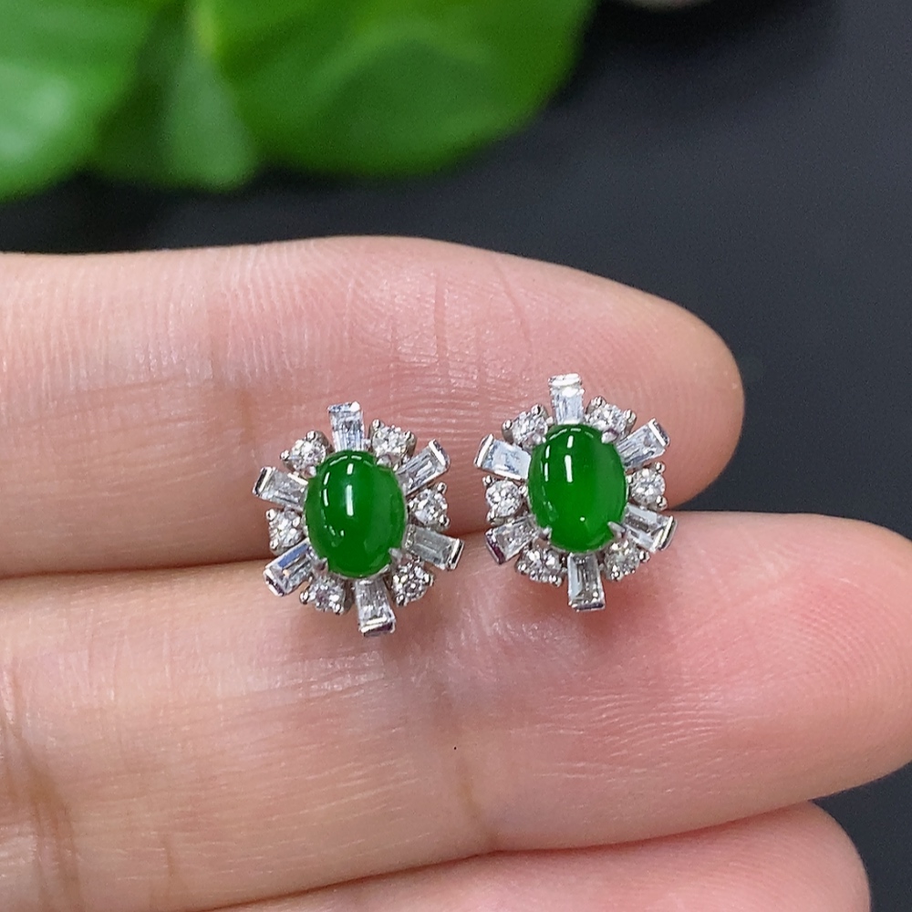 Jadeite cabochon stud earrings in 18K gold with diamond accents, total weight approximately 2.4g (excluding ear backs)