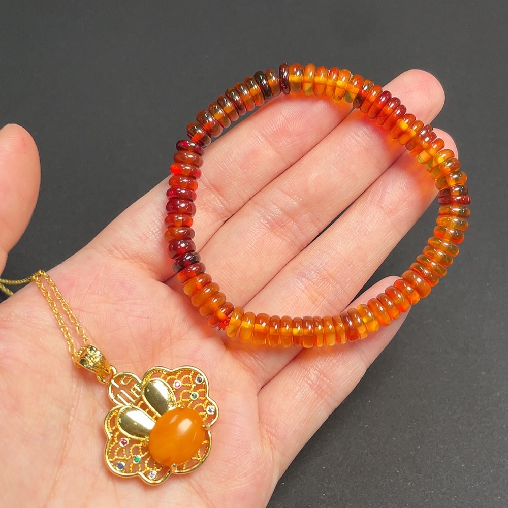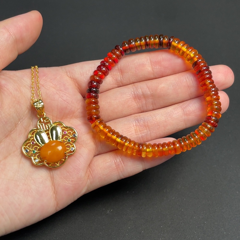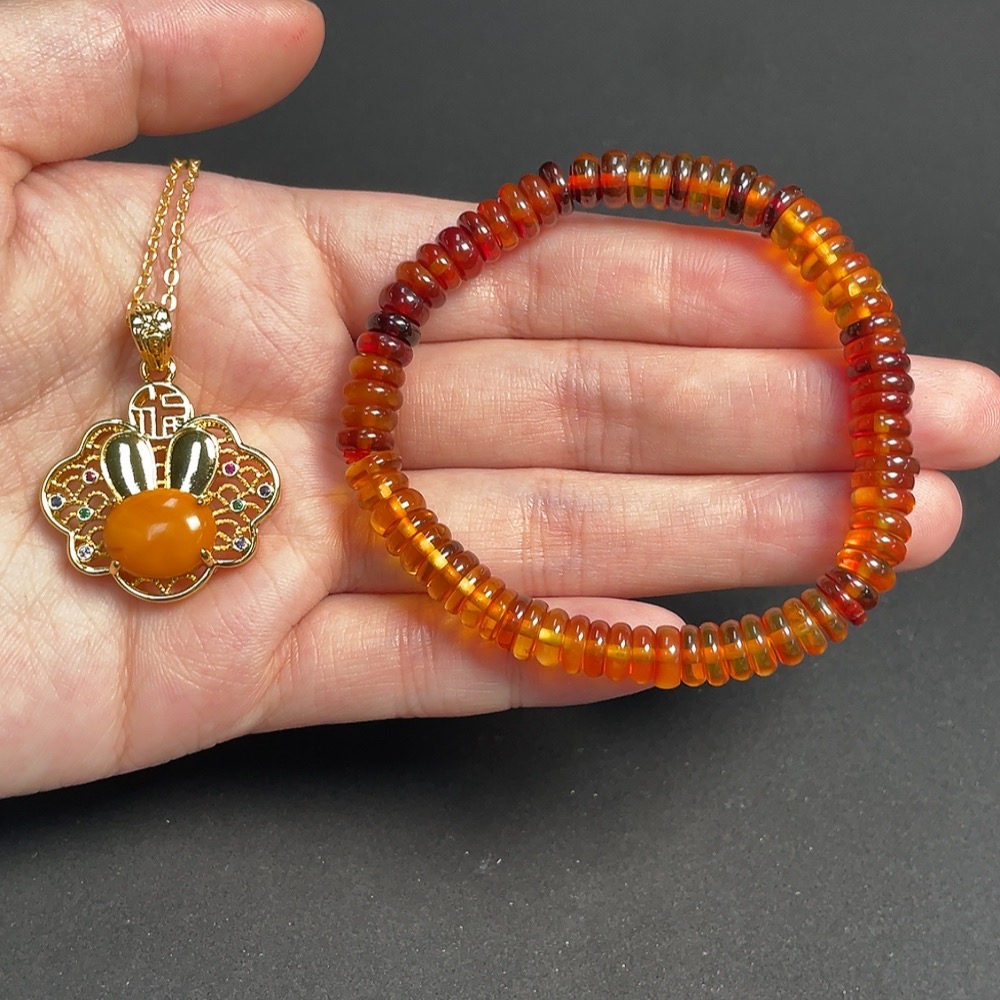 Amber and beeswax inlaid pendant + bracelet, non-gold inlaid, total weight including chain approx. 13.03g