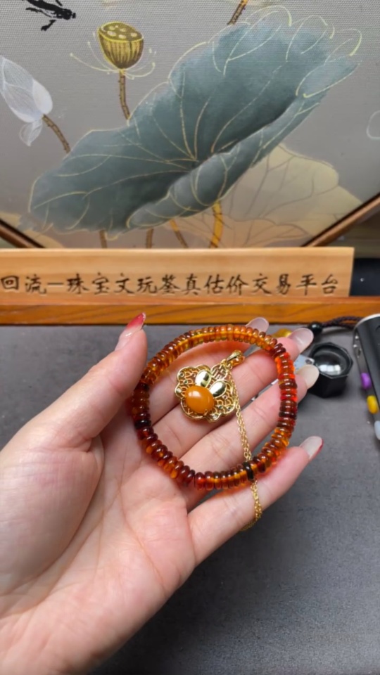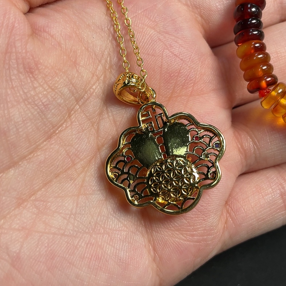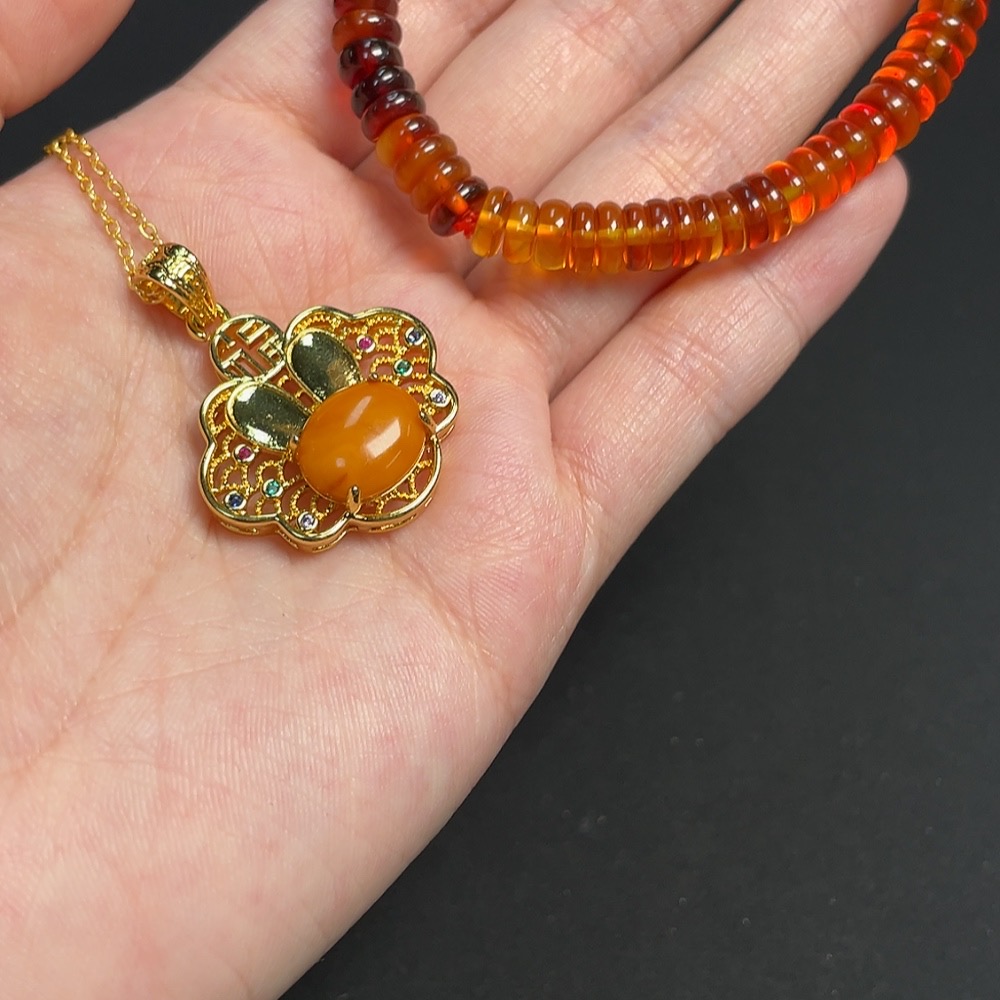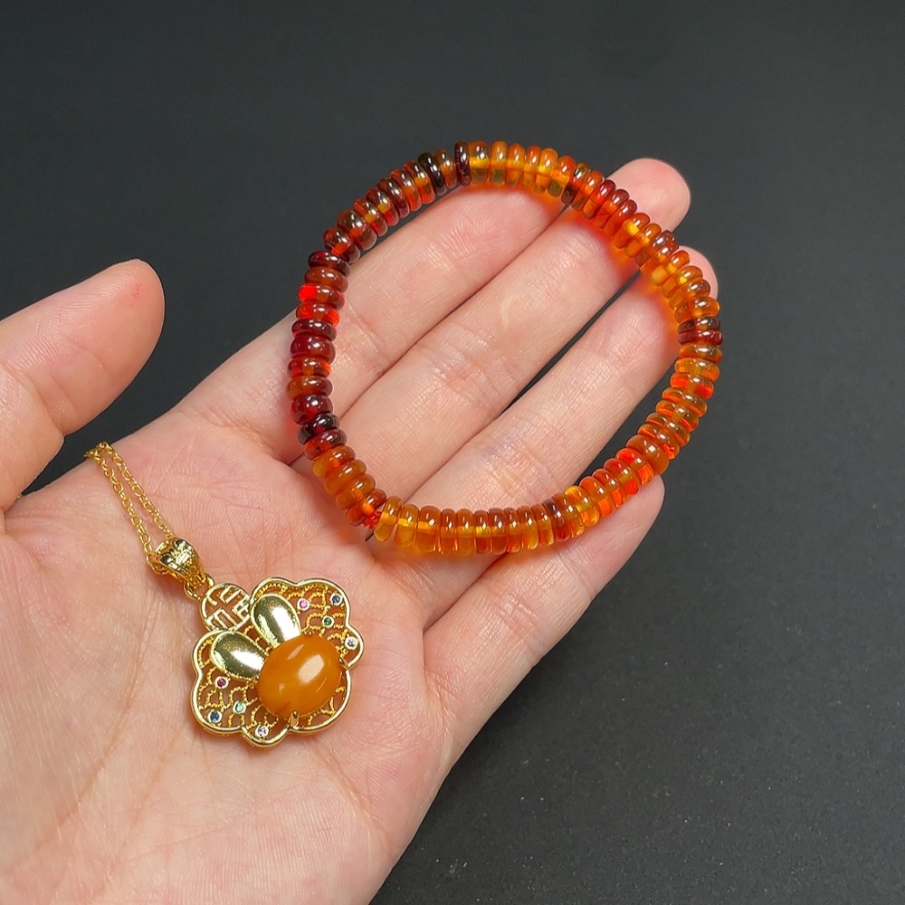 Amber and beeswax inlaid pendant + bracelet, non-gold inlaid, total weight including chain approx. 13.03g