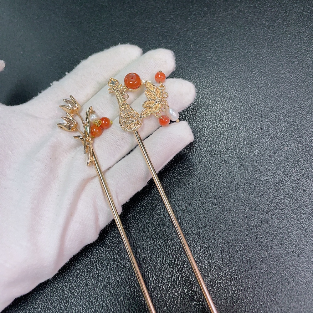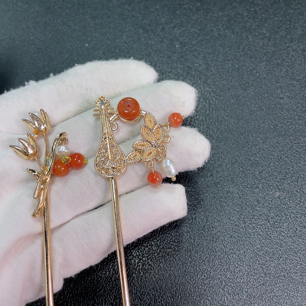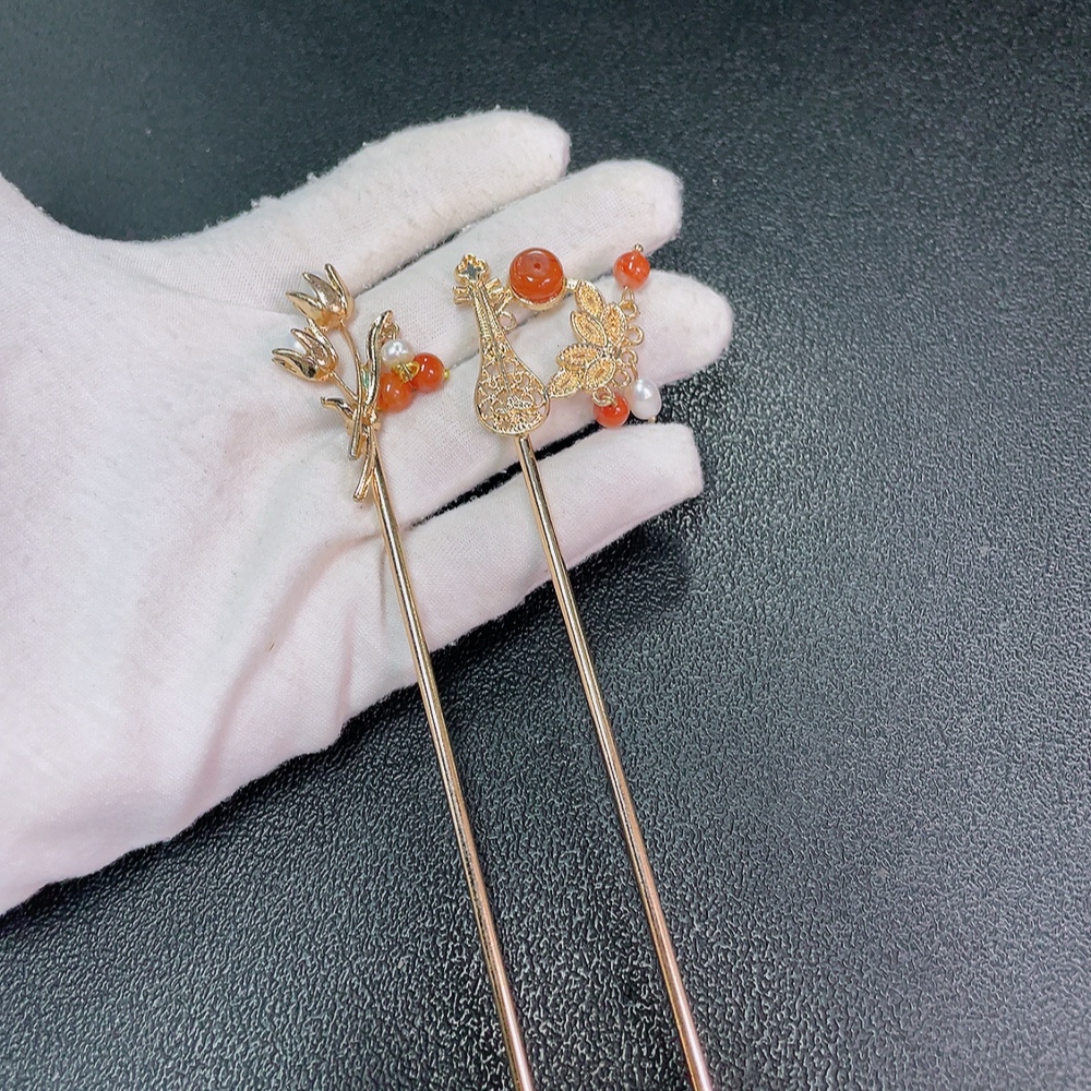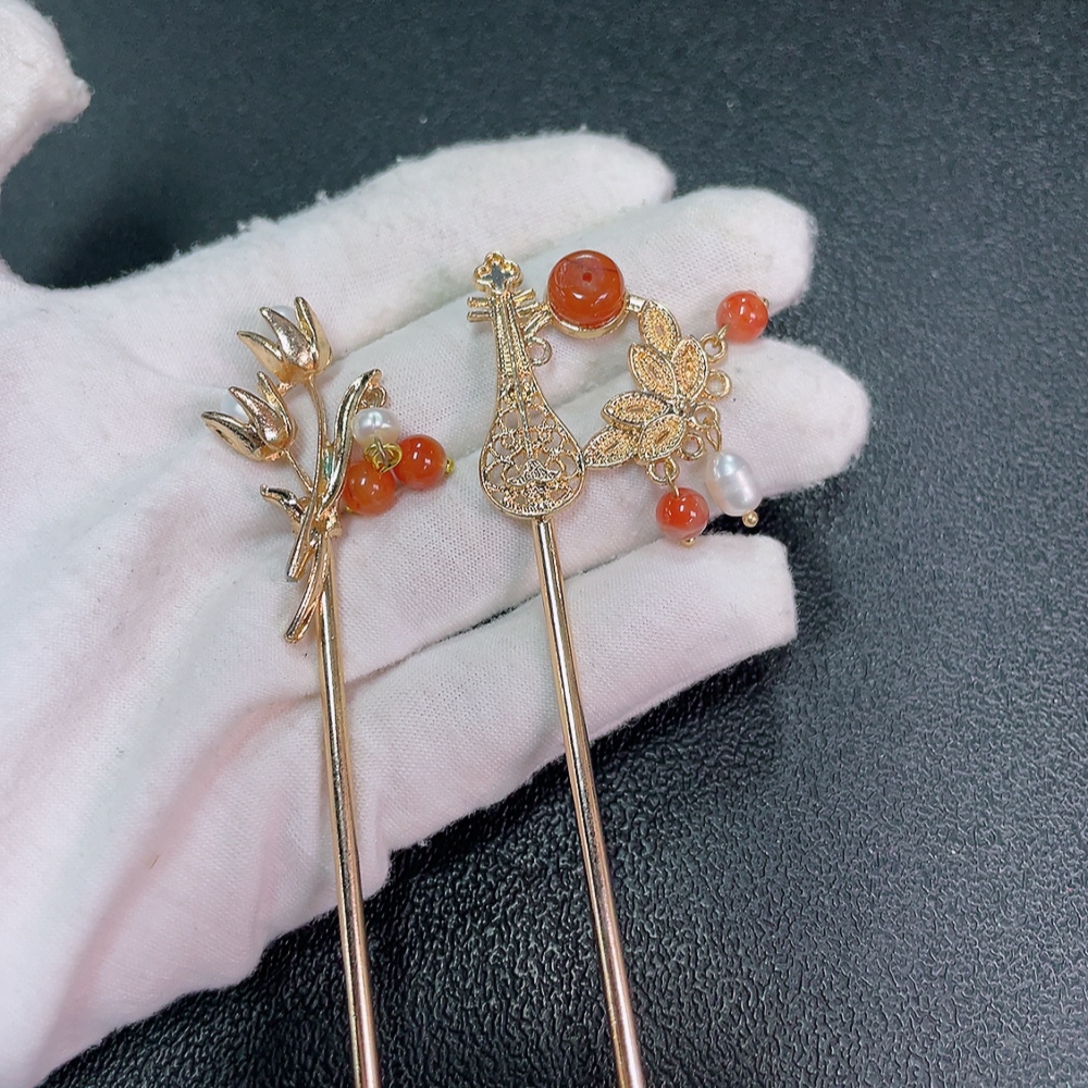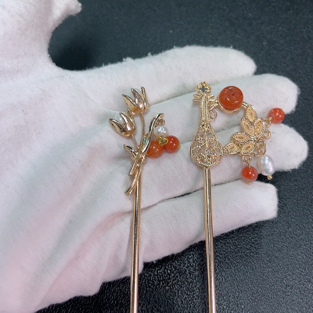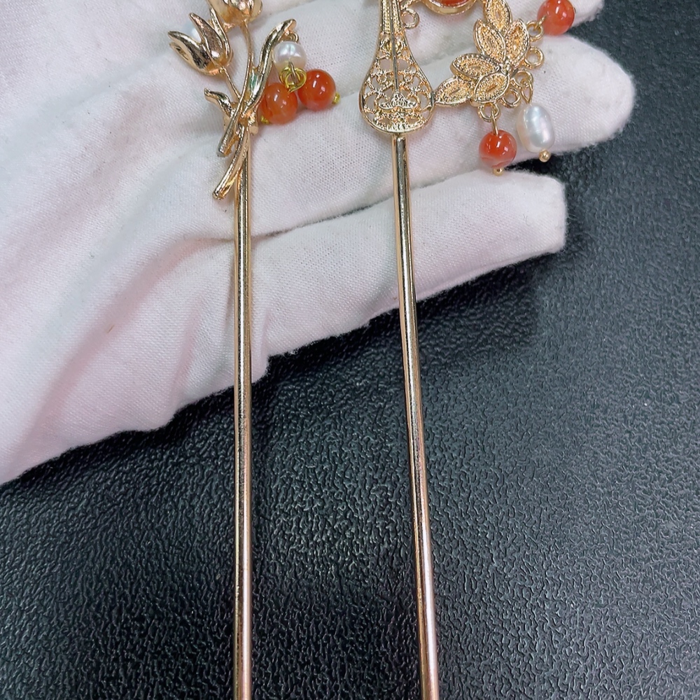Red Agate Hairpin with Visible Organic Matter and Pearl Accents, Non-Gold, Total Weight Approx. 20.29g, Sell as a Lot
