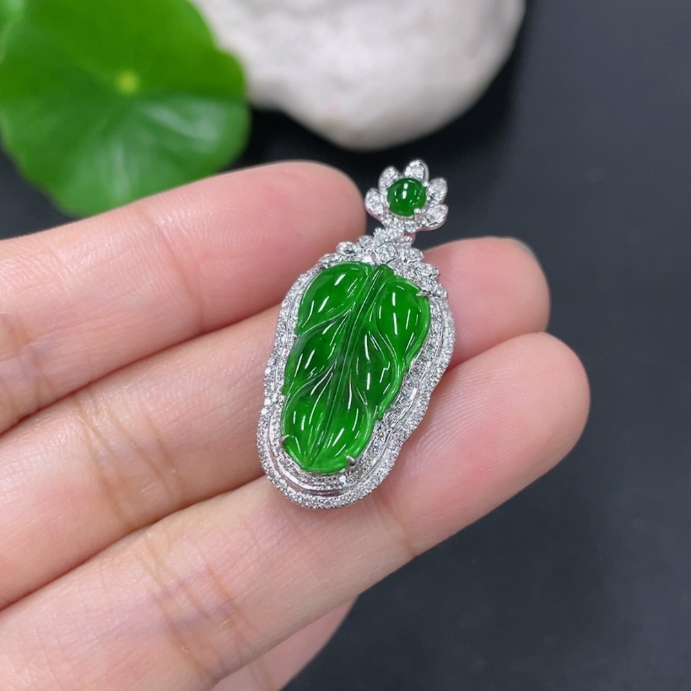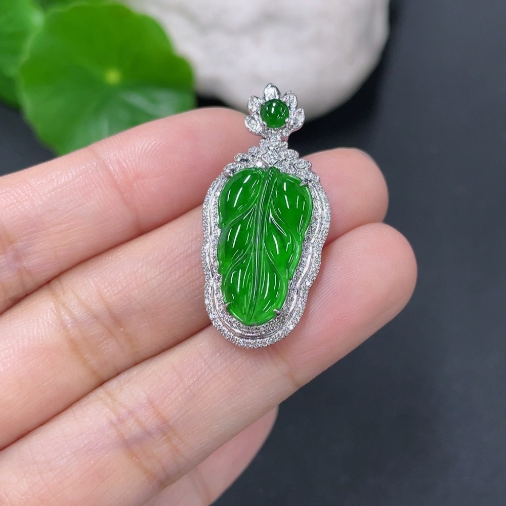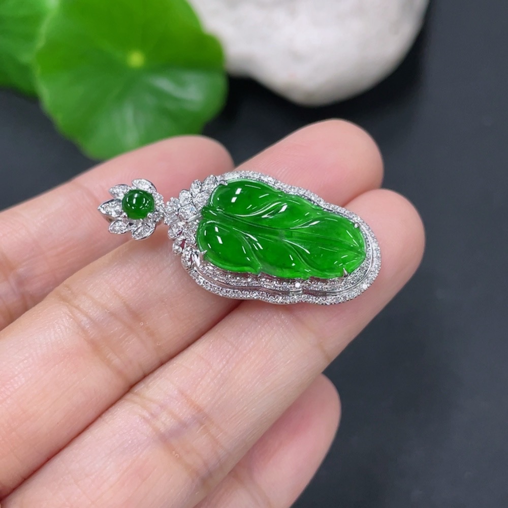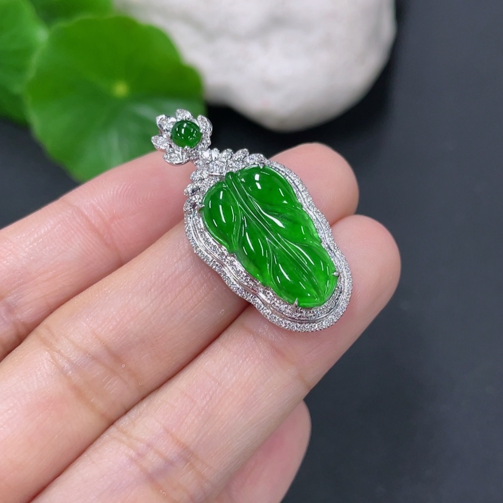 Jadeite Leaf Pendant with 18k Gold and Diamond Accents, Total Weight Approx. 3.66g