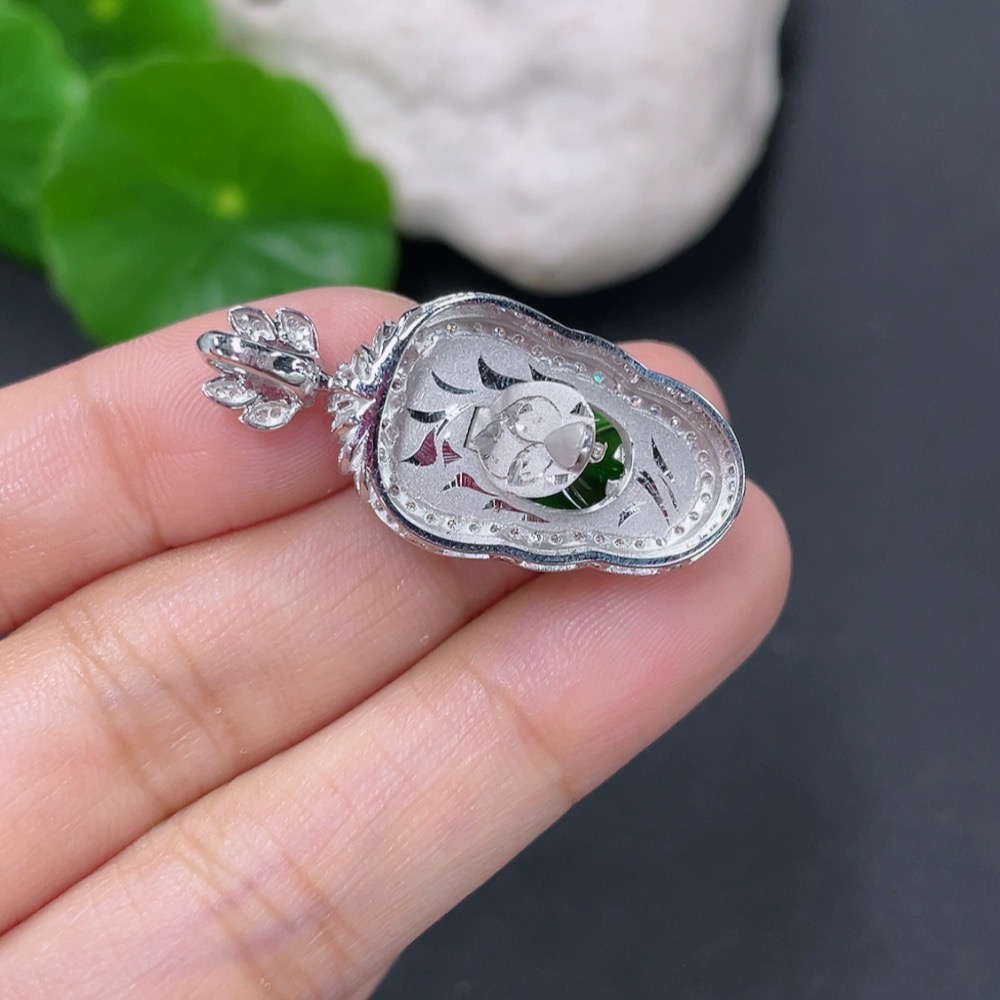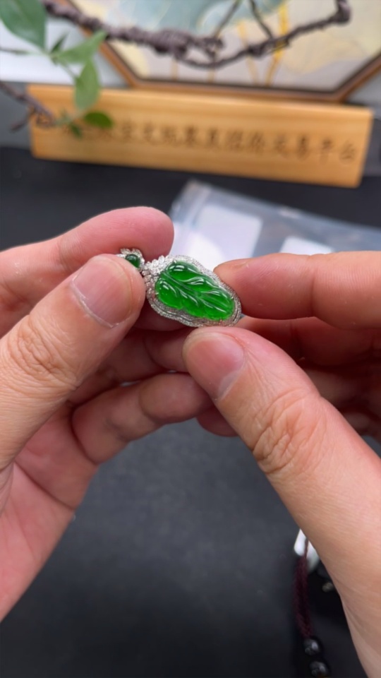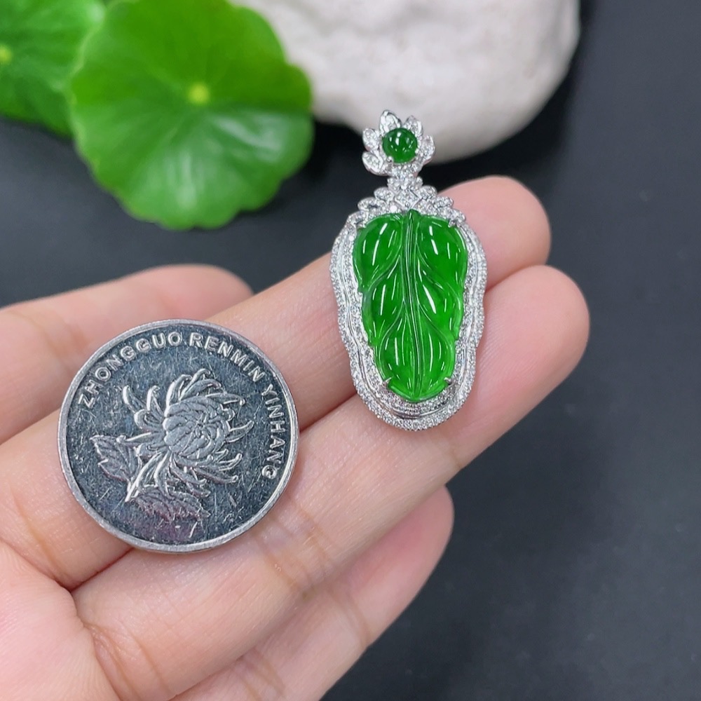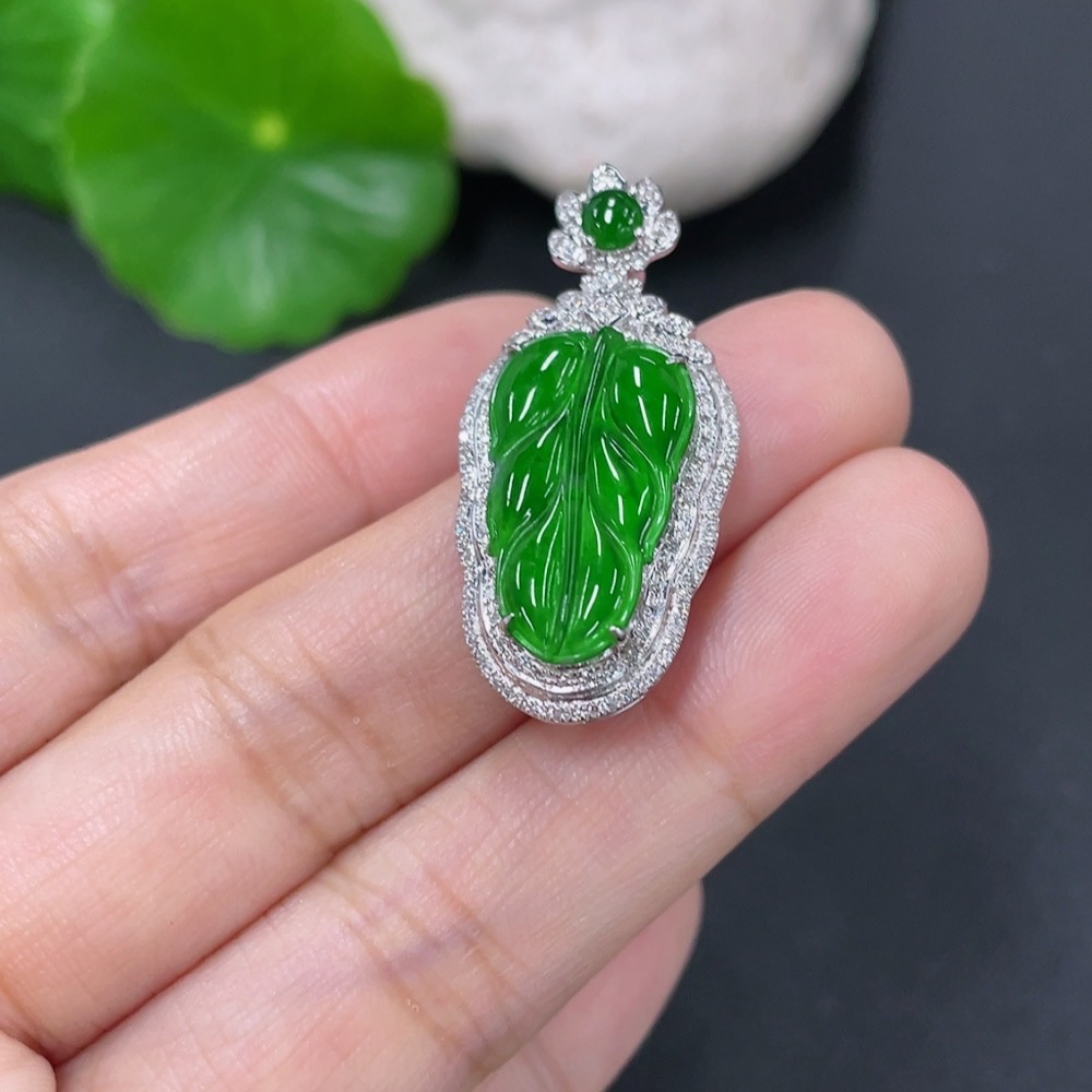 Jadeite Leaf Pendant with 18k Gold and Diamond Accents, Total Weight Approx. 3.66g
