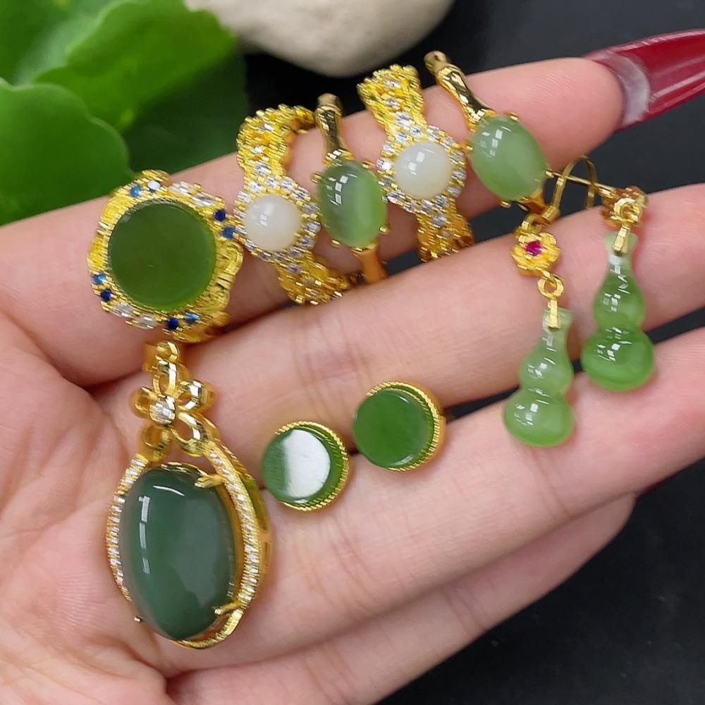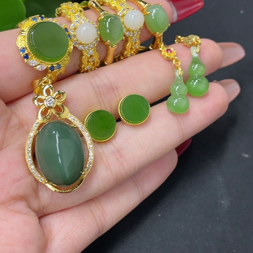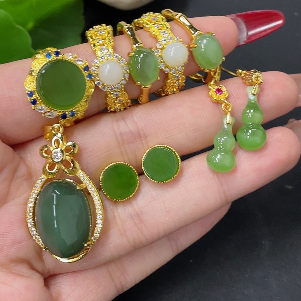 Hetian Jade Inlaid Pendant + Adjustable Ring + Earrings Non-Gold Total Weight Approx. (Including Ear Studs) 23.8g