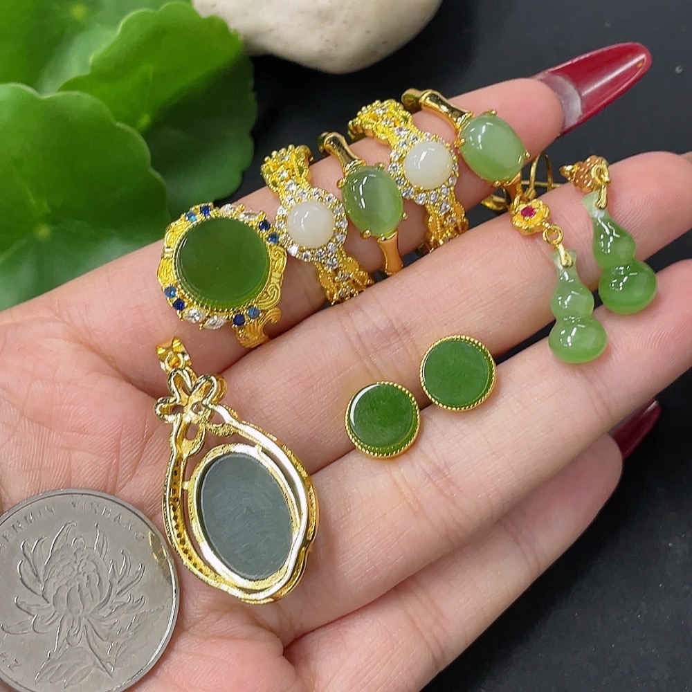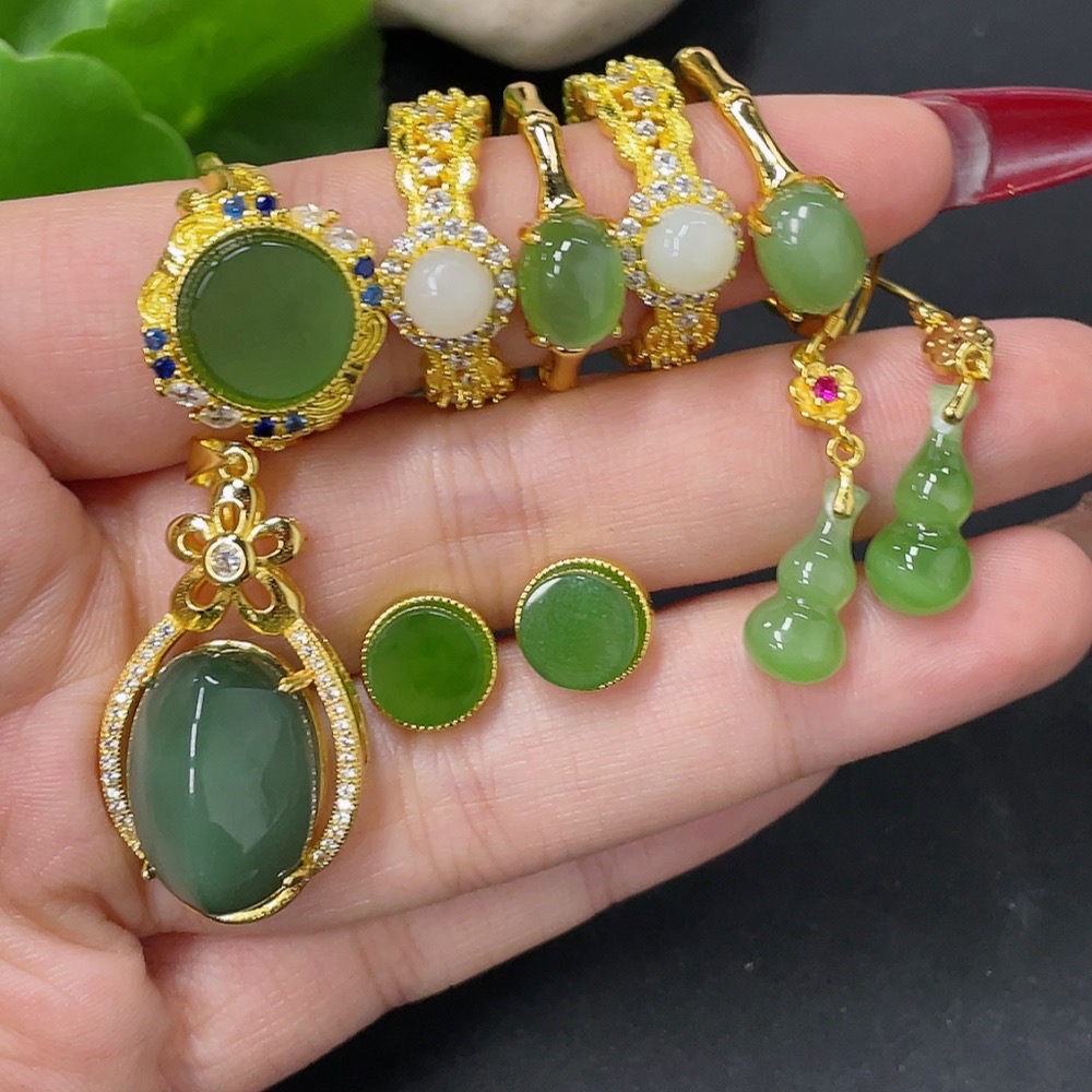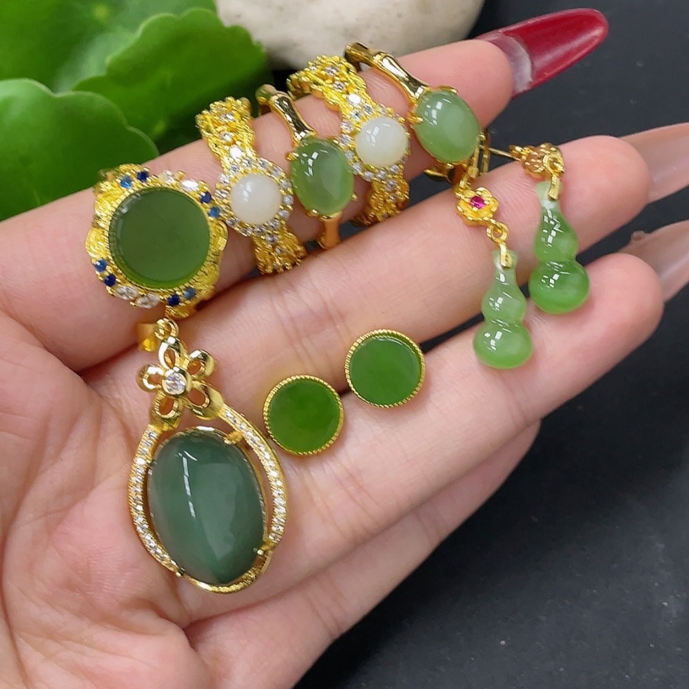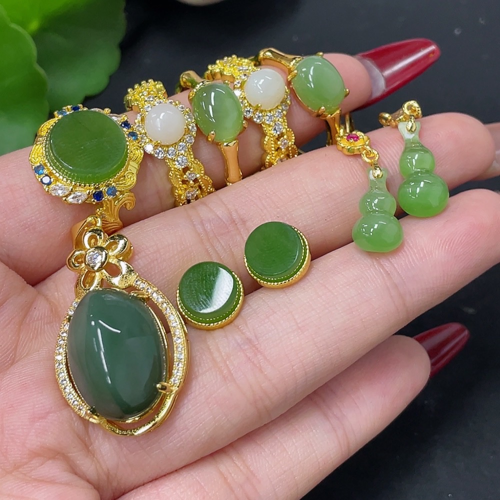 Hetian Jade Inlaid Pendant + Adjustable Ring + Earrings Non-Gold Total Weight Approx. (Including Ear Studs) 23.8g