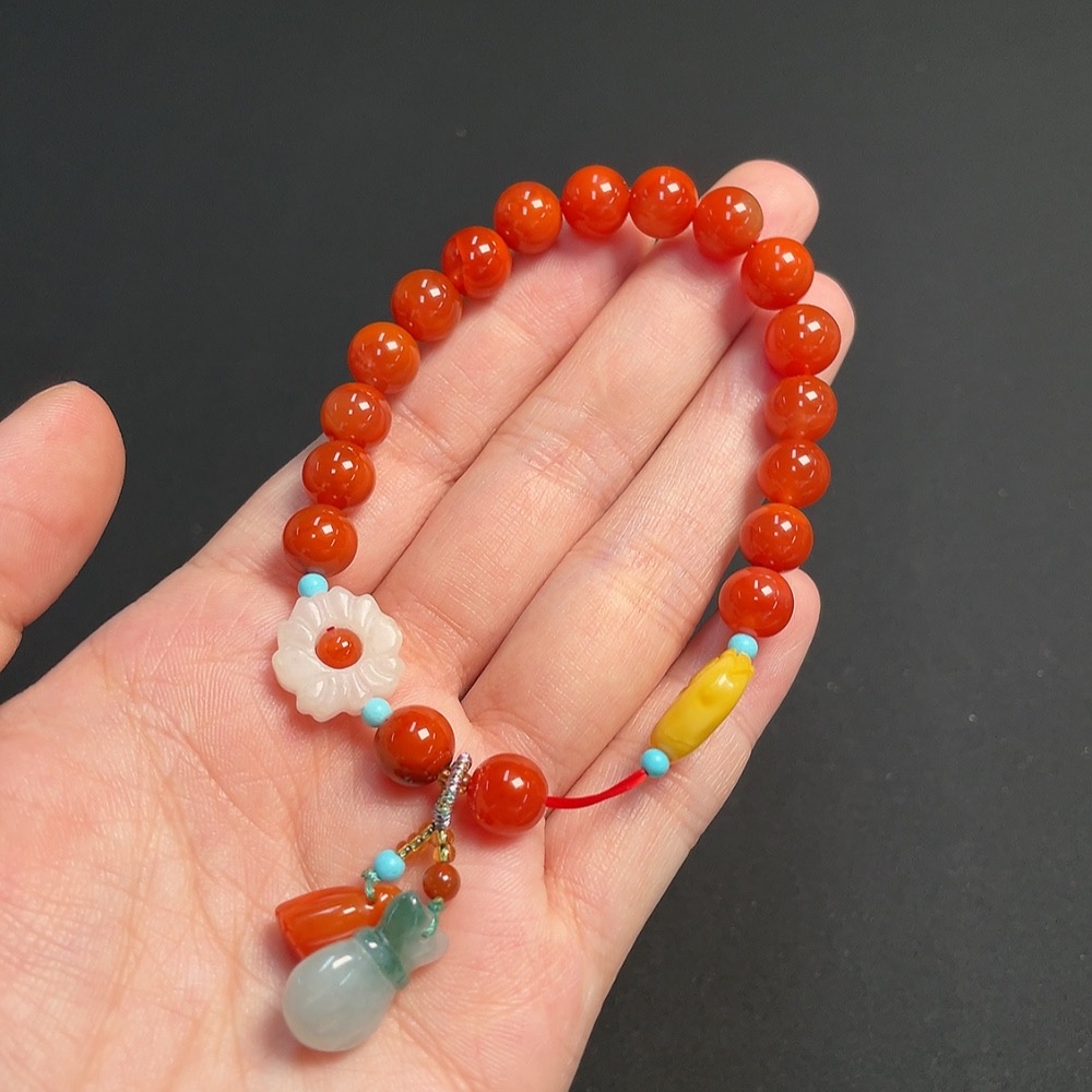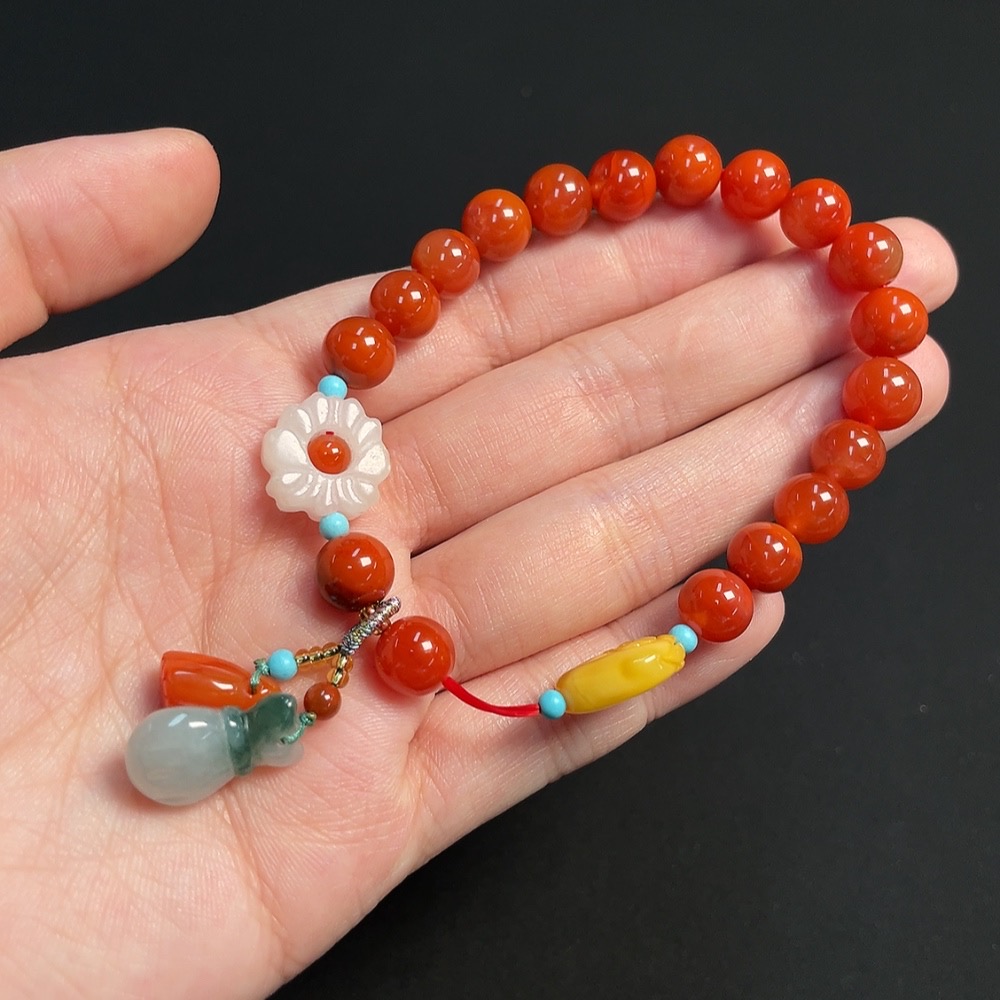 South Red Agate Bracelet, approximately 7.8mm, total weight about 18.42g, visible organic matter, with amber and Hetian Jade, containing other mineral components and jadeite