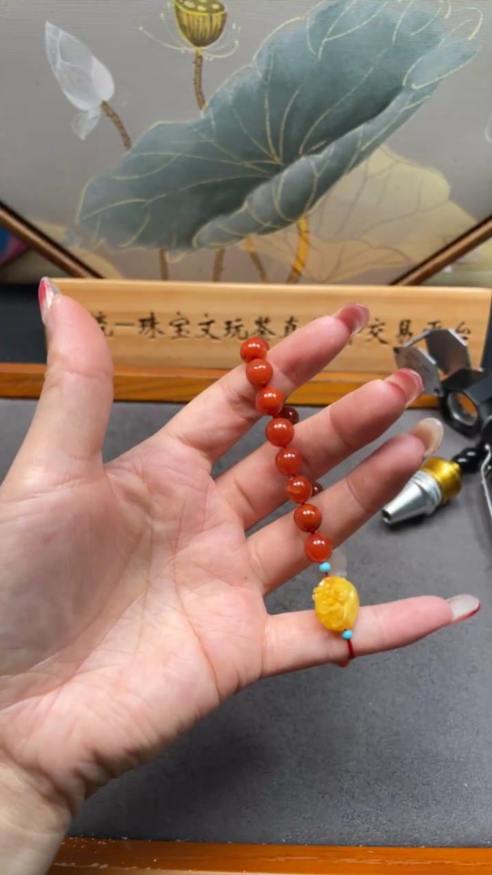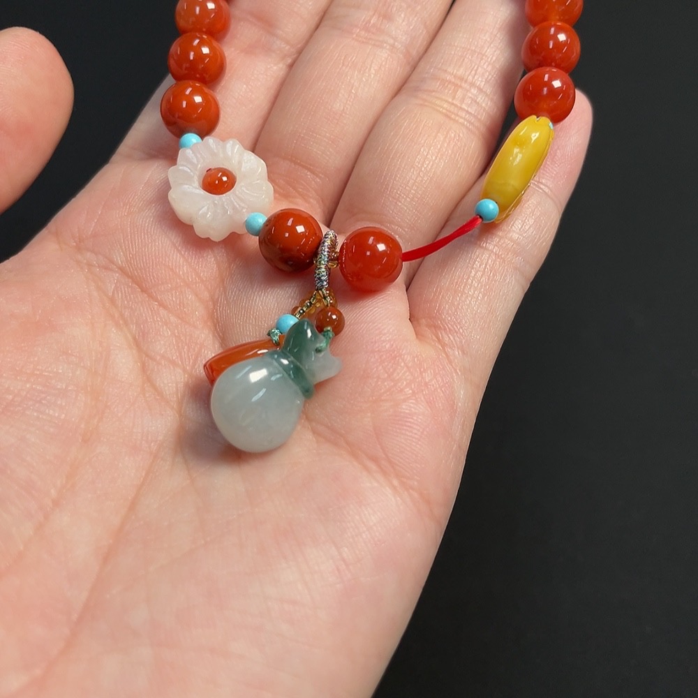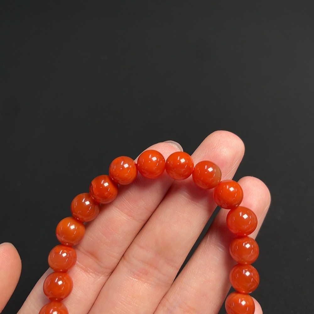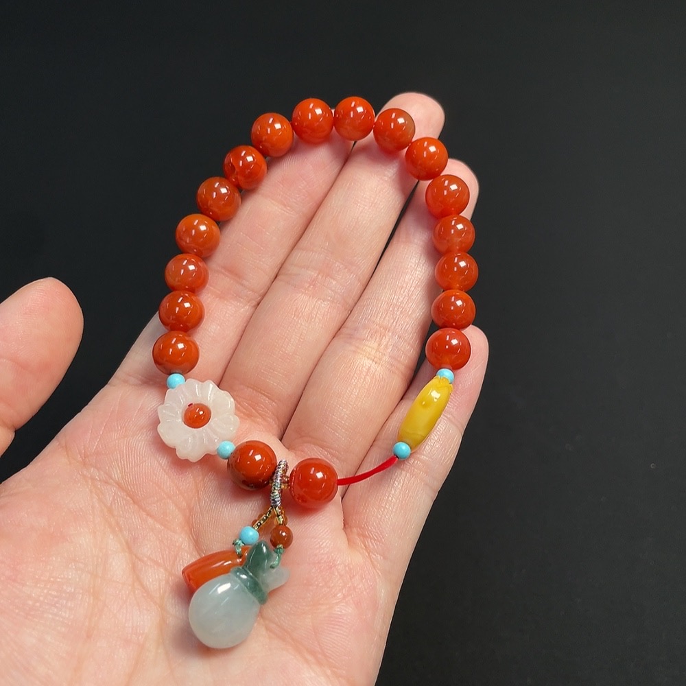 Trezaar - South Red Agate Bracelet, approximately 7.8mm, total weight about 18.42g, visible organic matter, with amber and Hetian Jade, containing other mineral components and jadeite