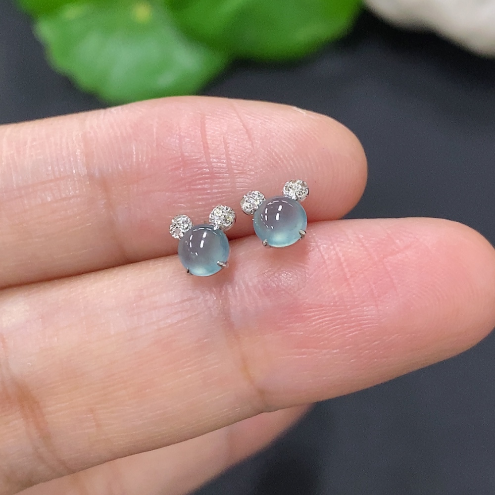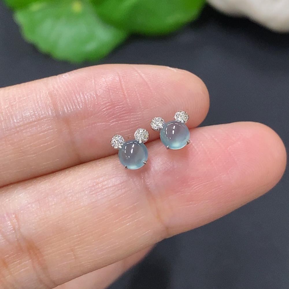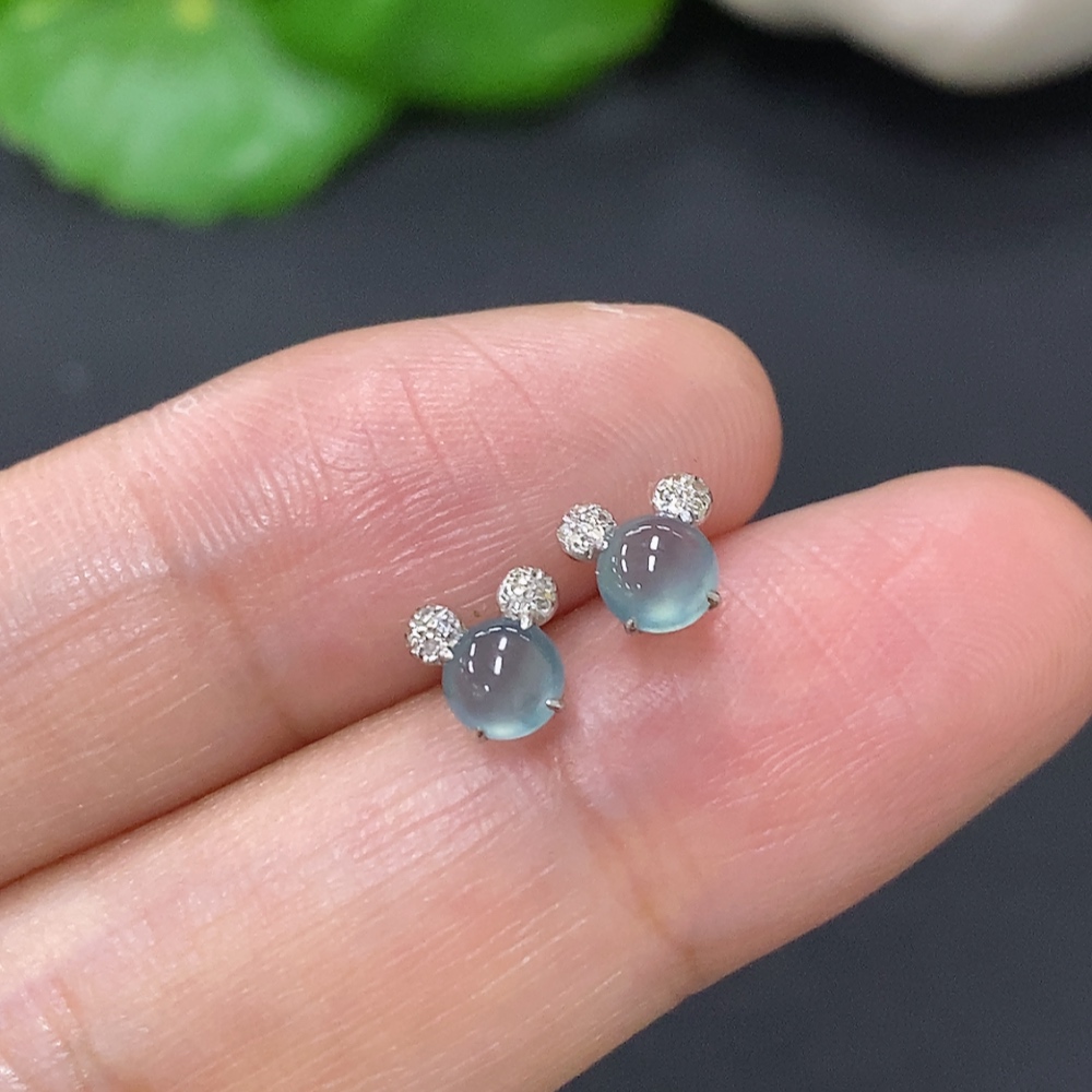 Jadeite cabochon ear studs in 18K gold, total weight approximately 0.5g (excluding ear stoppers) with diamond accents