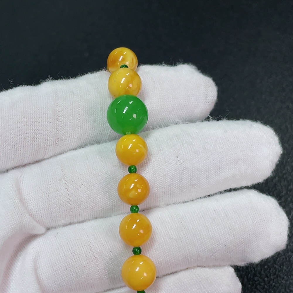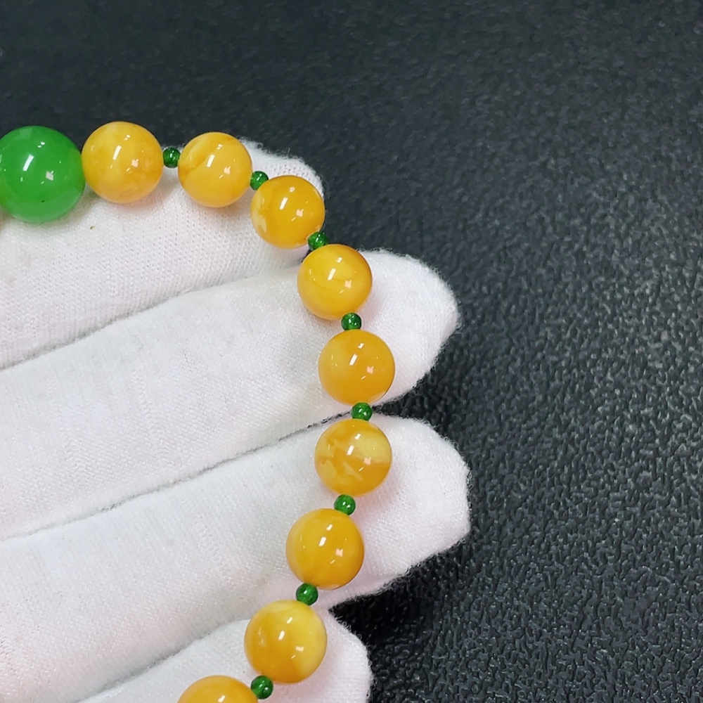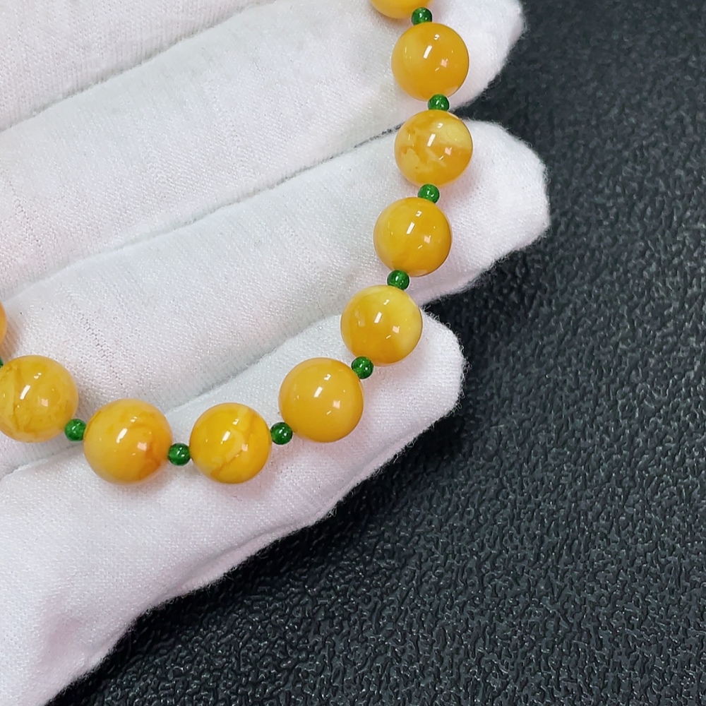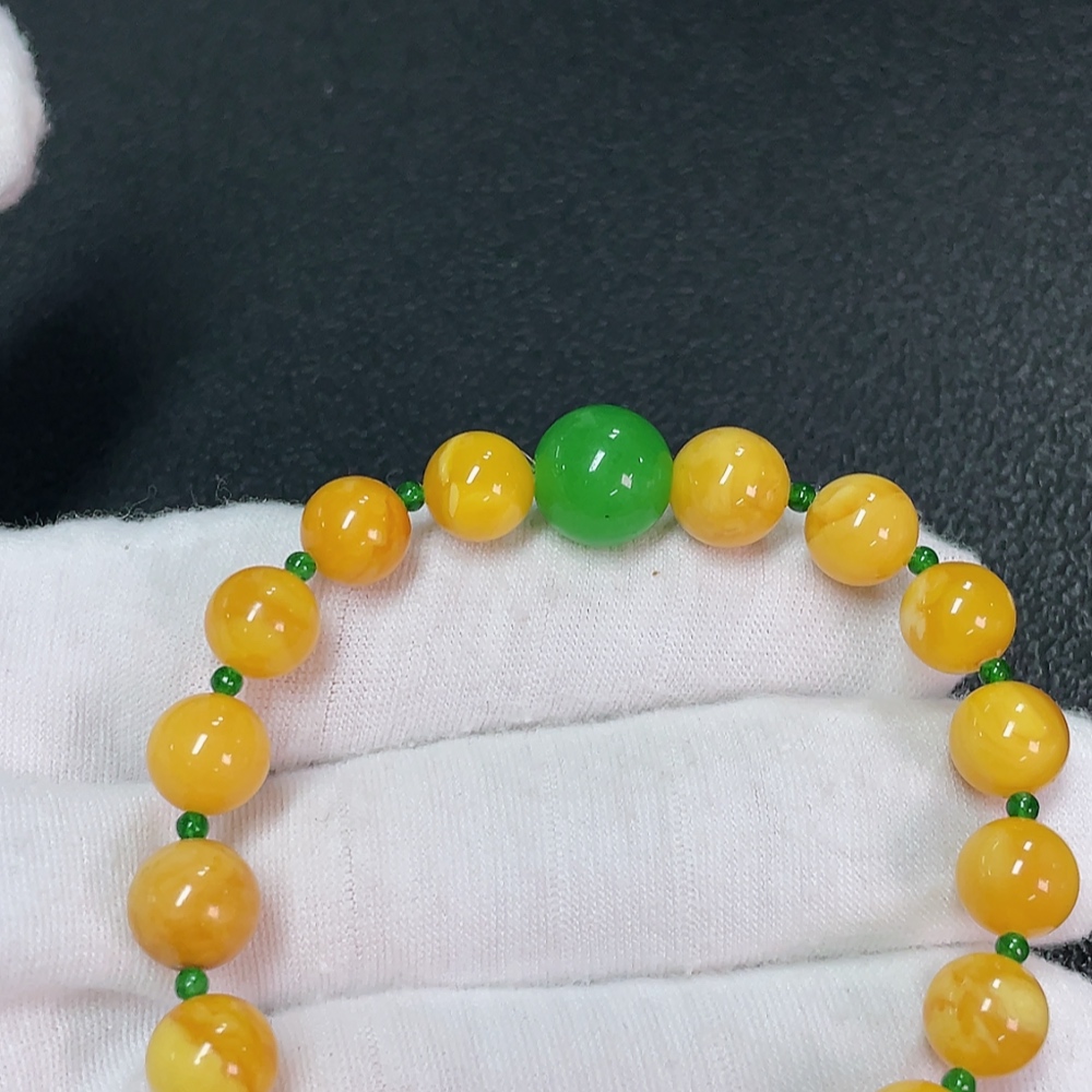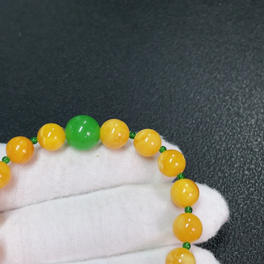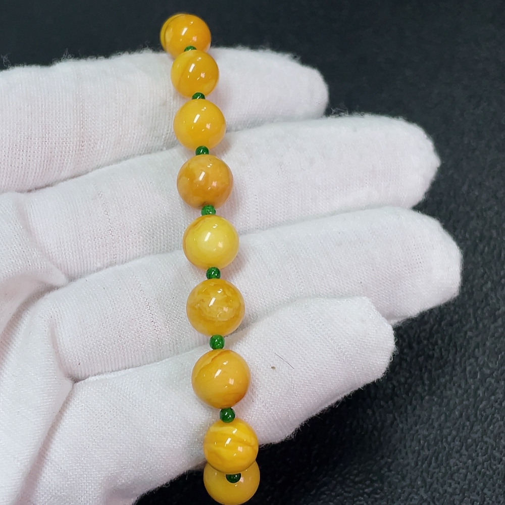 Amber Beeswax Bracelet with Green Stones (Possibly Non-Natural), Total Weight Approx. 7.65g, Size About 8.2mm