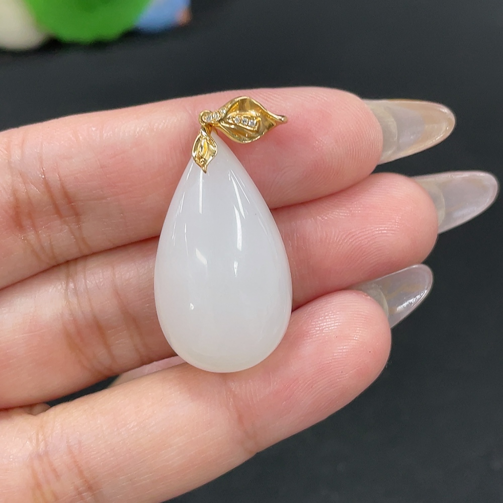 Hetian Jade Inlaid Pendant, Water Drop, Total Weight Approx. 7.4g, 18k Gold with Diamond Accents