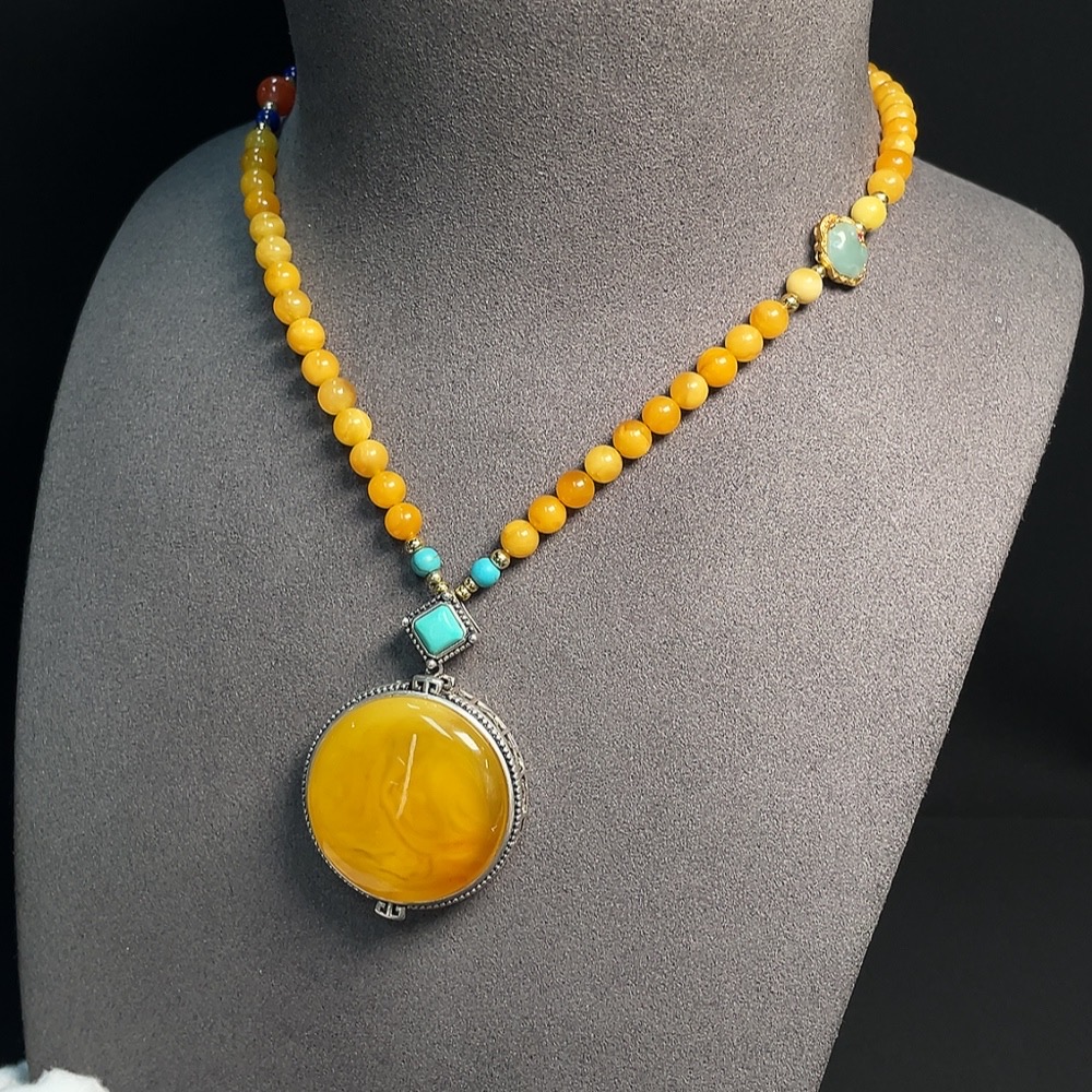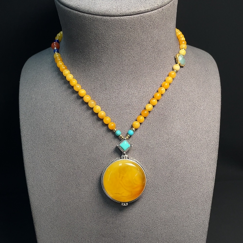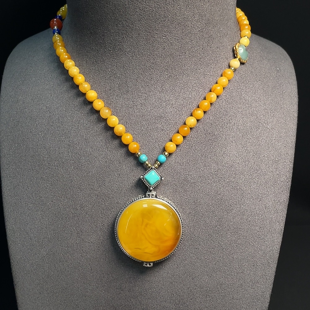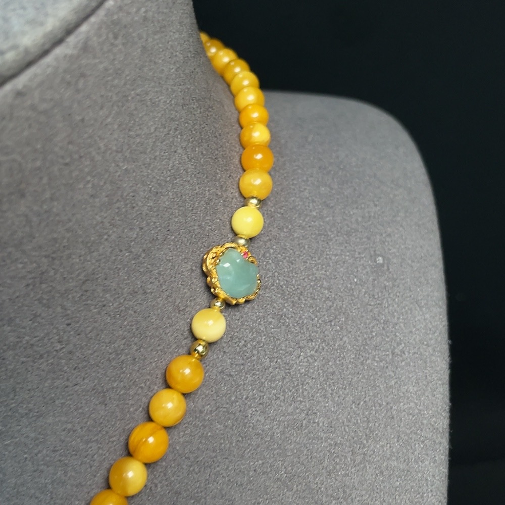 Amber Honey Wax Necklace Non-Gold Setting Total Weight Approx. 33.17g With Jadeite and Southern Red Visible Organic Matter Non-Natural Setting Stones Considered