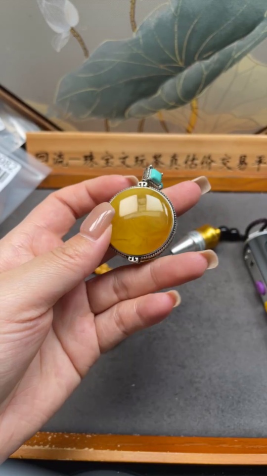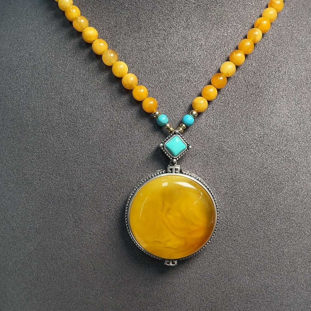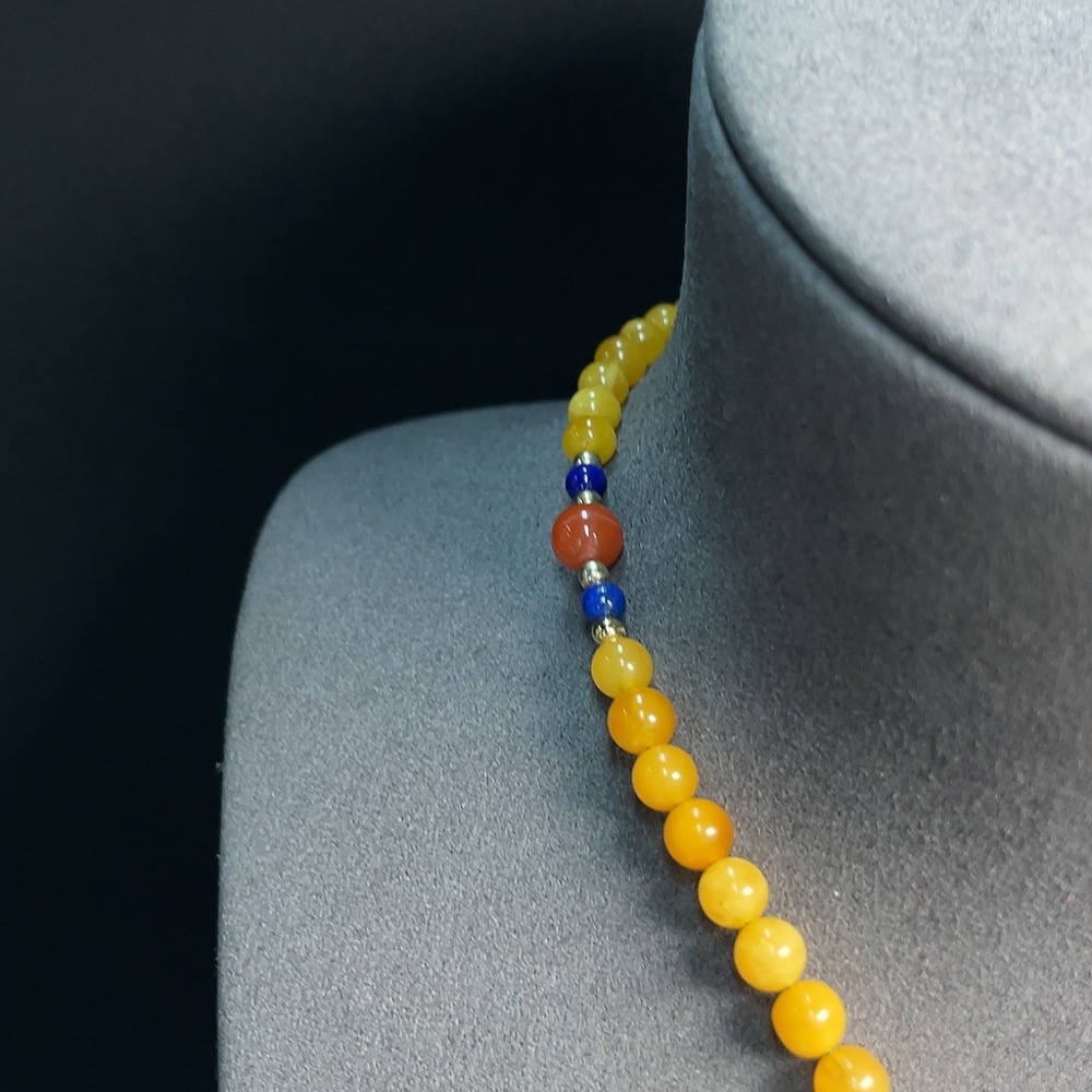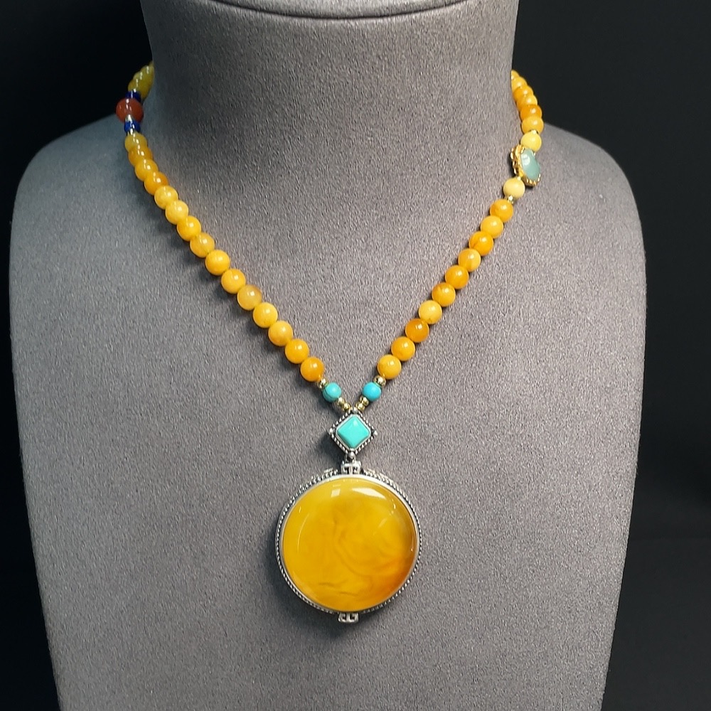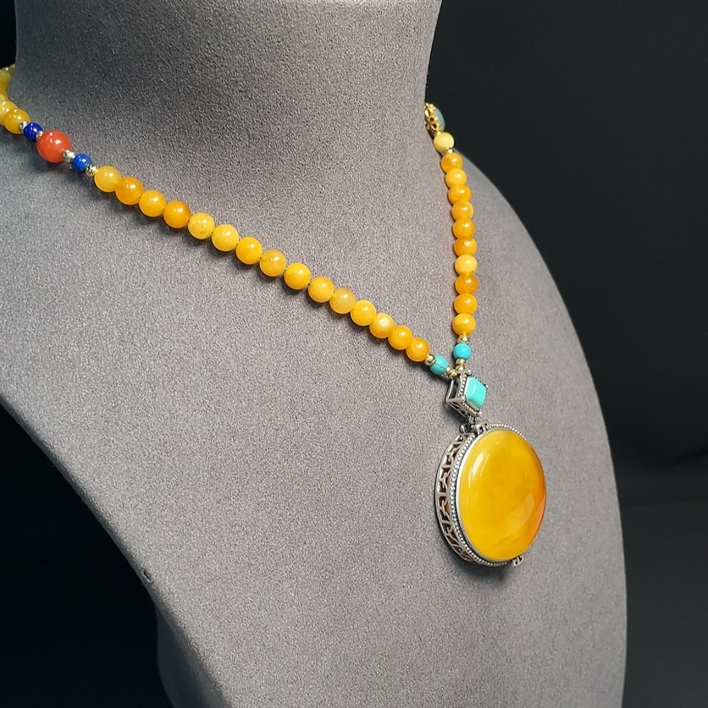 Amber Honey Wax Necklace Non-Gold Setting Total Weight Approx. 33.17g With Jadeite and Southern Red Visible Organic Matter Non-Natural Setting Stones Considered
