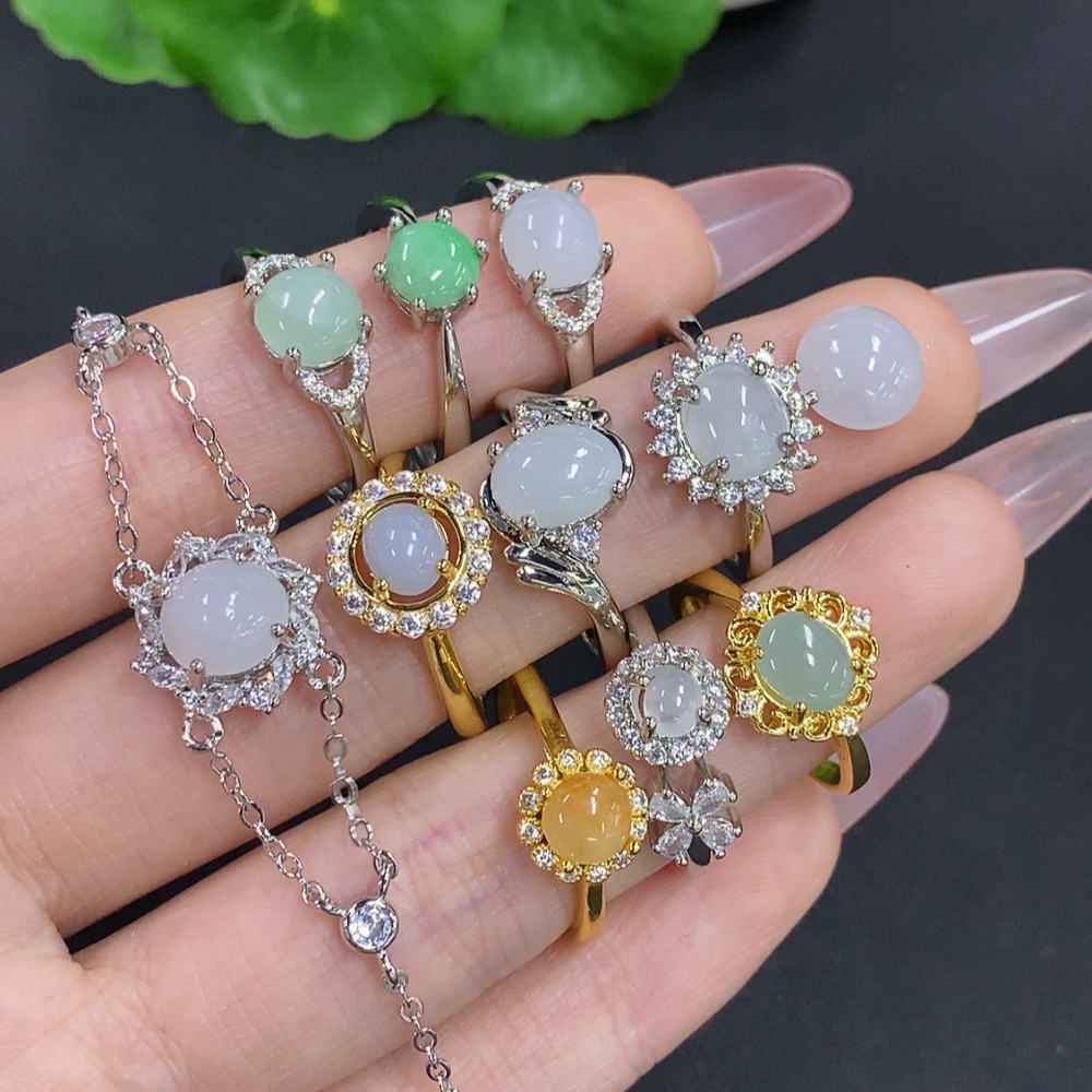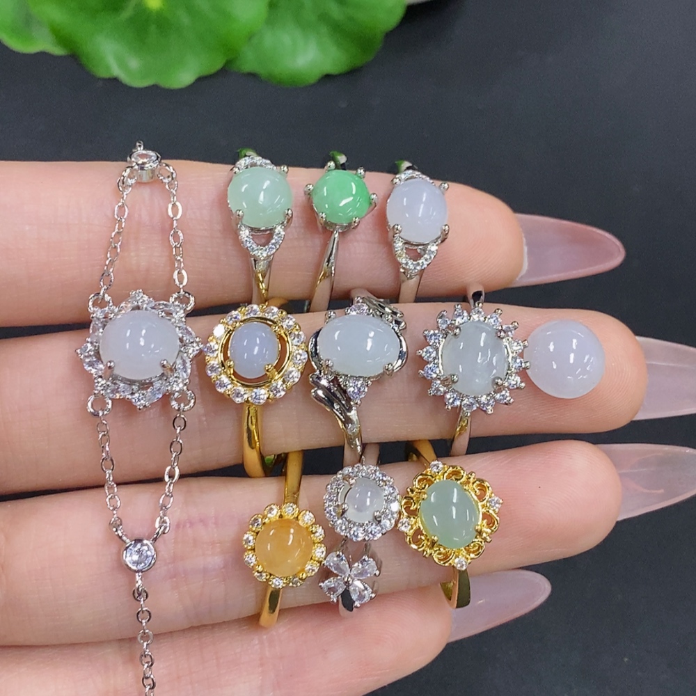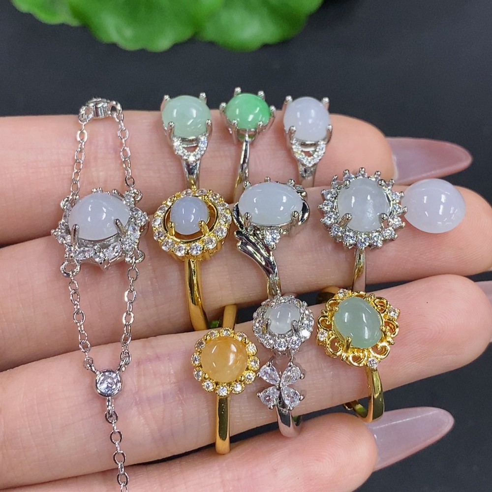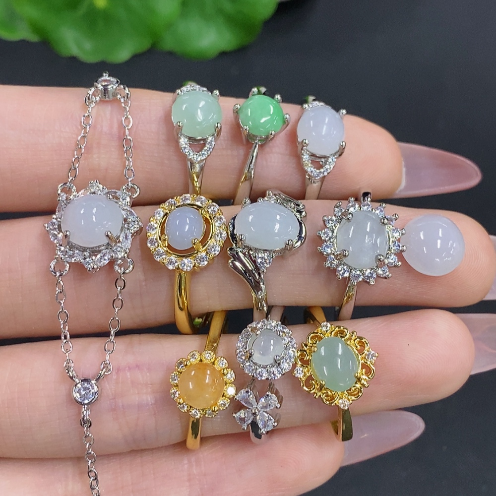 Jadeite Inlaid Bracelet with Ring and Cabochon Sell as a Lot Adjustable Size Non-Gold Inlaid