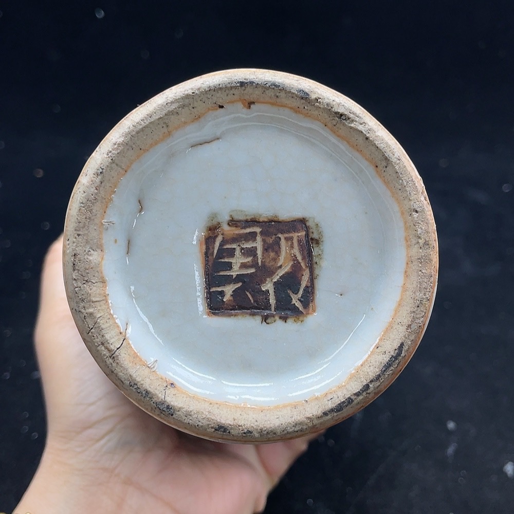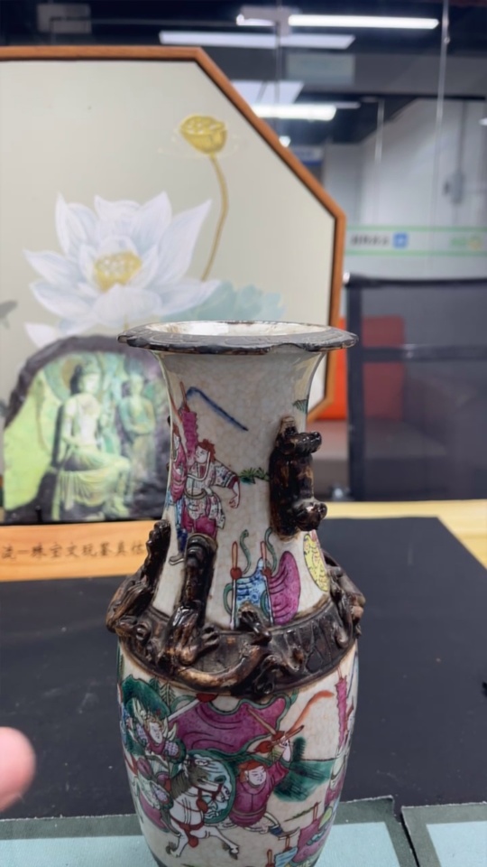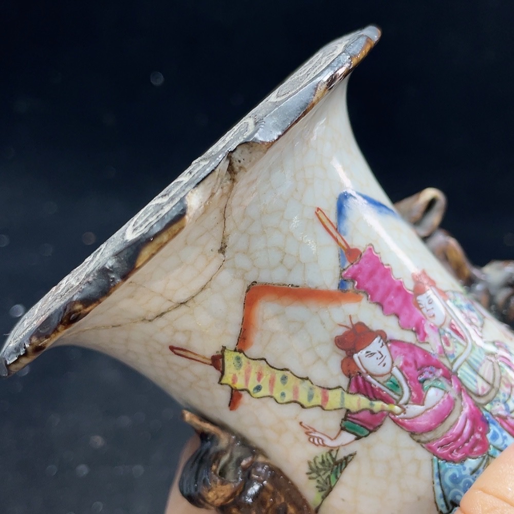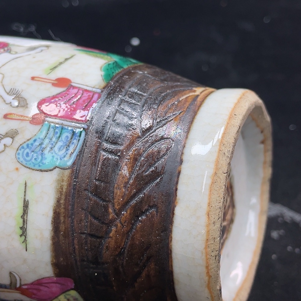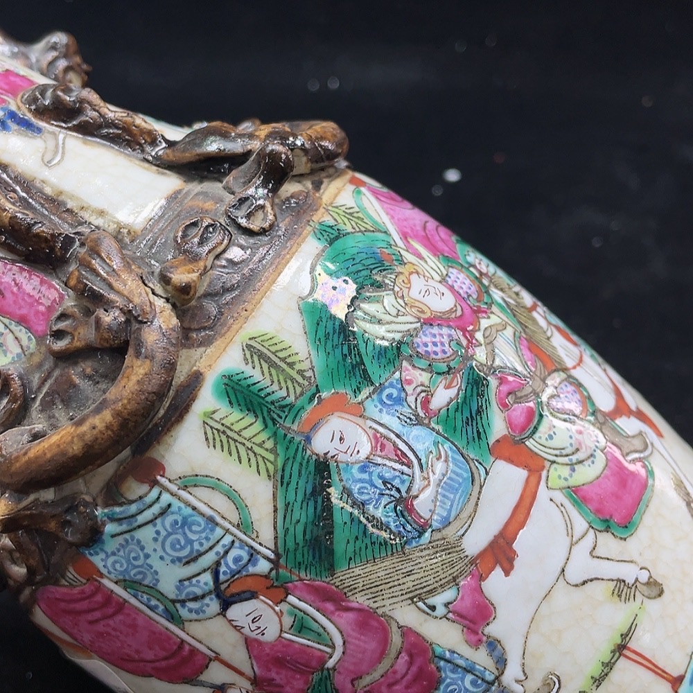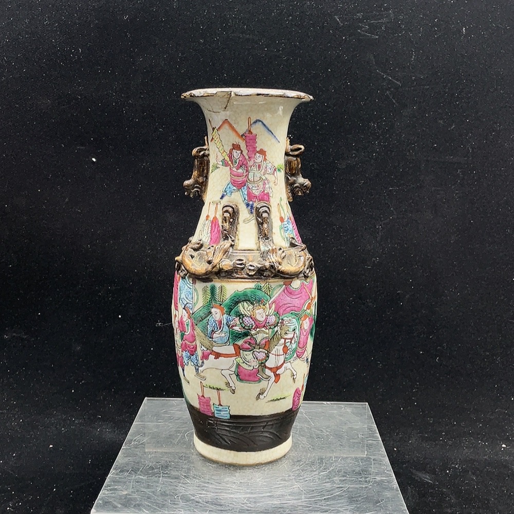 Porcelain Repaired Late Qing Dynasty Famille Rose Bottle with Warrior and Horse Figures