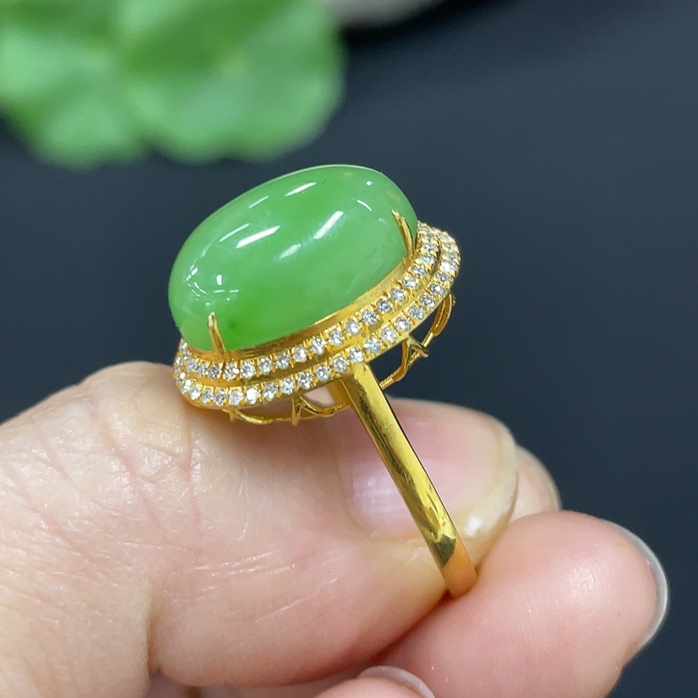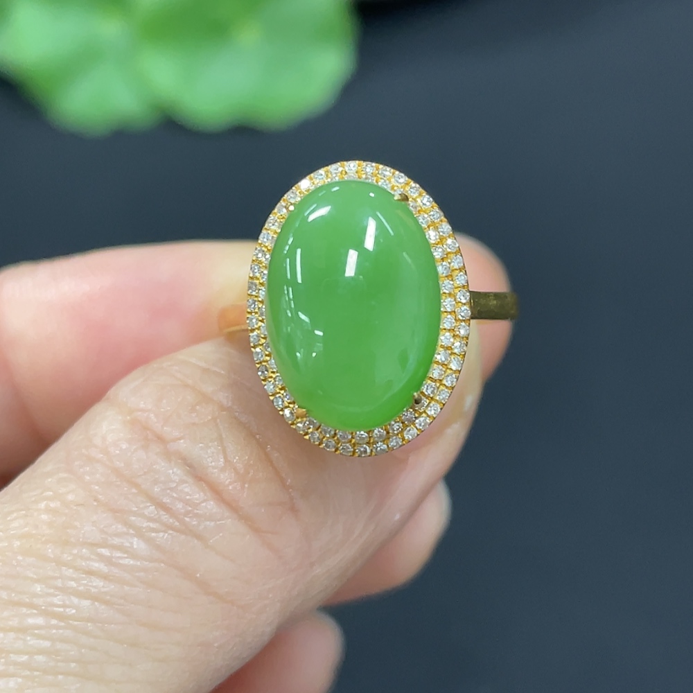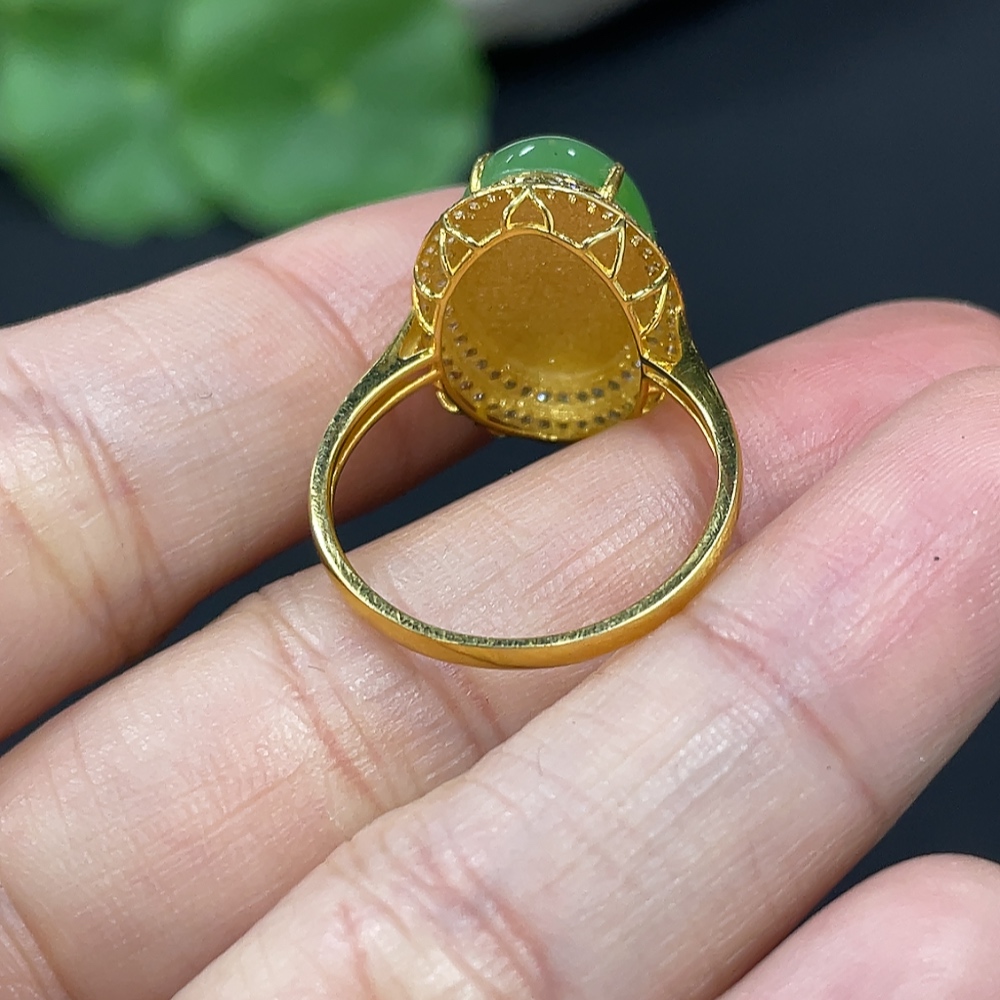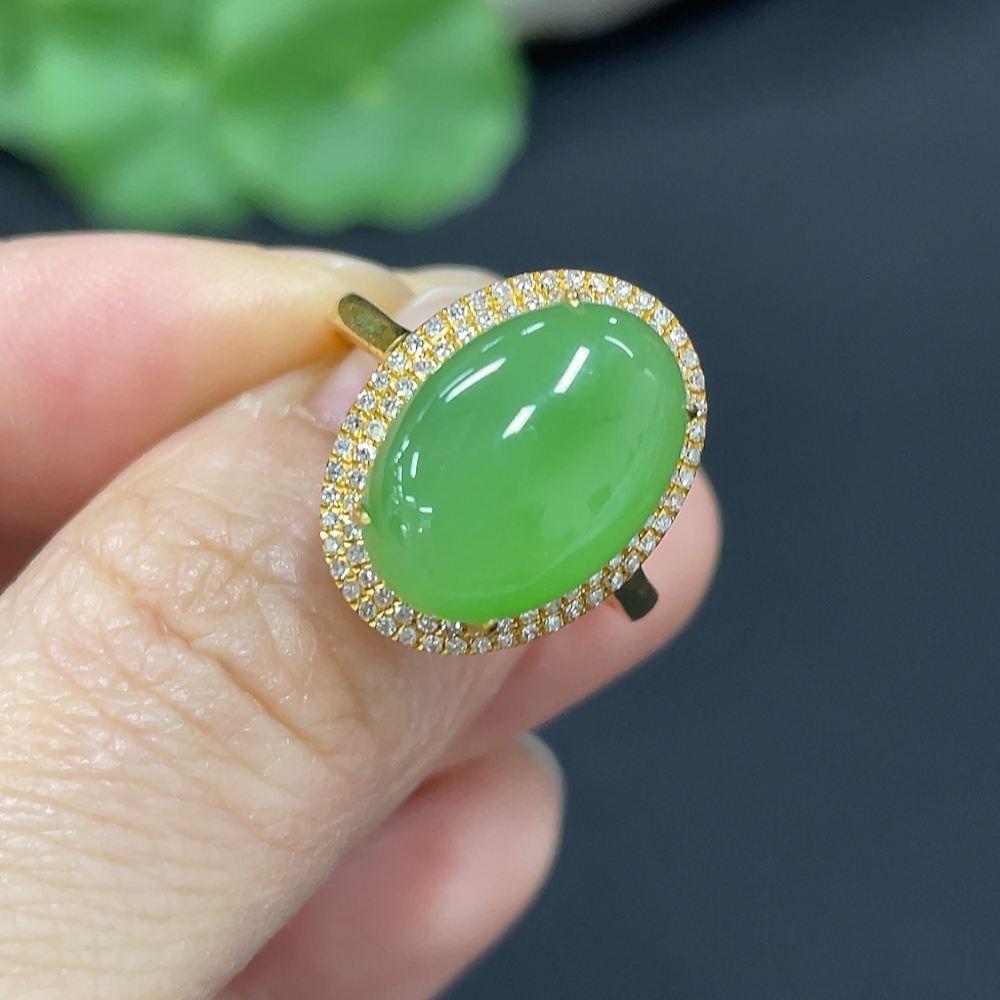 Hetian Jade Jasper Cabochon Inlaid Ring, 18k Gold, Size 15, Total Weight Approx. 2.8g, Diamond Accents