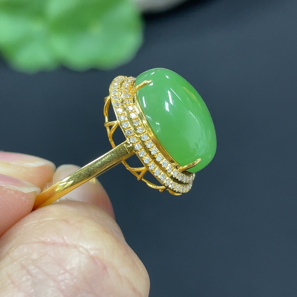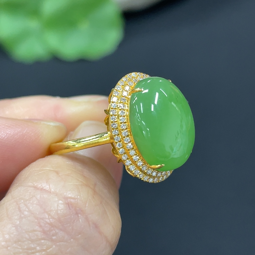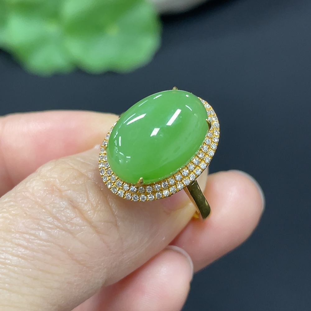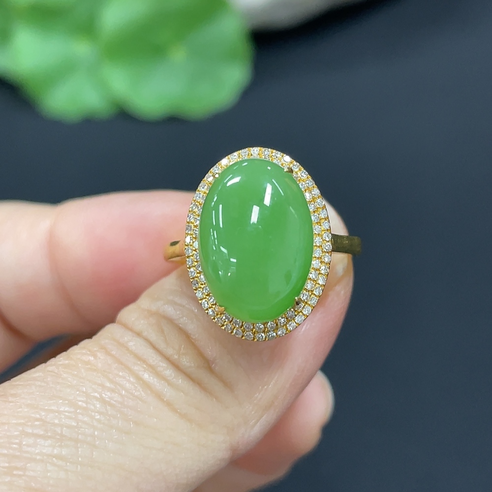 Hetian Jade Jasper Cabochon Inlaid Ring, 18k Gold, Size 15, Total Weight Approx. 2.8g, Diamond Accents