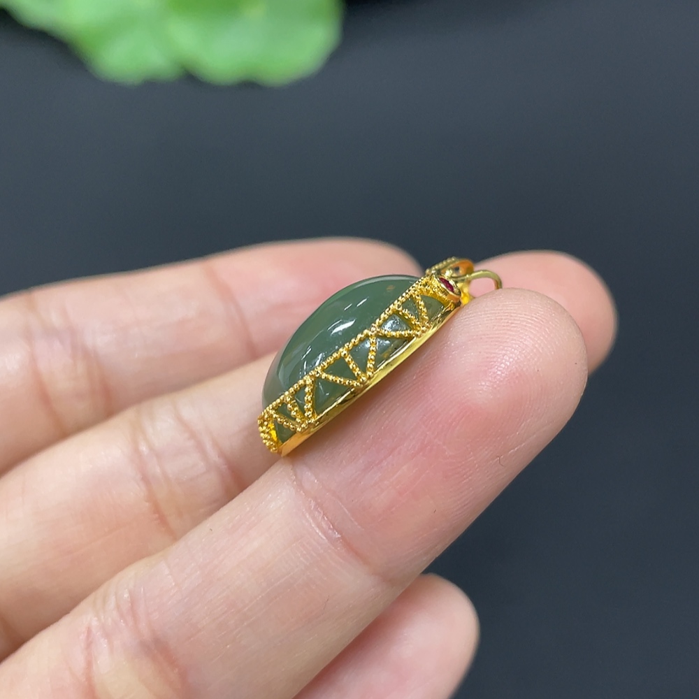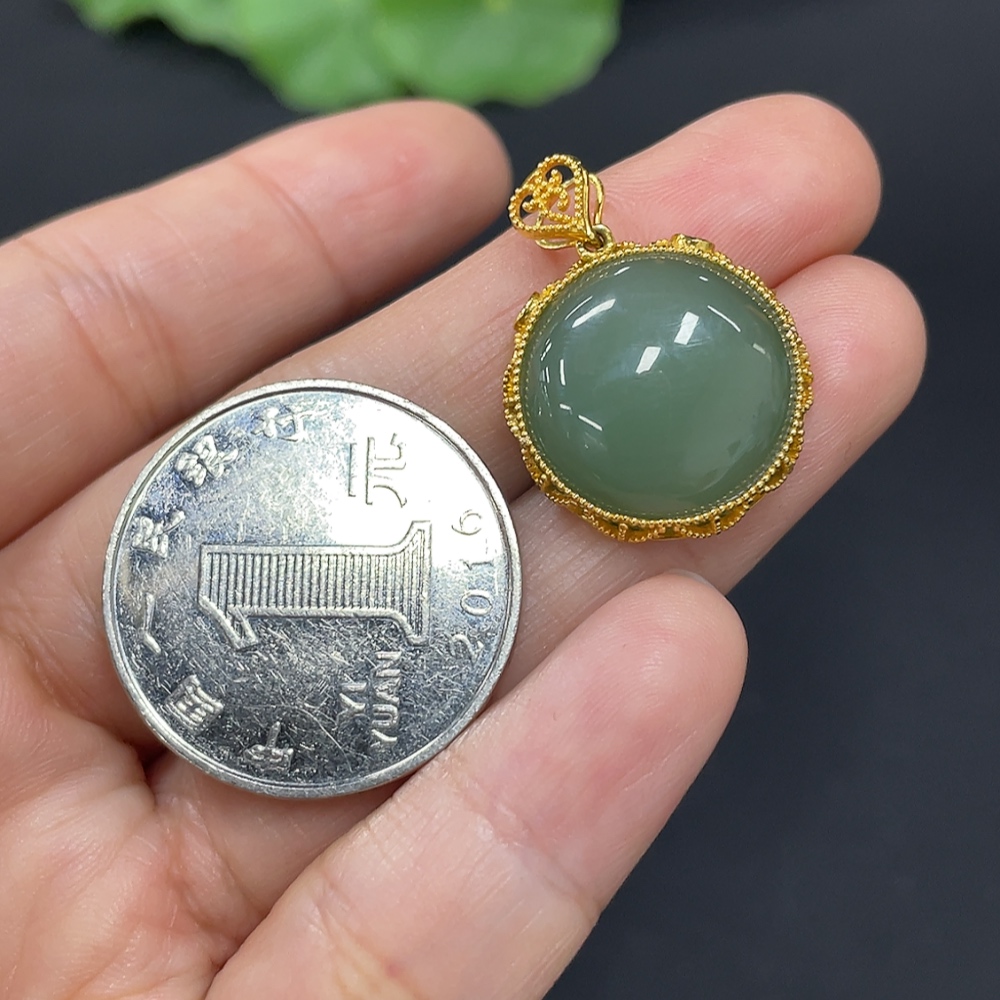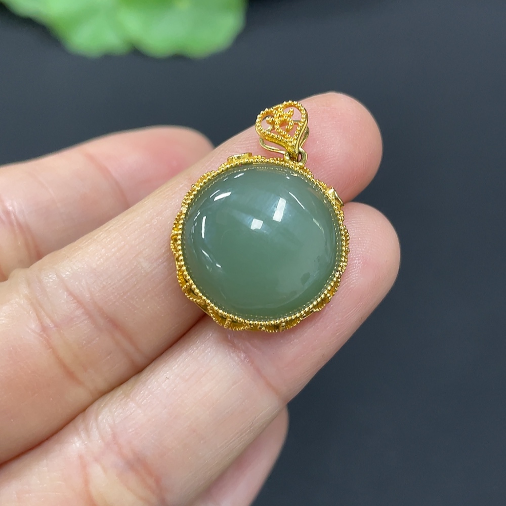 Hetian Jade Cabochon Pendant with 18K Gold, Total Weight Approx. 4.4g