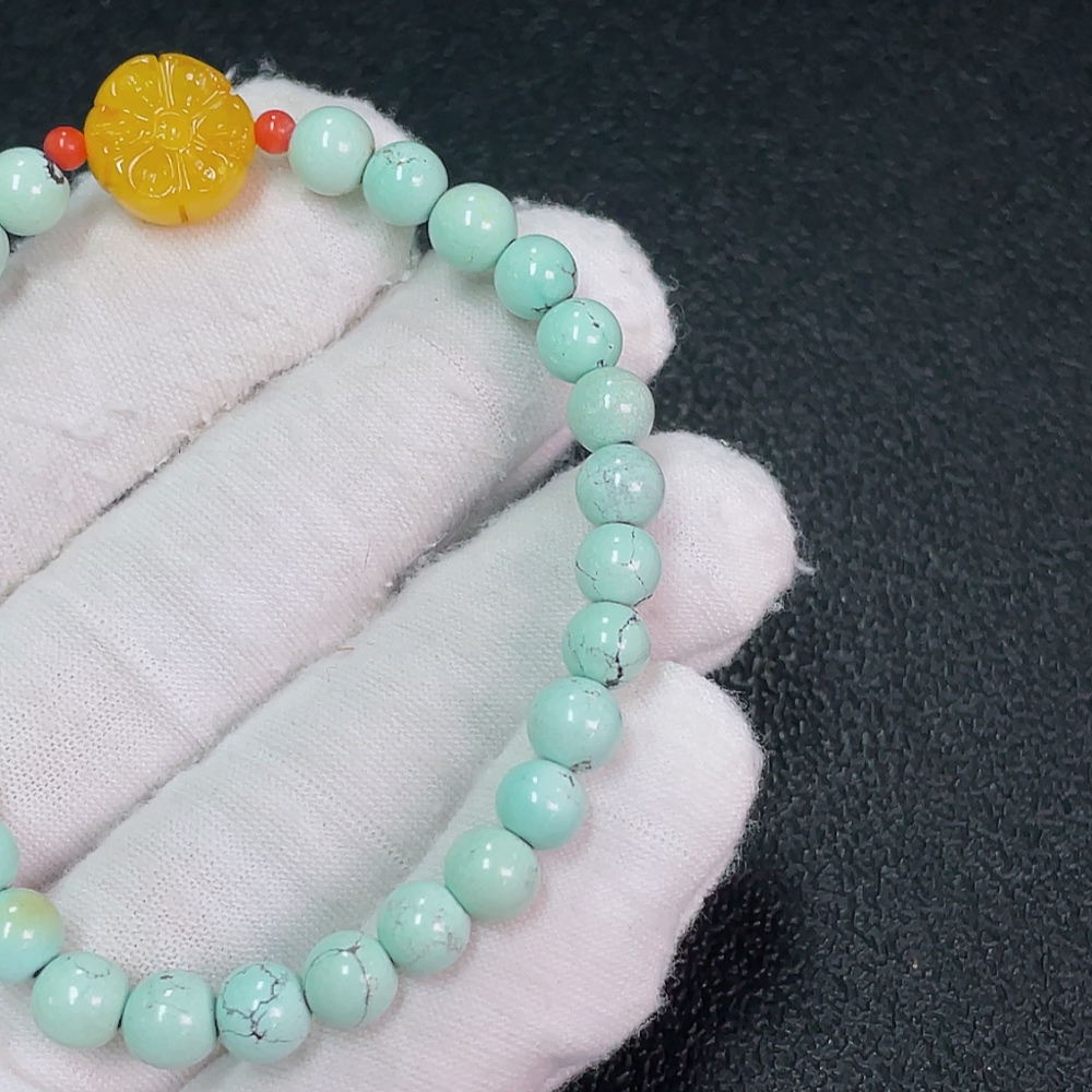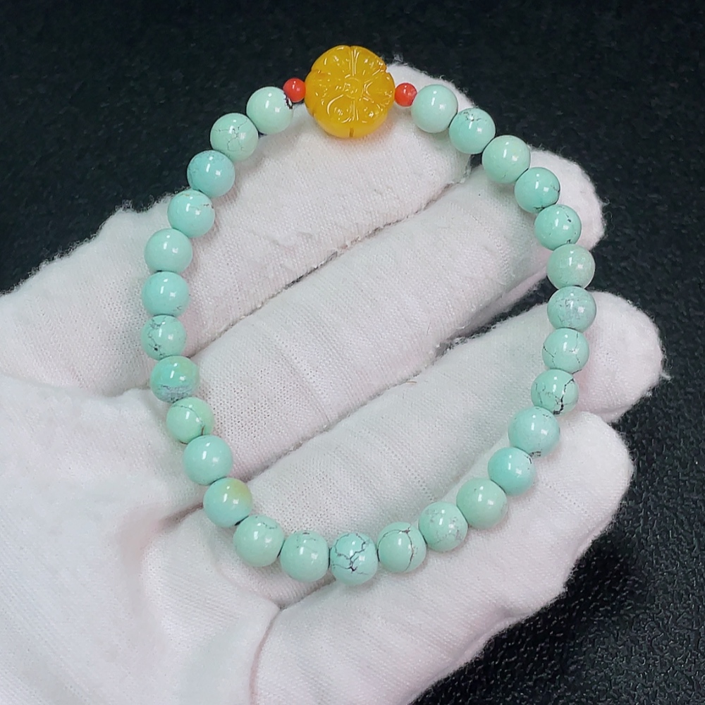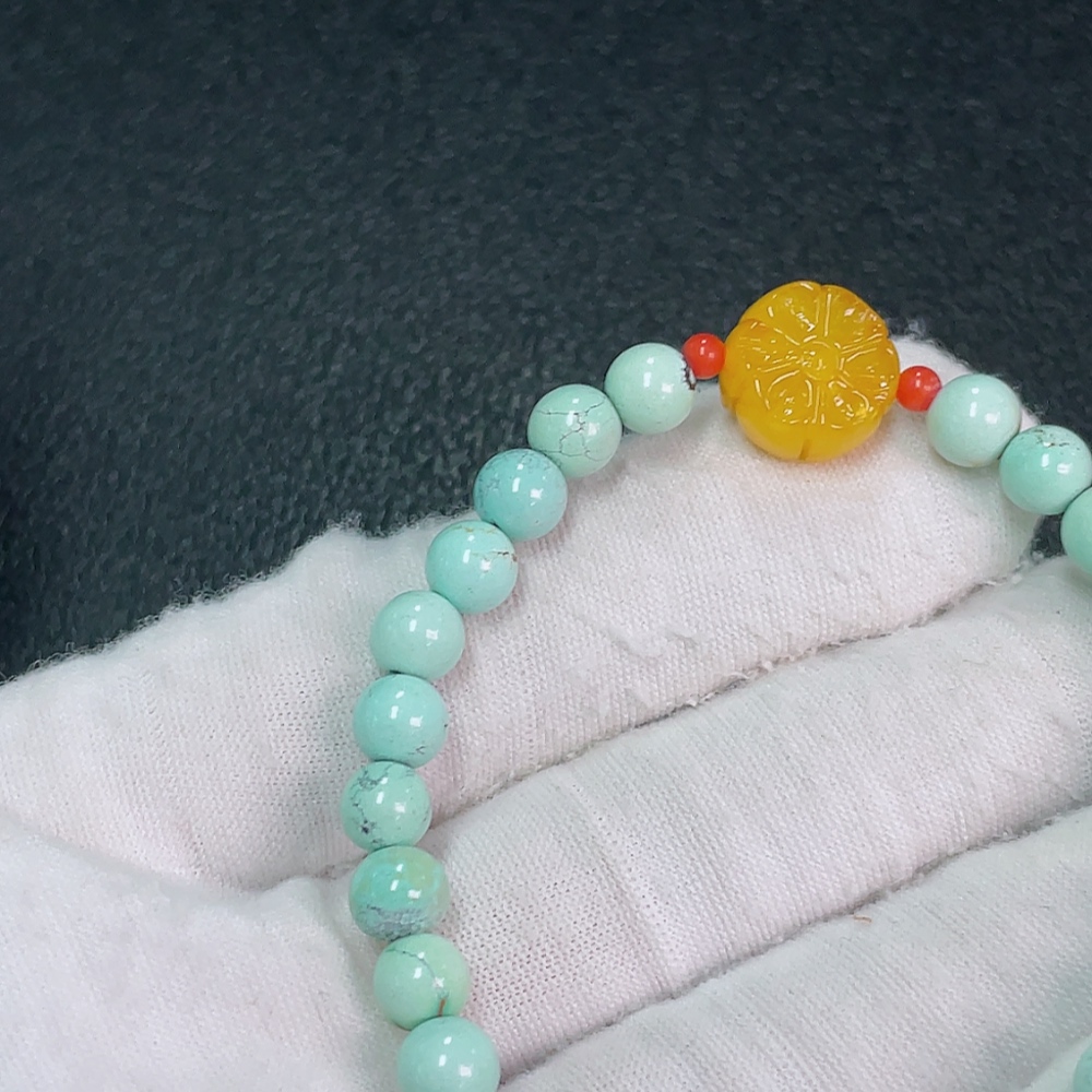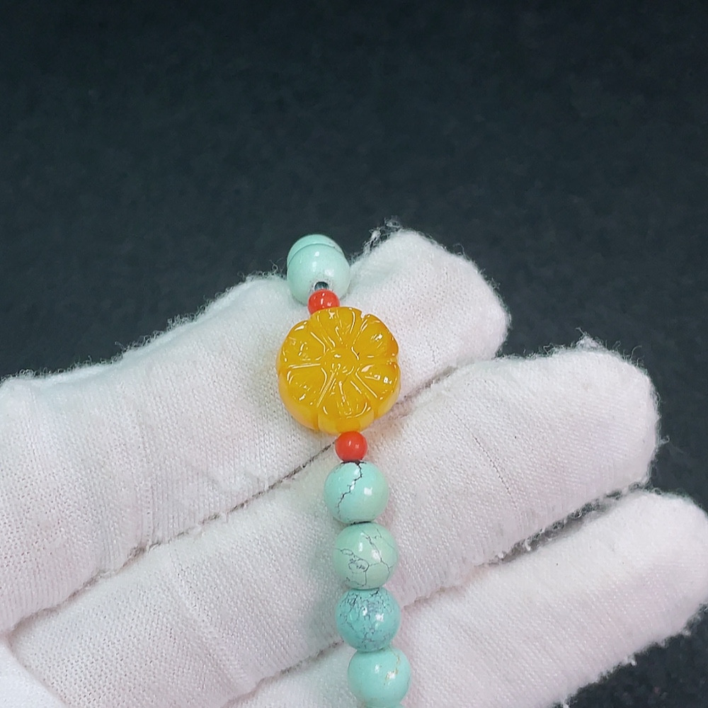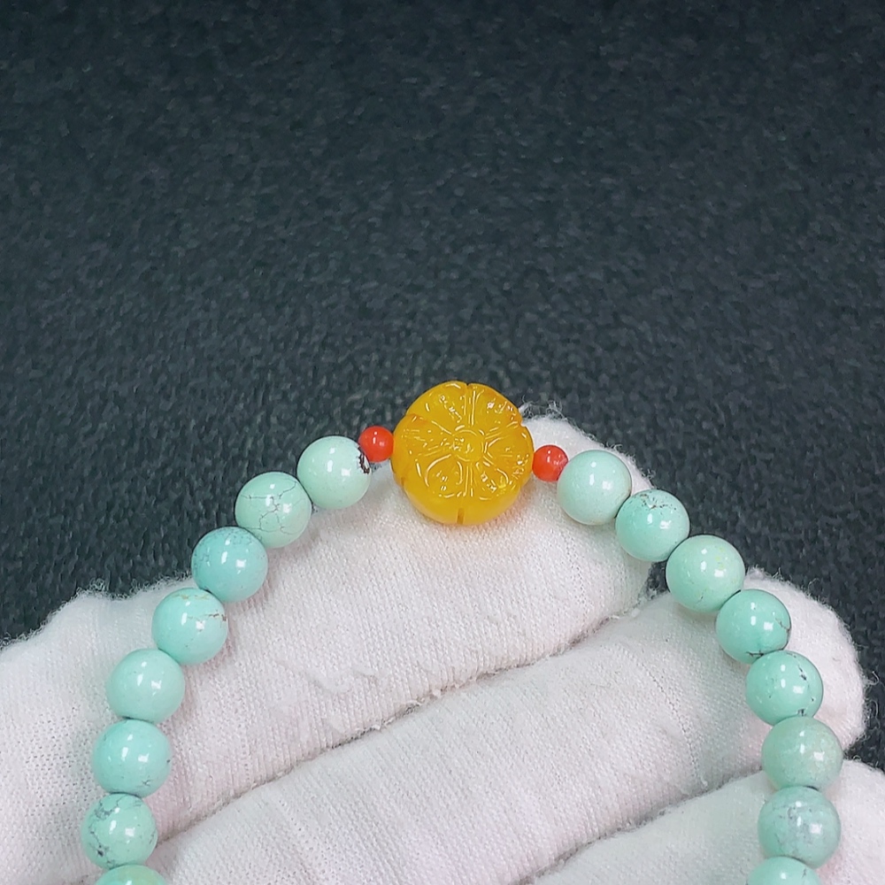 Amber Beeswax Bracelet with Colorless Coating, Turquoise, Other Mineral Inclusions + Southern Red Agate, Total Weight Approx. 8.21g, Size 11.7mm (Mineral-Included)