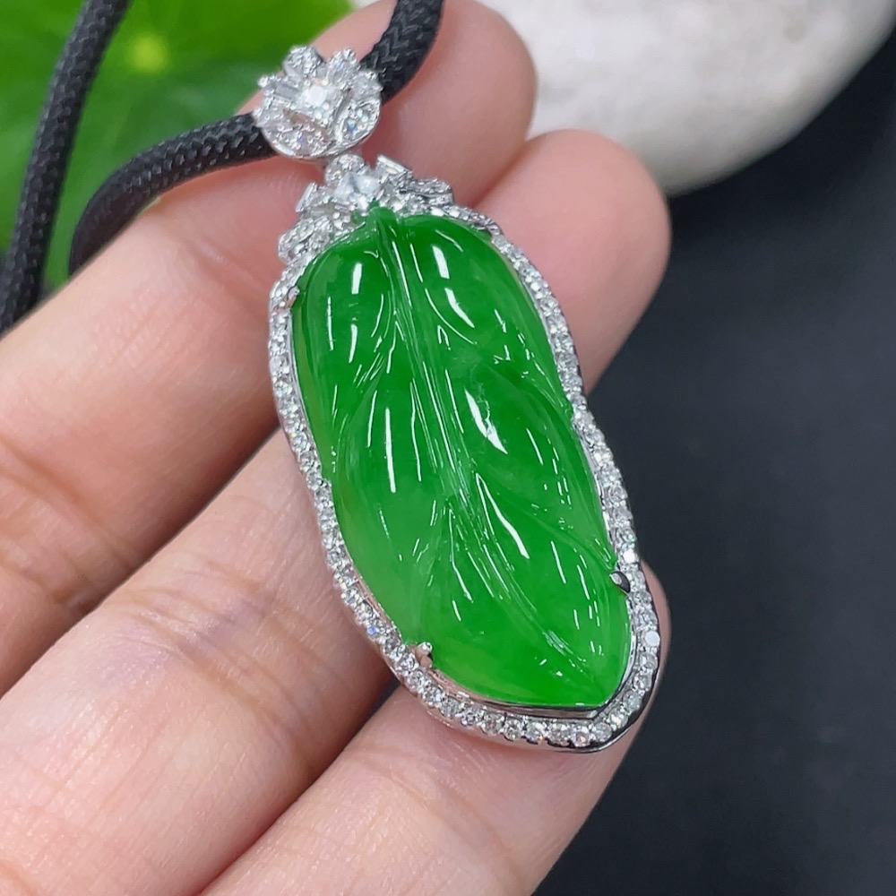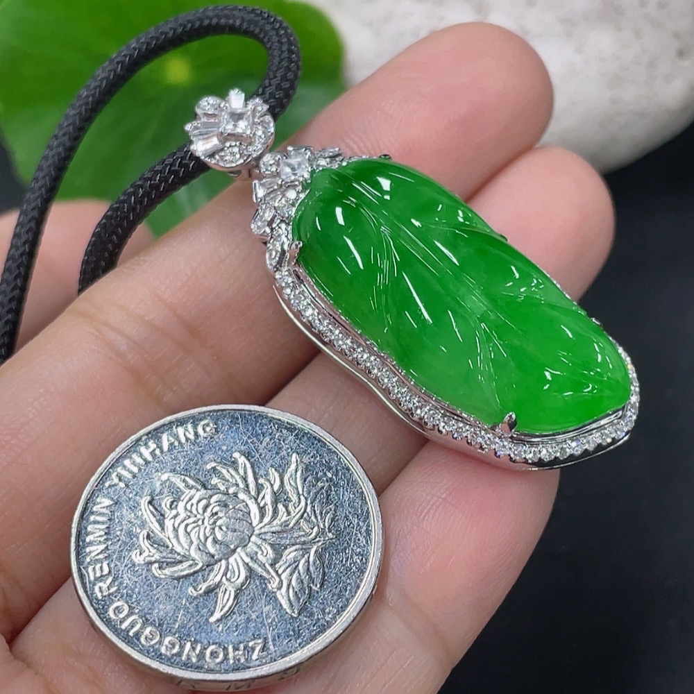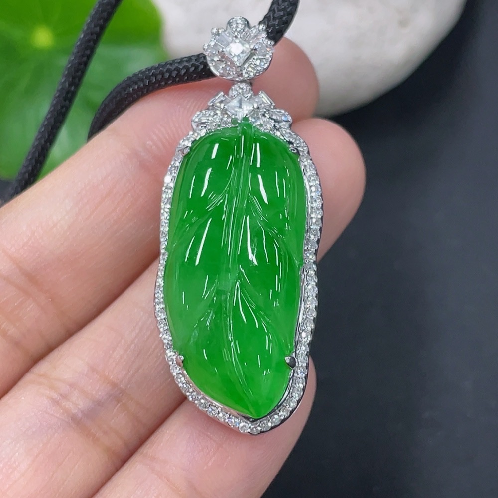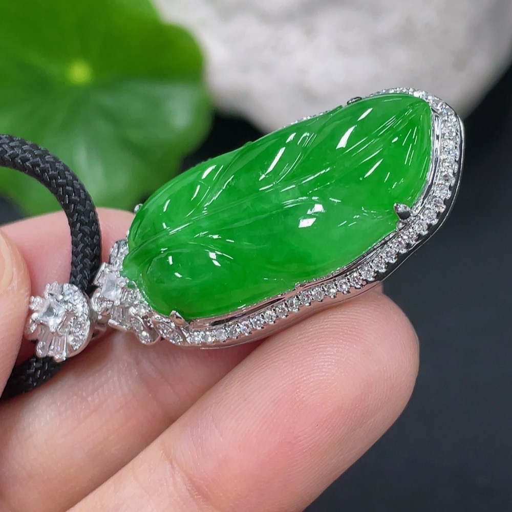 Jadeite inlaid leaf pendant, pendant 18k, the rest non-gold, diamond accents only on the main body (main body non-diamond quantity large 2 pieces small 2 pieces) total weight approx. including rope 15.6g